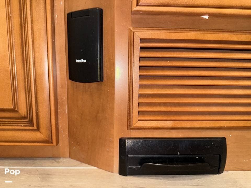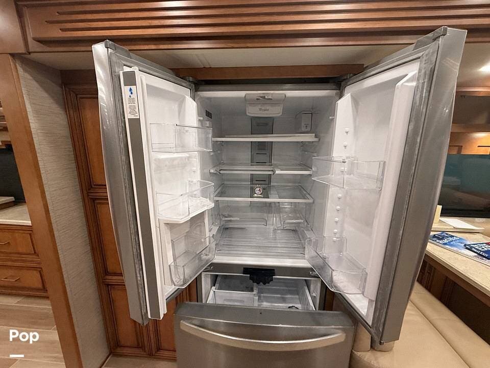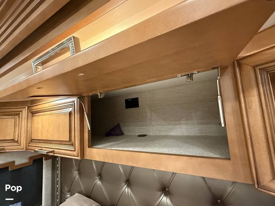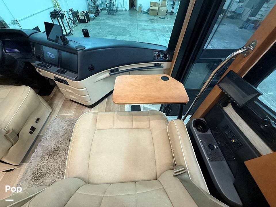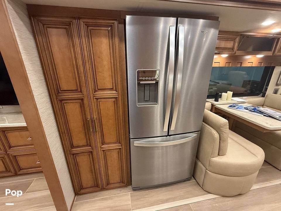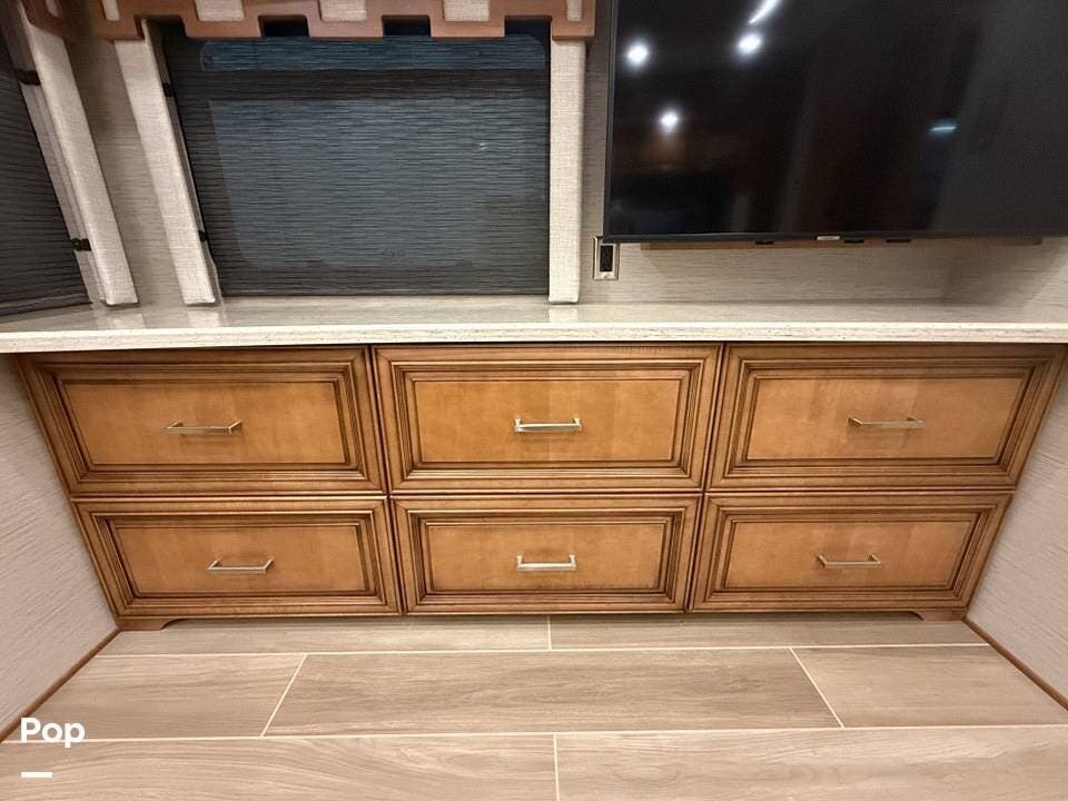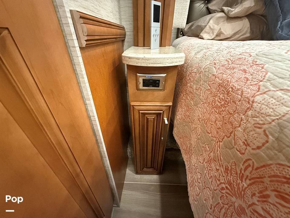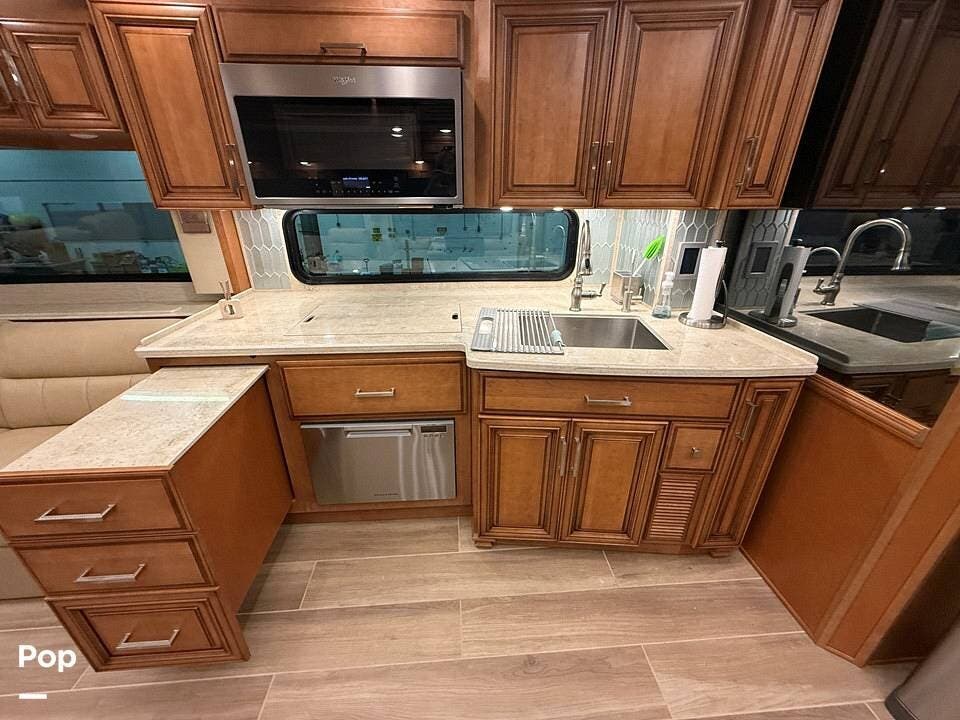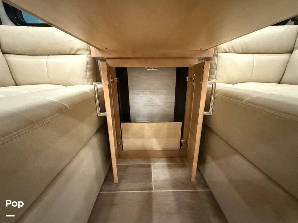 Inside, you'll find top-of-the-line residential features, including a full-sized French door refrigerator/freezer, a two-burner induction cooktop, a convection microwave oven, a large single-bowl sink, a dishwasher, a slide-out countertop extension with drawers, a pantry, a washer and dryer, and a built-in safe. Motion-powered shades and a basement-mounted refrigerator/freezer provide added convenience and storage flexibility for extended journeys.
