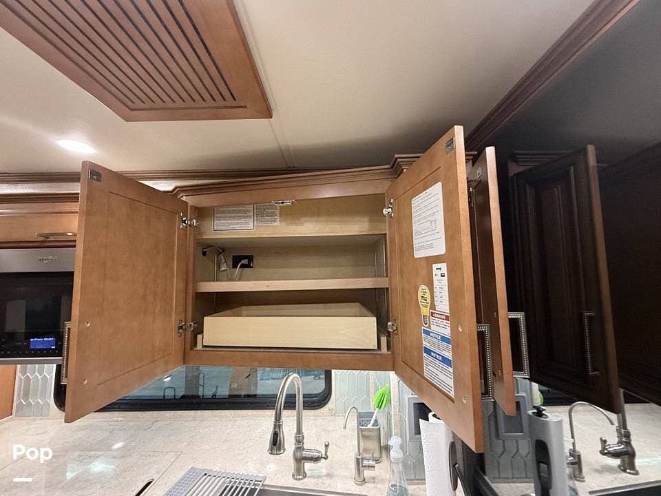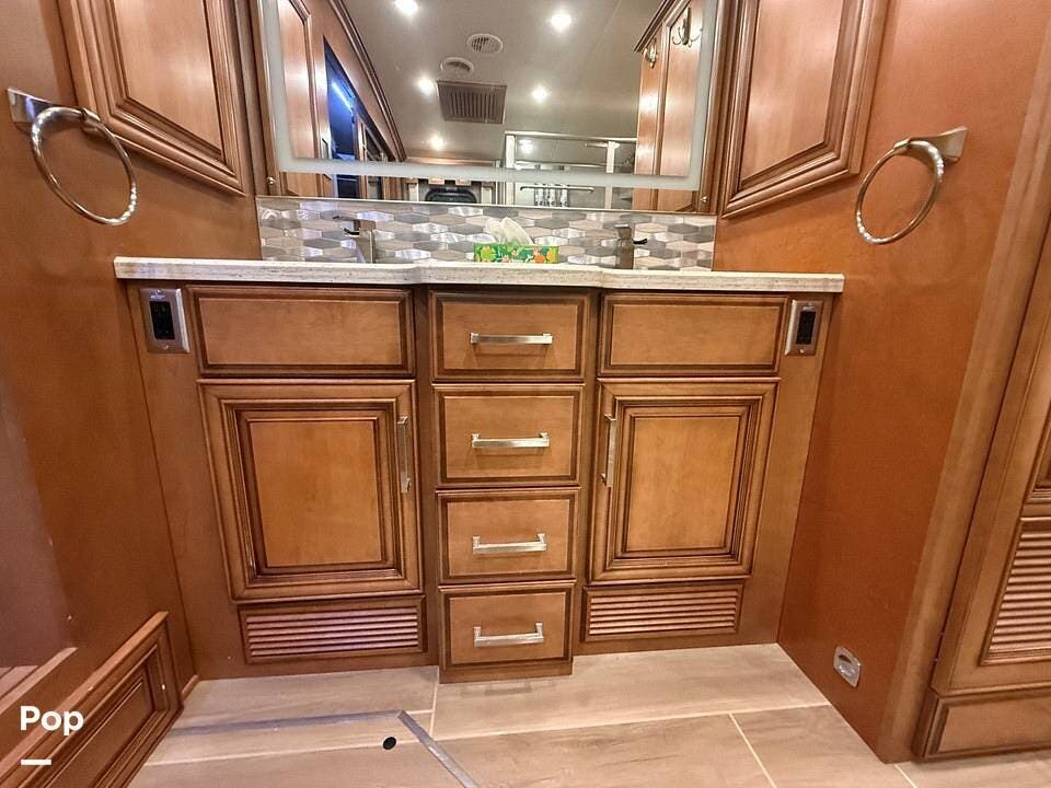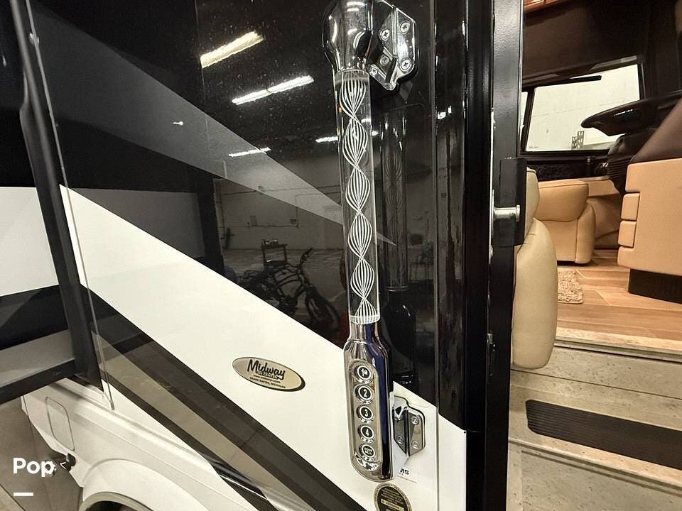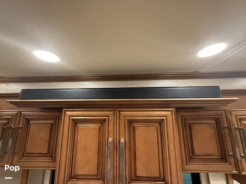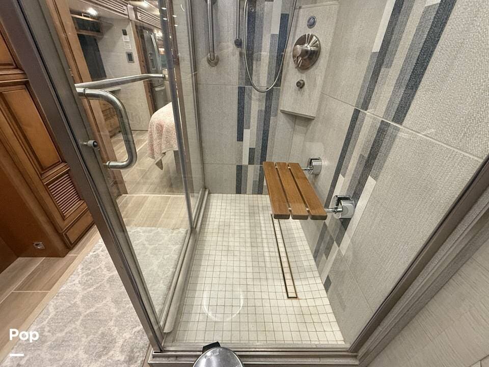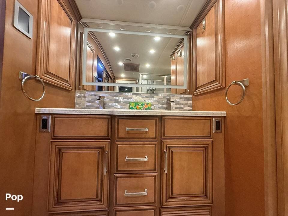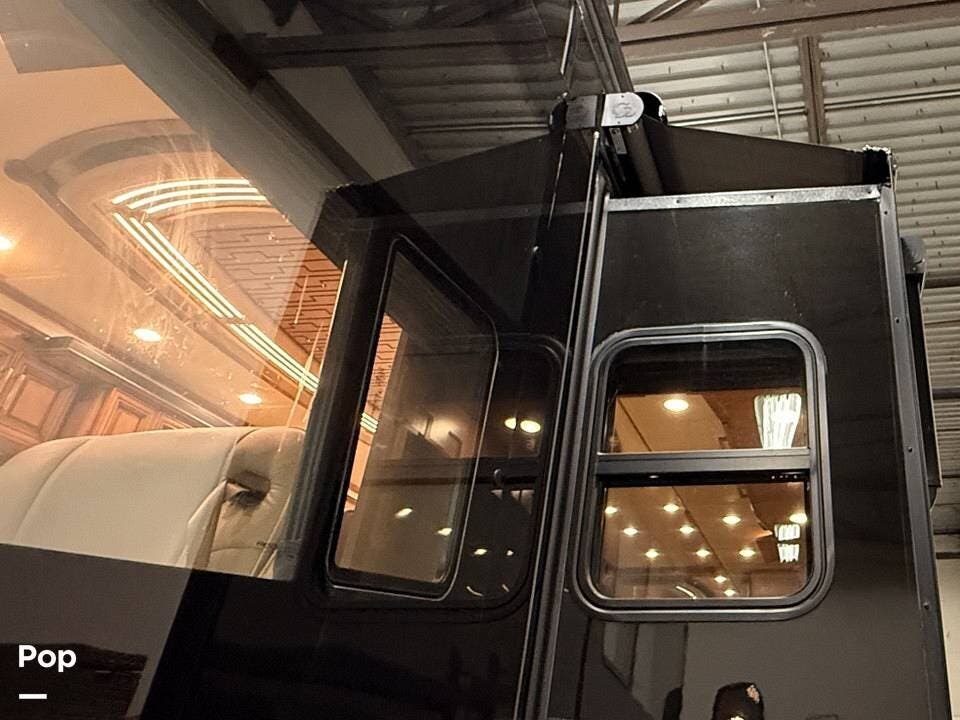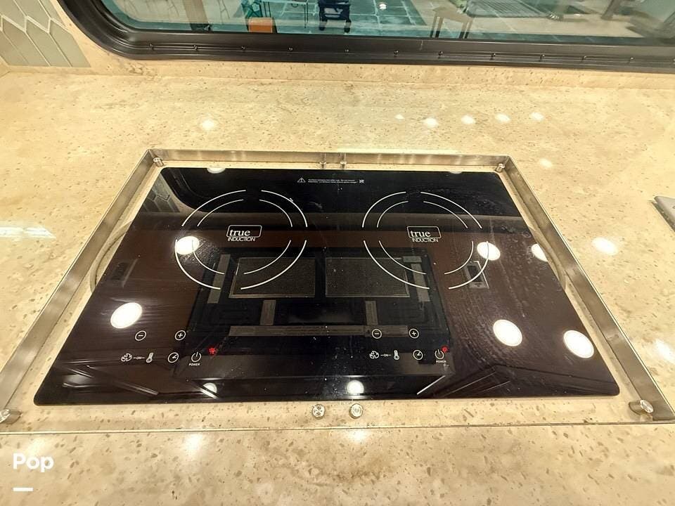 Inside, you'll find top-of-the-line residential features, including a full-sized French door refrigerator/freezer, a two-burner induction cooktop, a convection microwave oven, a large single-bowl sink, a dishwasher, a slide-out countertop extension with drawers, a pantry, a washer and dryer, and a built-in safe. Motion-powered shades and a basement-mounted refrigerator/freezer provide added convenience and storage flexibility for extended journeys.