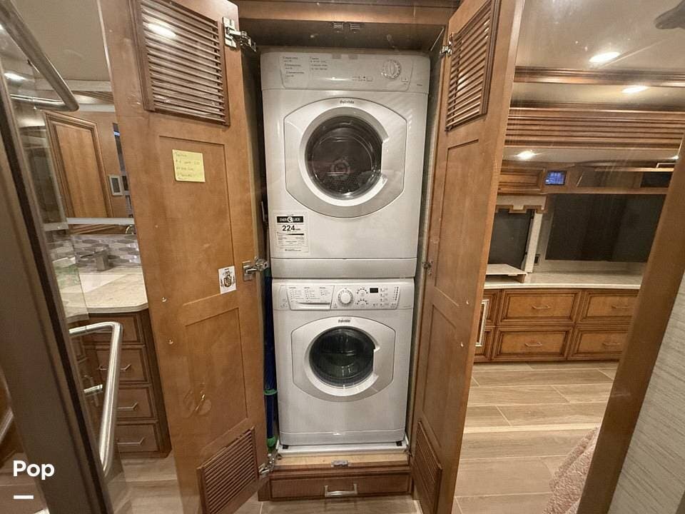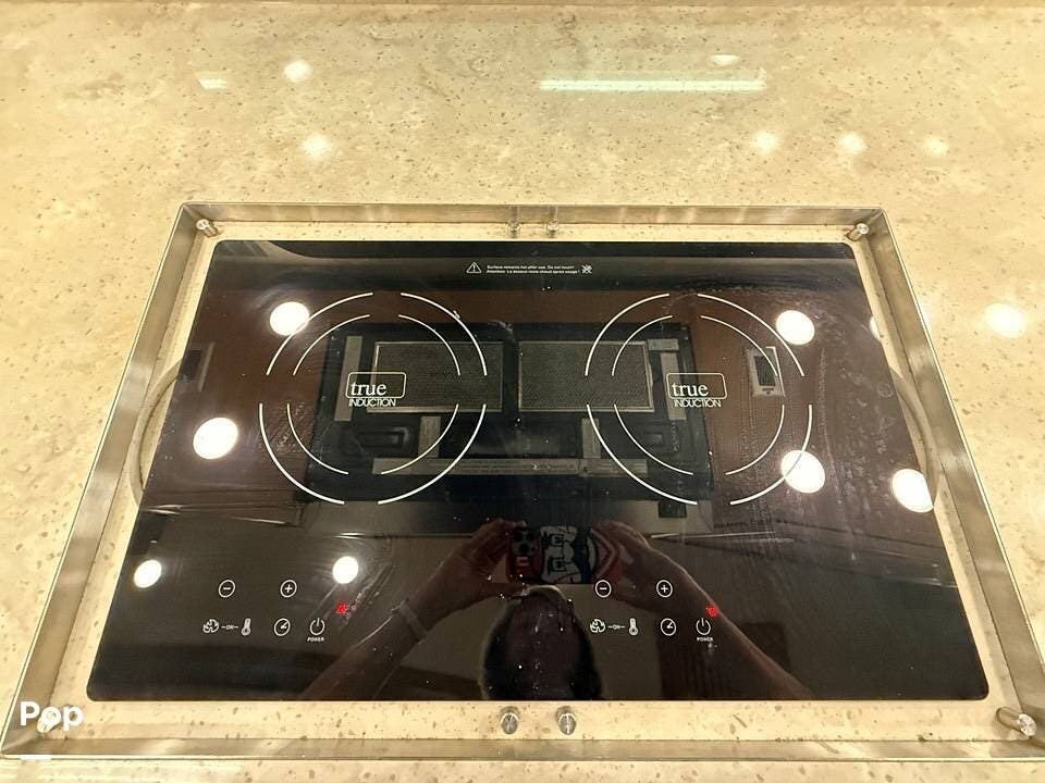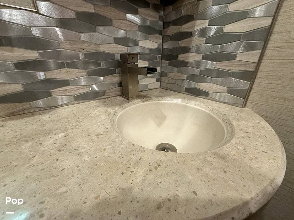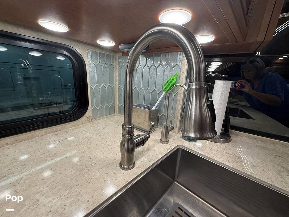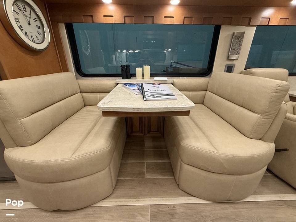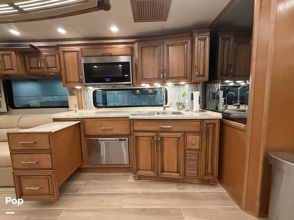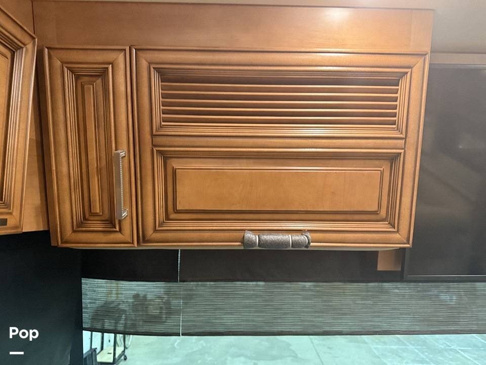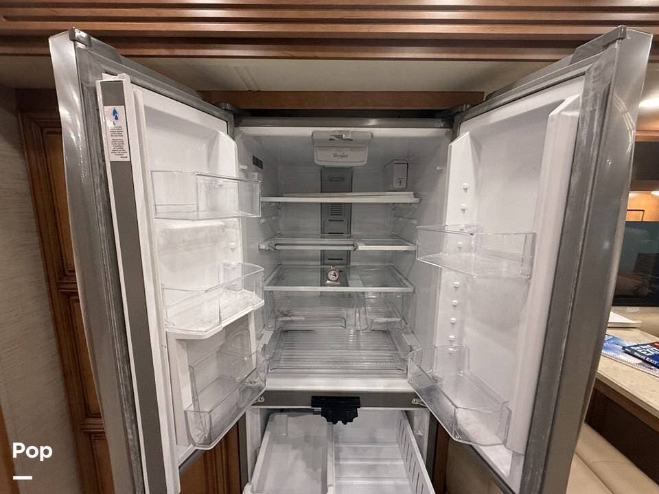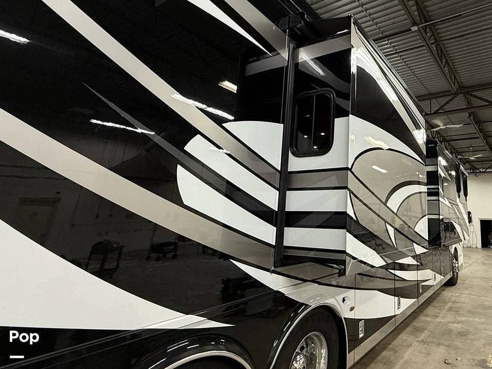 Inside, you'll find top-of-the-line residential features, including a full-sized French door refrigerator/freezer, a two-burner induction cooktop, a convection microwave oven, a large single-bowl sink, a dishwasher, a slide-out countertop extension with drawers, a pantry, a washer and dryer, and a built-in safe. Motion-powered shades and a basement-mounted refrigerator/freezer provide added convenience and storage flexibility for extended journeys.