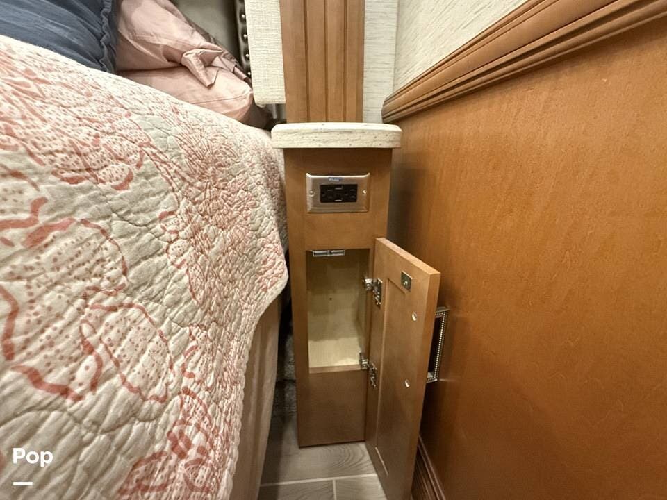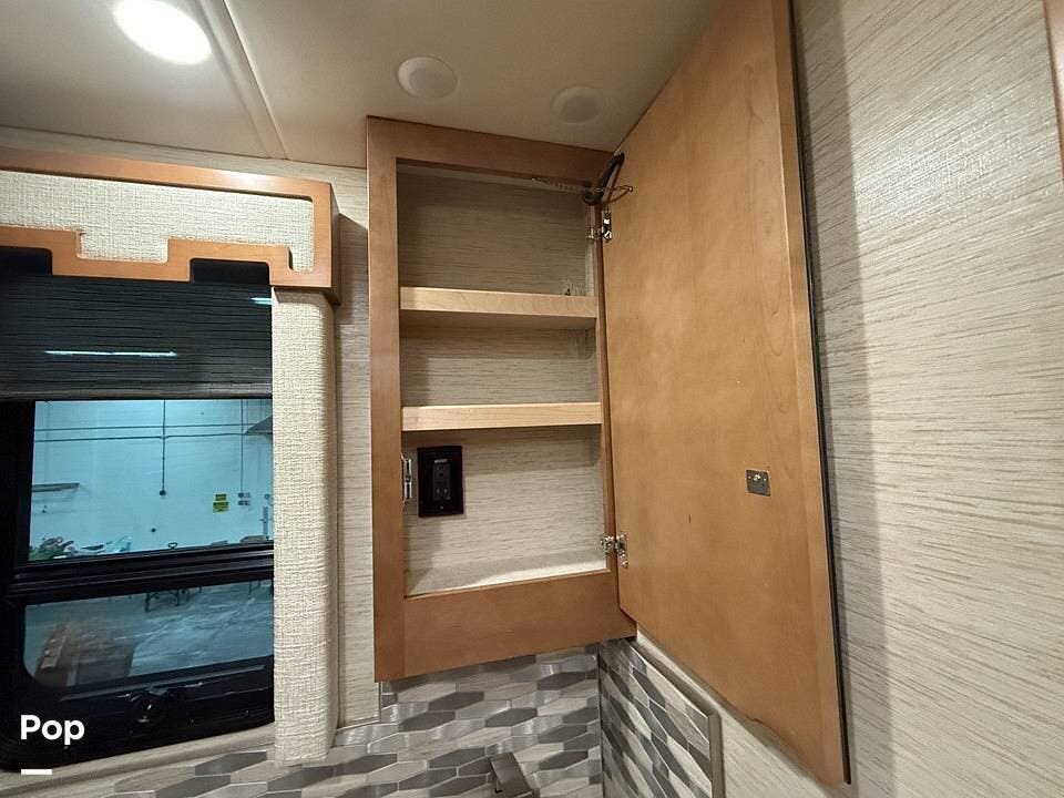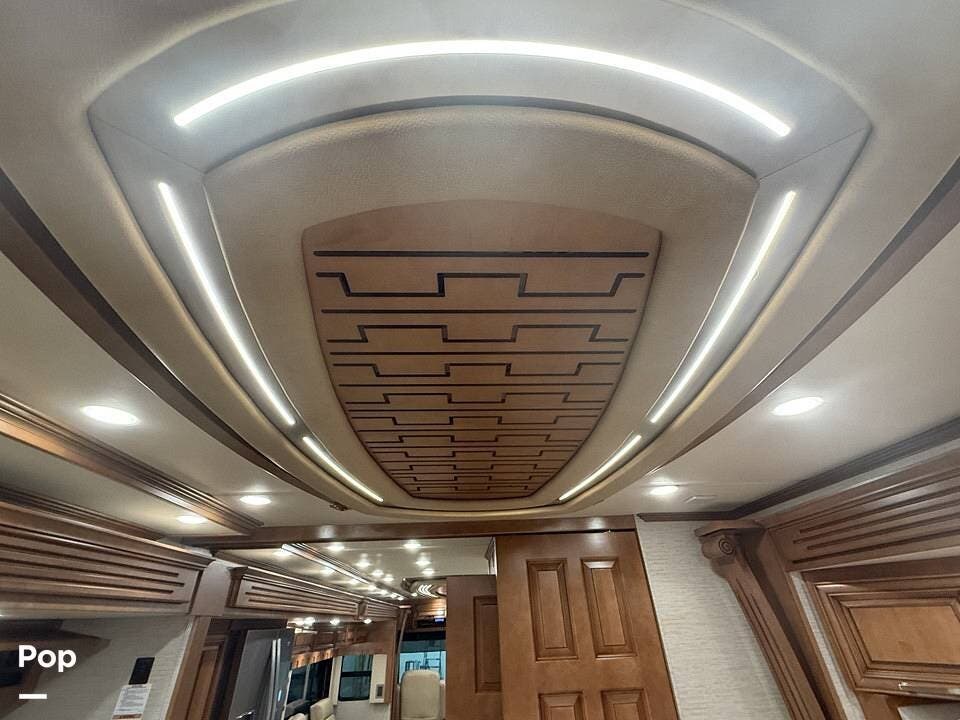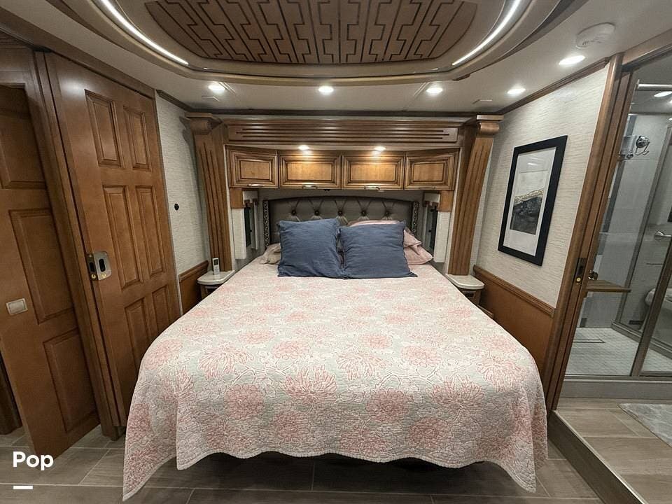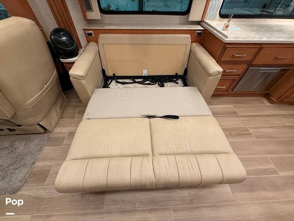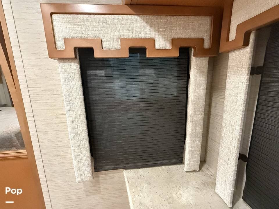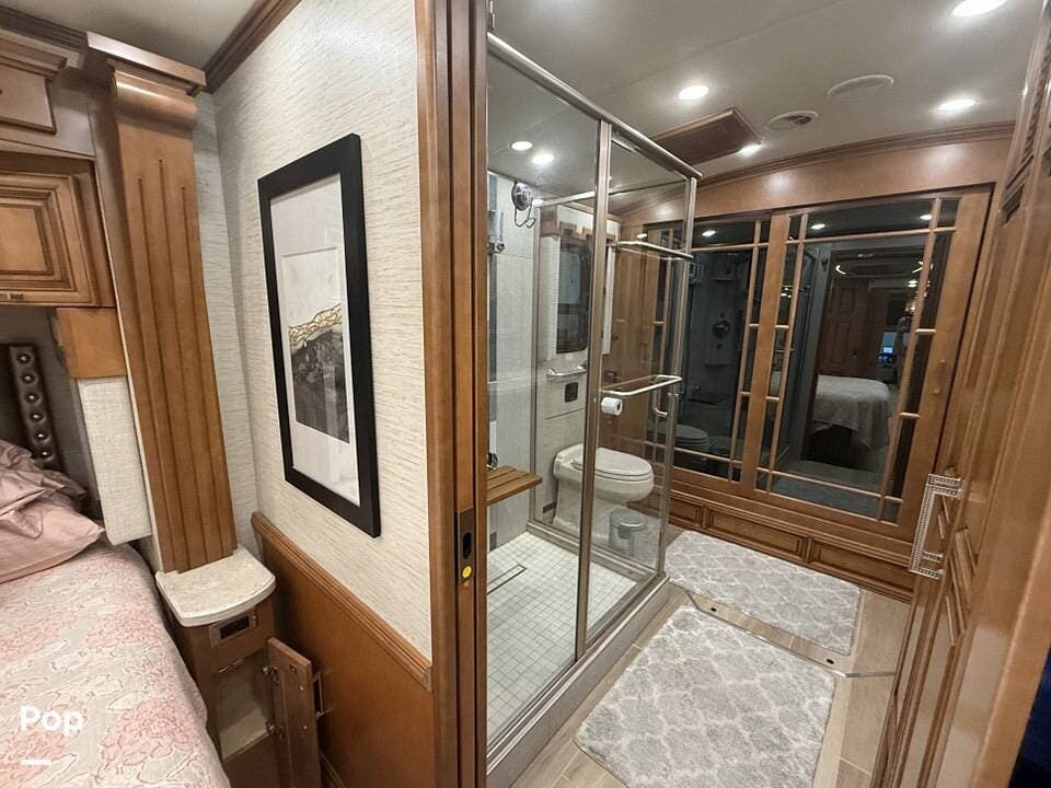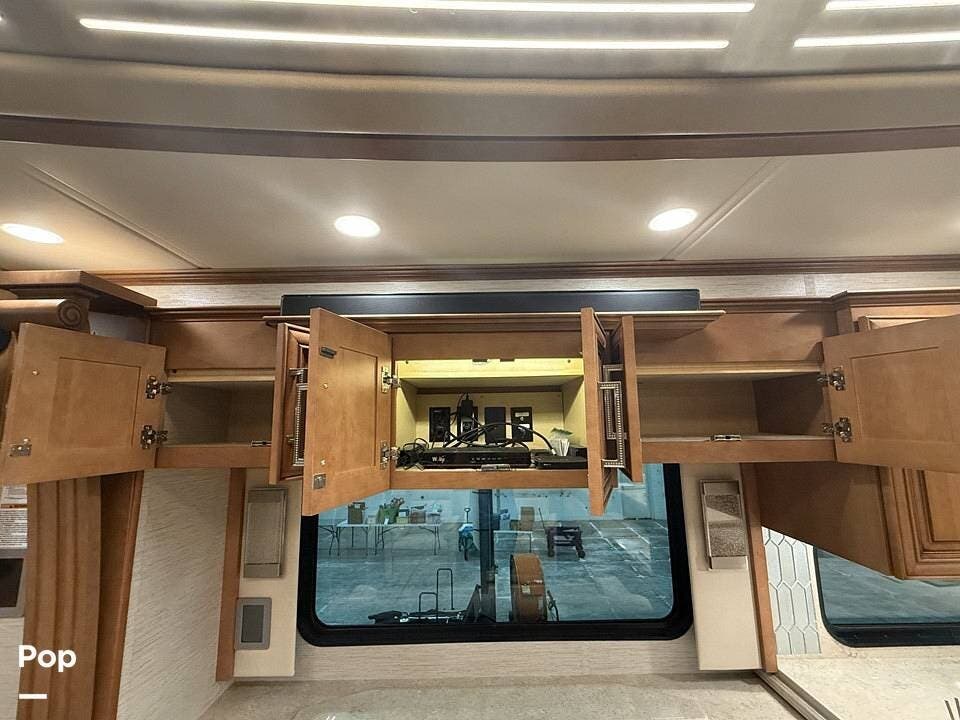 Inside, you'll find top-of-the-line residential features, including a full-sized French door refrigerator/freezer, a two-burner induction cooktop, a convection microwave oven, a large single-bowl sink, a dishwasher, a slide-out countertop extension with drawers, a pantry, a washer and dryer, and a built-in safe. Motion-powered shades and a basement-mounted refrigerator/freezer provide added convenience and storage flexibility for extended journeys.