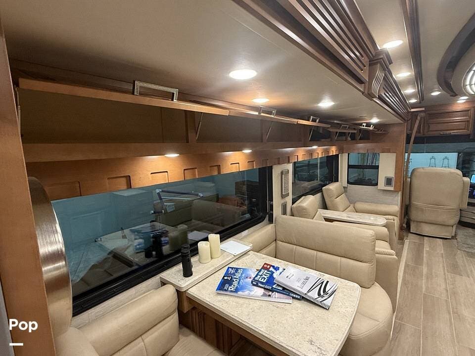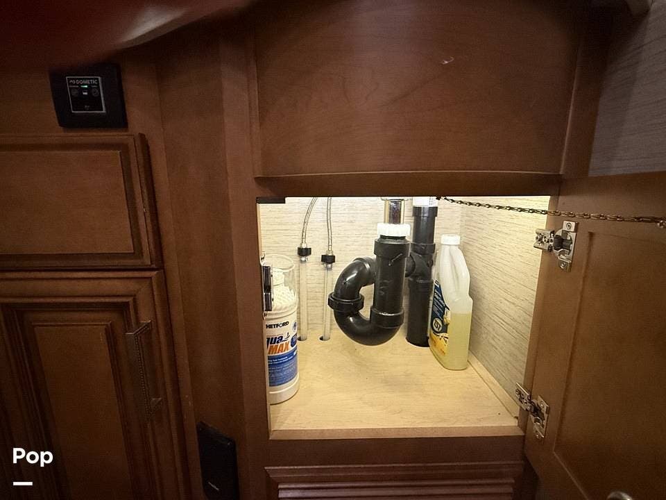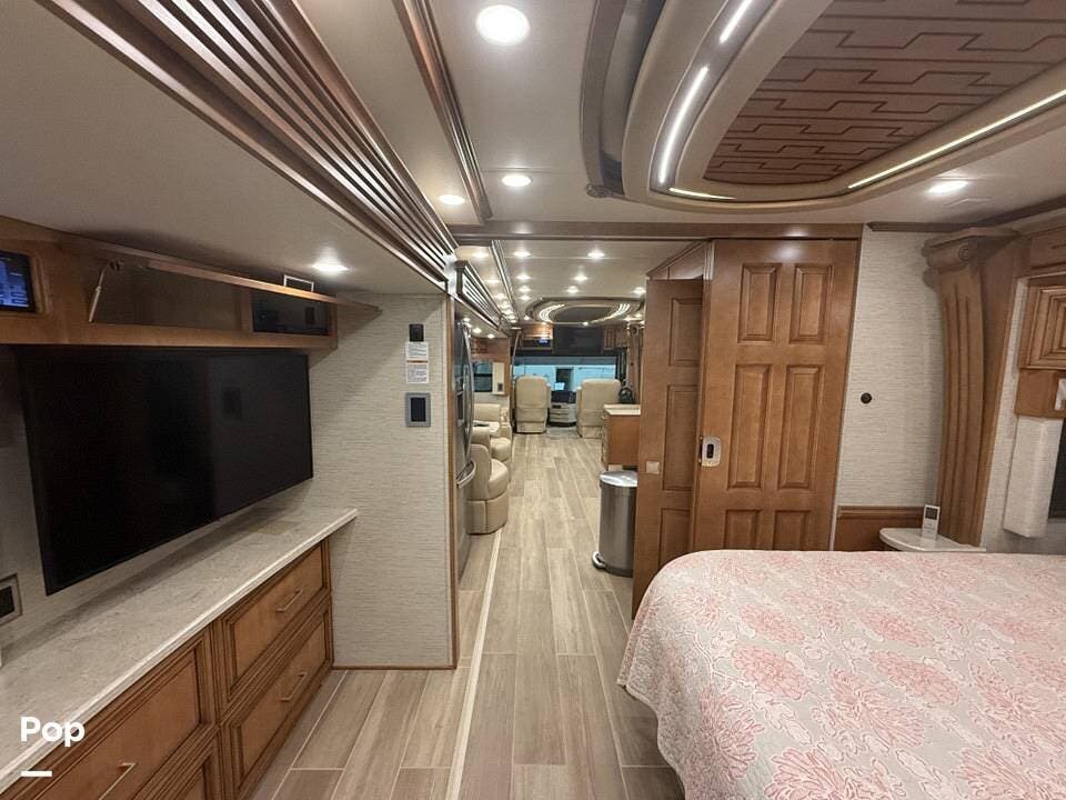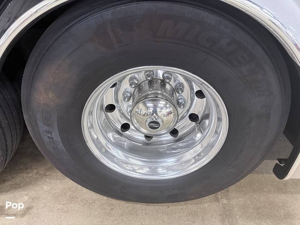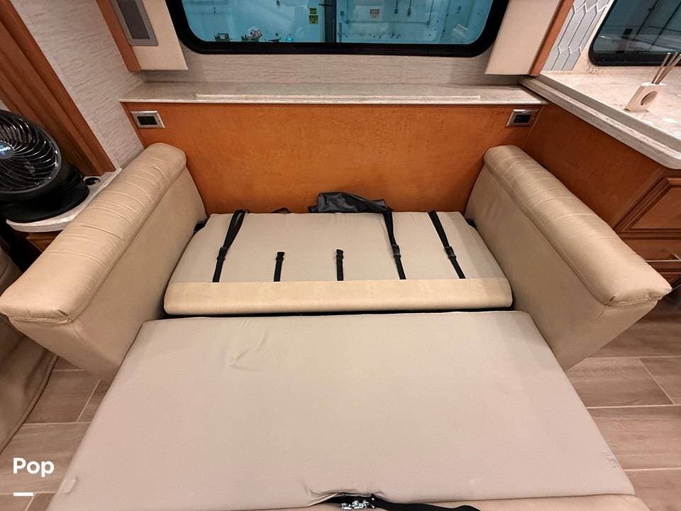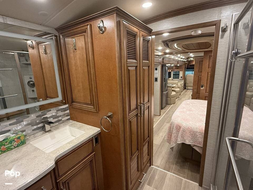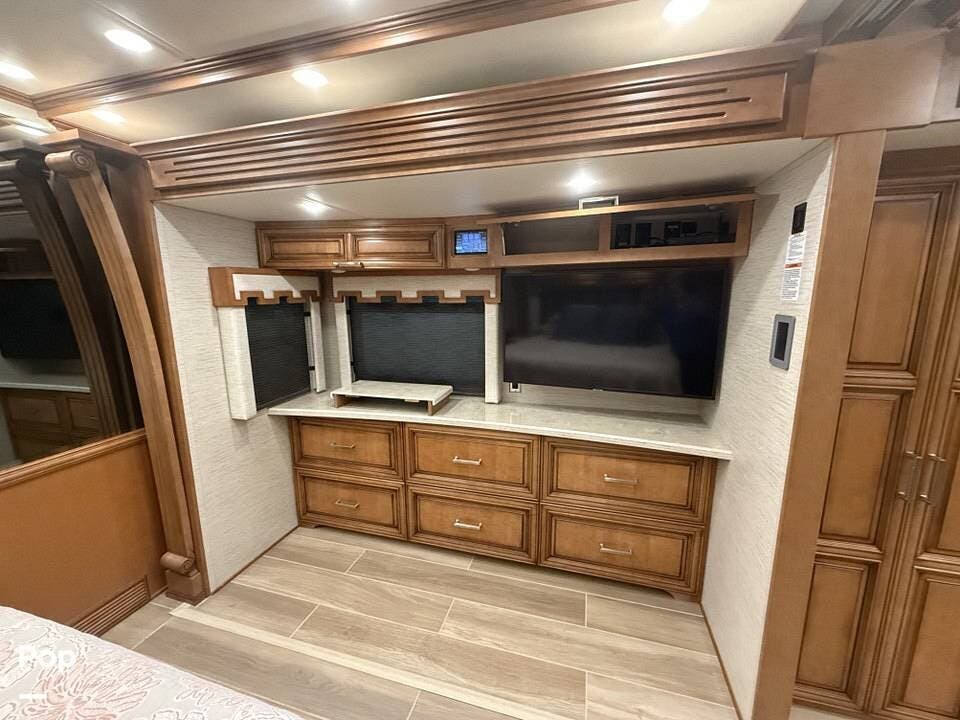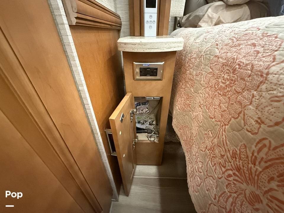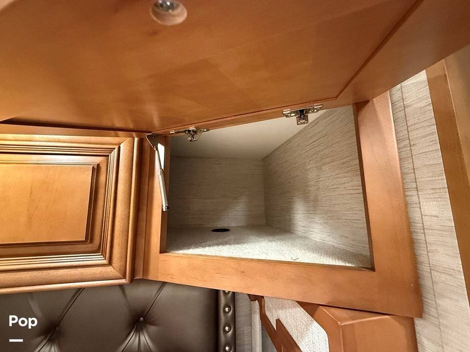 Inside, you'll find top-of-the-line residential features, including a full-sized French door refrigerator/freezer, a two-burner induction cooktop, a convection microwave oven, a large single-bowl sink, a dishwasher, a slide-out countertop extension with drawers, a pantry, a washer and dryer, and a built-in safe. Motion-powered shades and a basement-mounted refrigerator/freezer provide added convenience and storage flexibility for extended journeys.