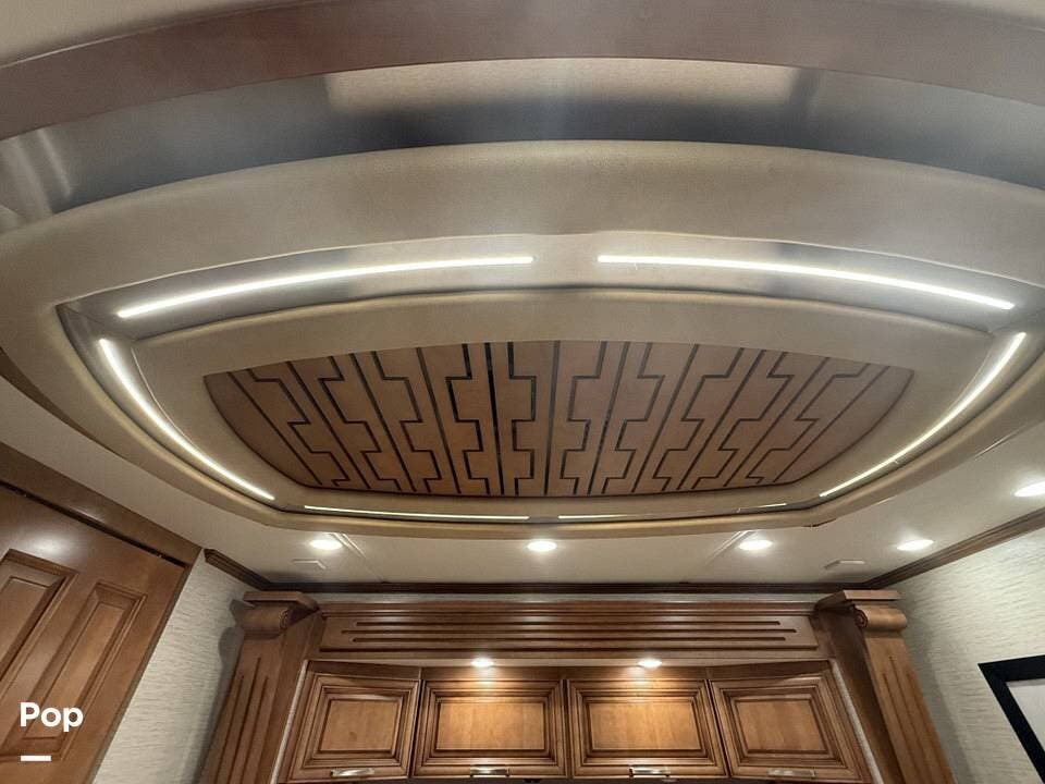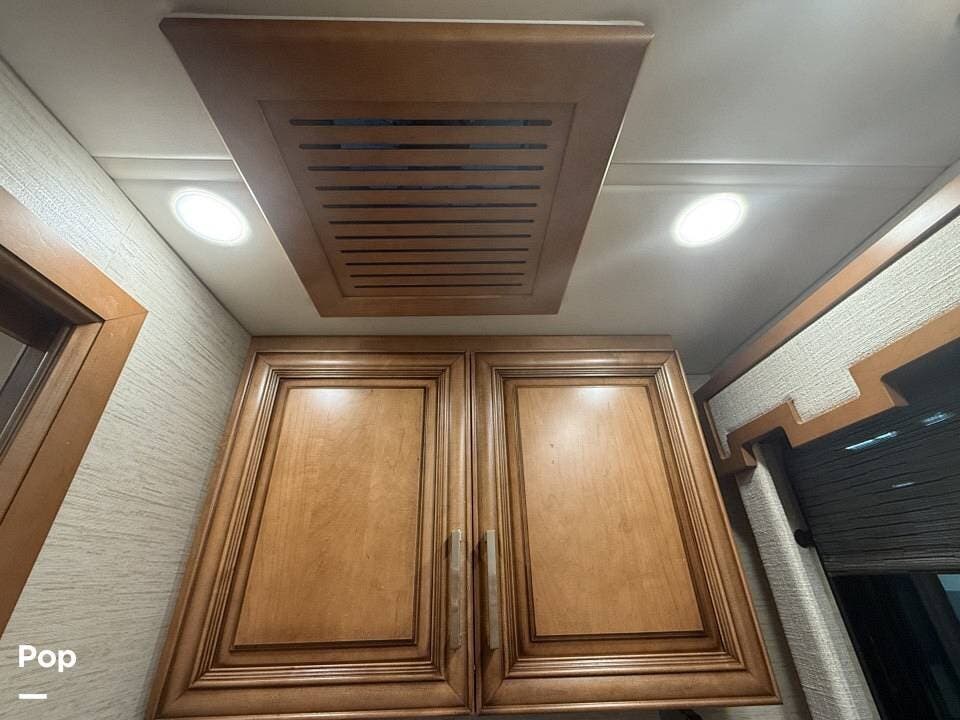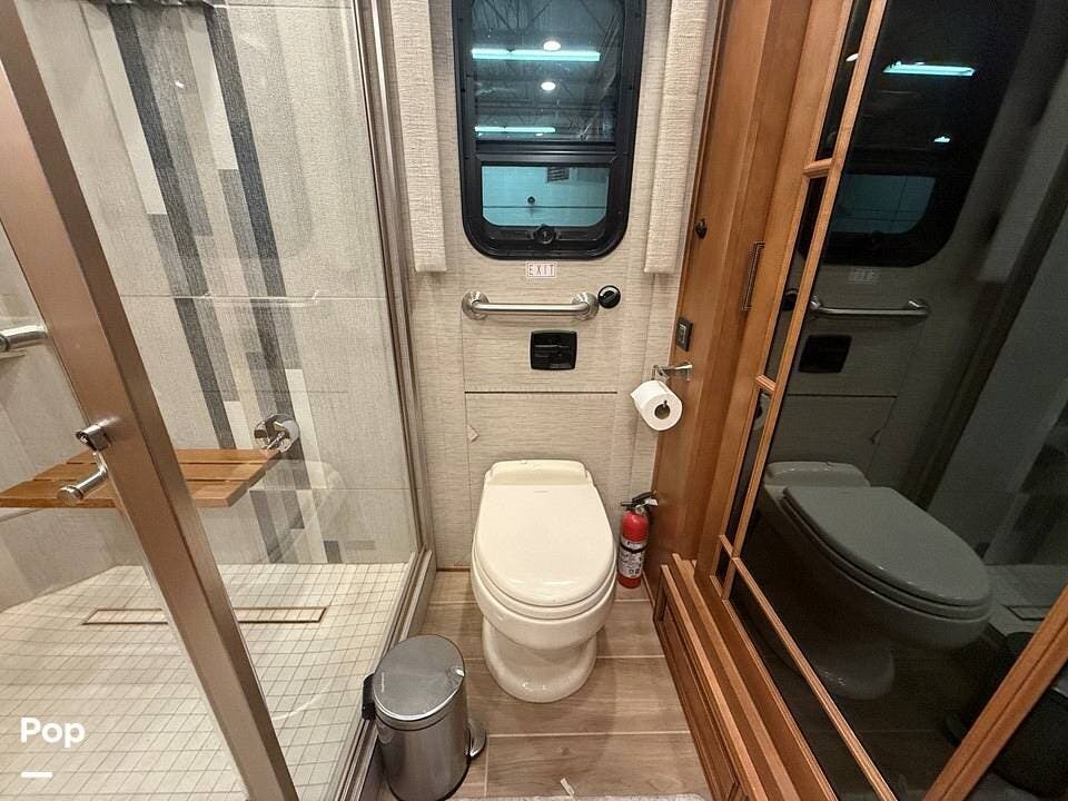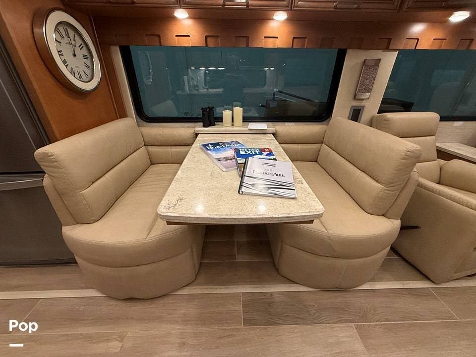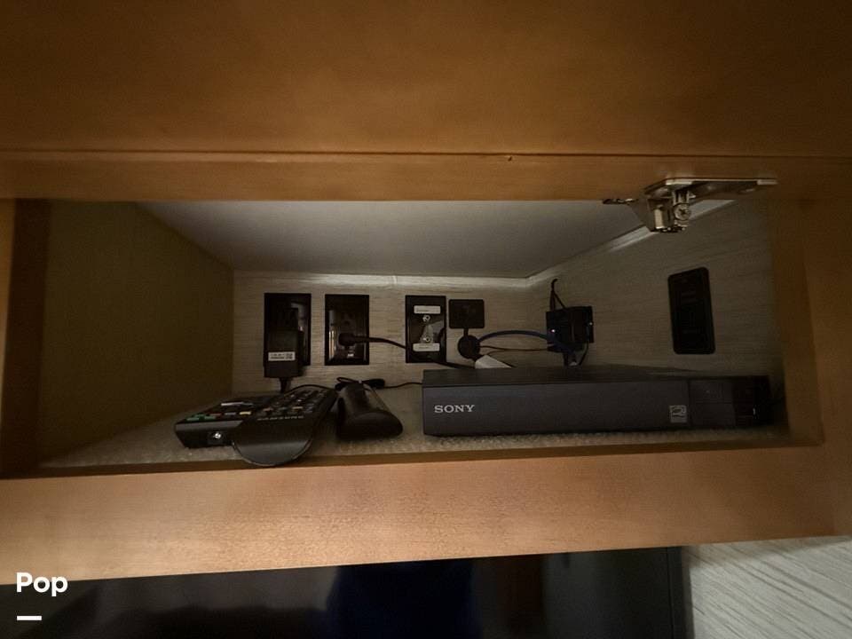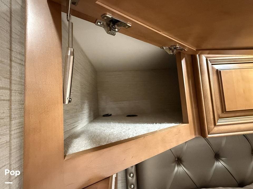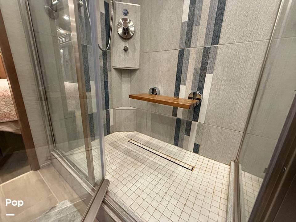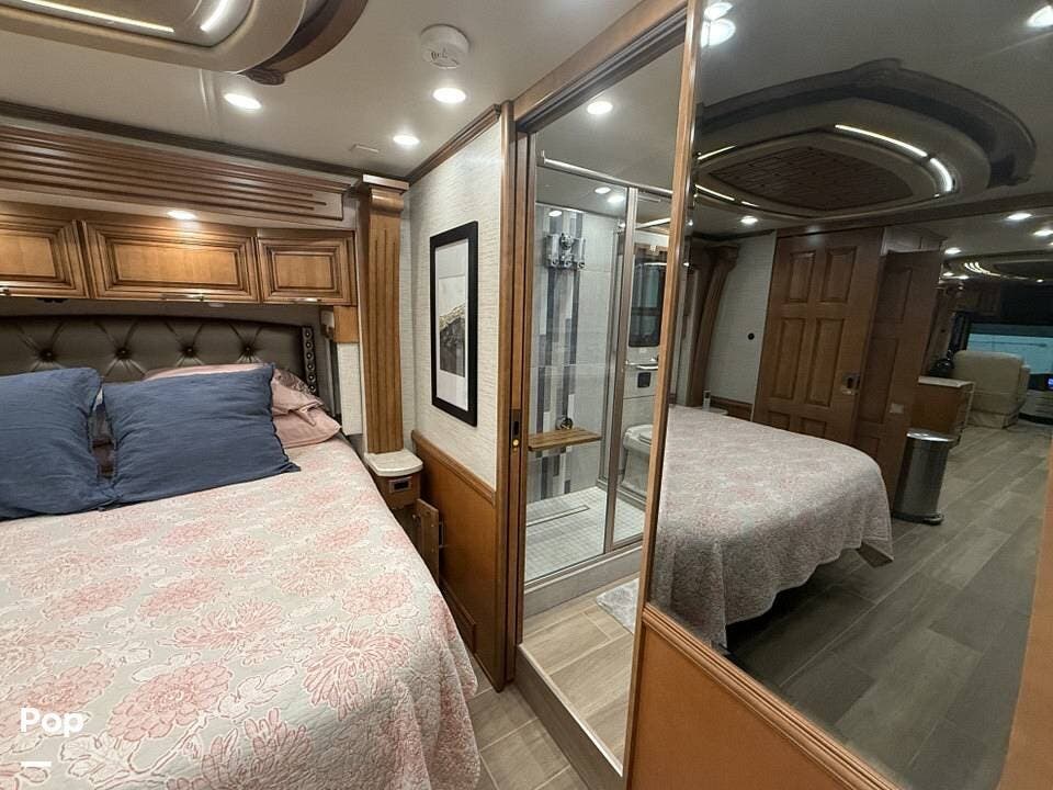 Inside, you'll find top-of-the-line residential features, including a full-sized French door refrigerator/freezer, a two-burner induction cooktop, a convection microwave oven, a large single-bowl sink, a dishwasher, a slide-out countertop extension with drawers, a pantry, a washer and dryer, and a built-in safe. Motion-powered shades and a basement-mounted refrigerator/freezer provide added convenience and storage flexibility for extended journeys.