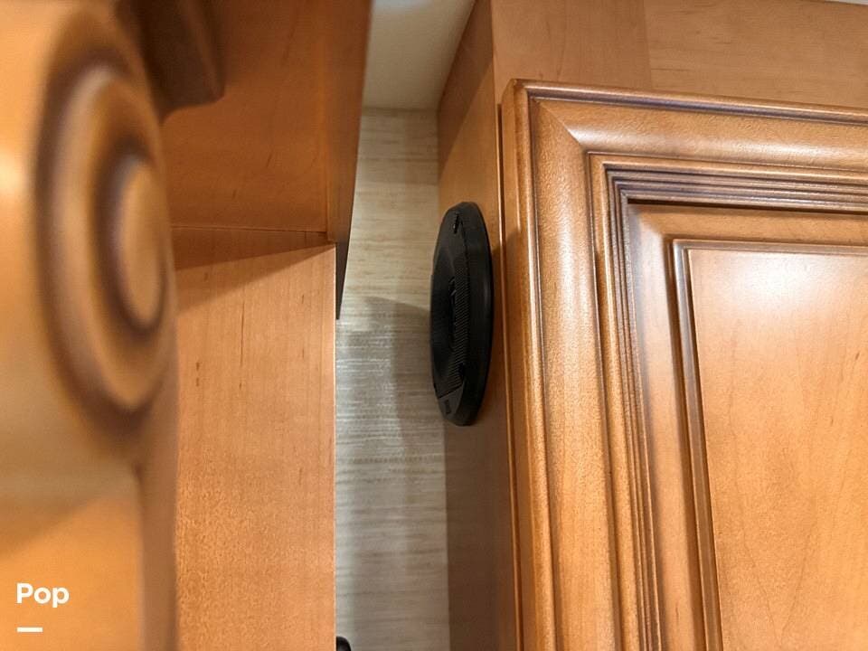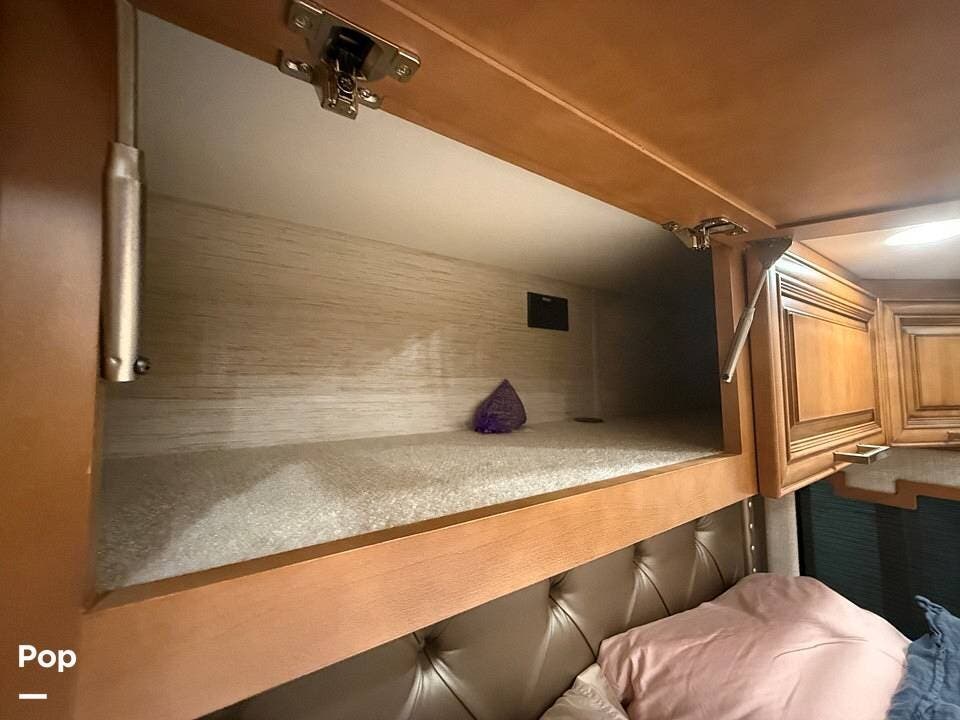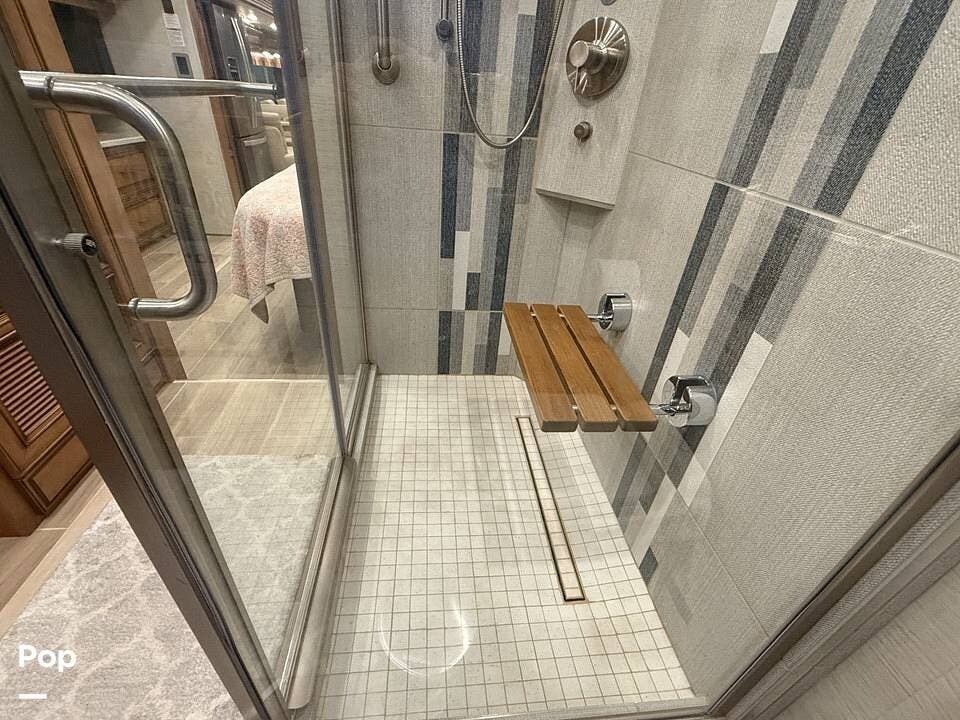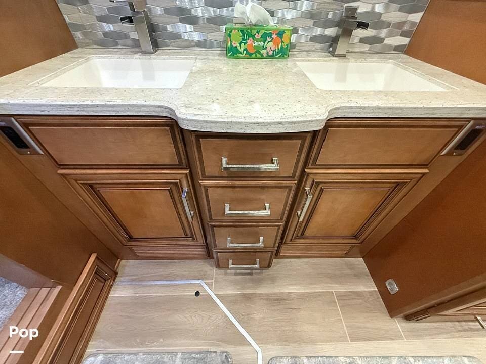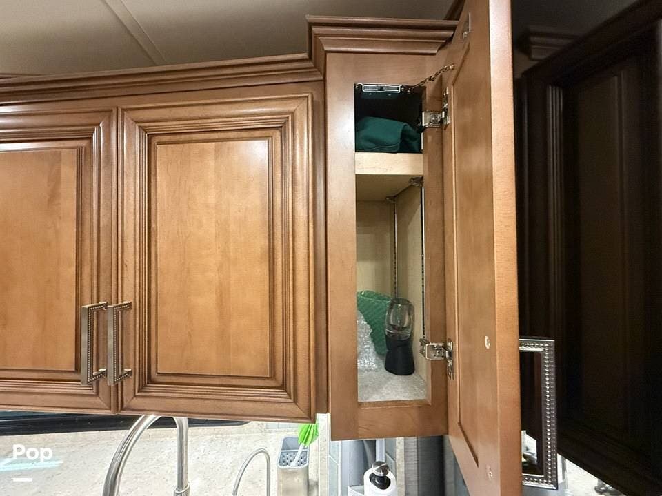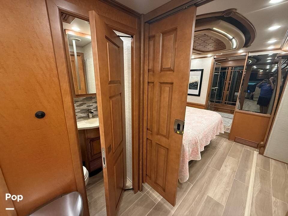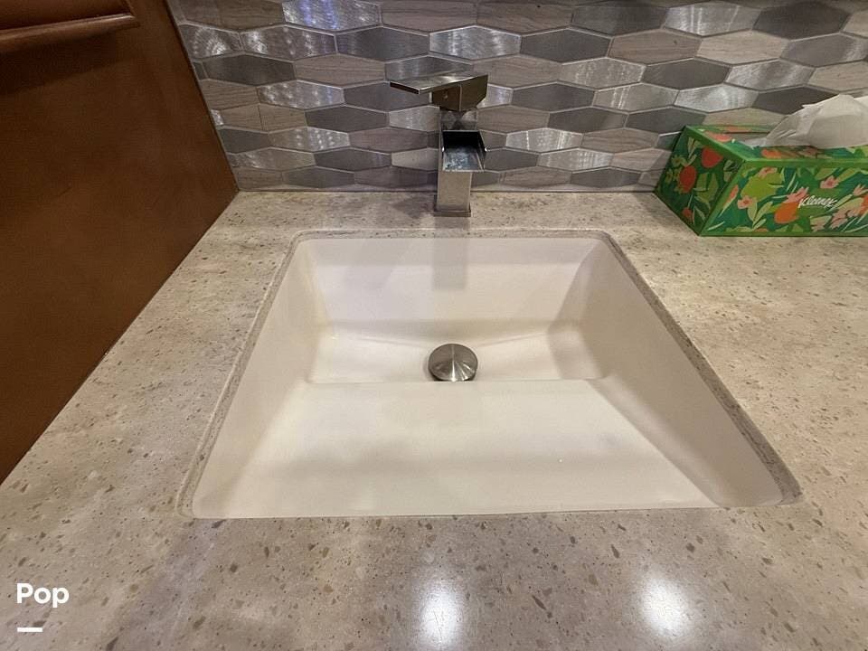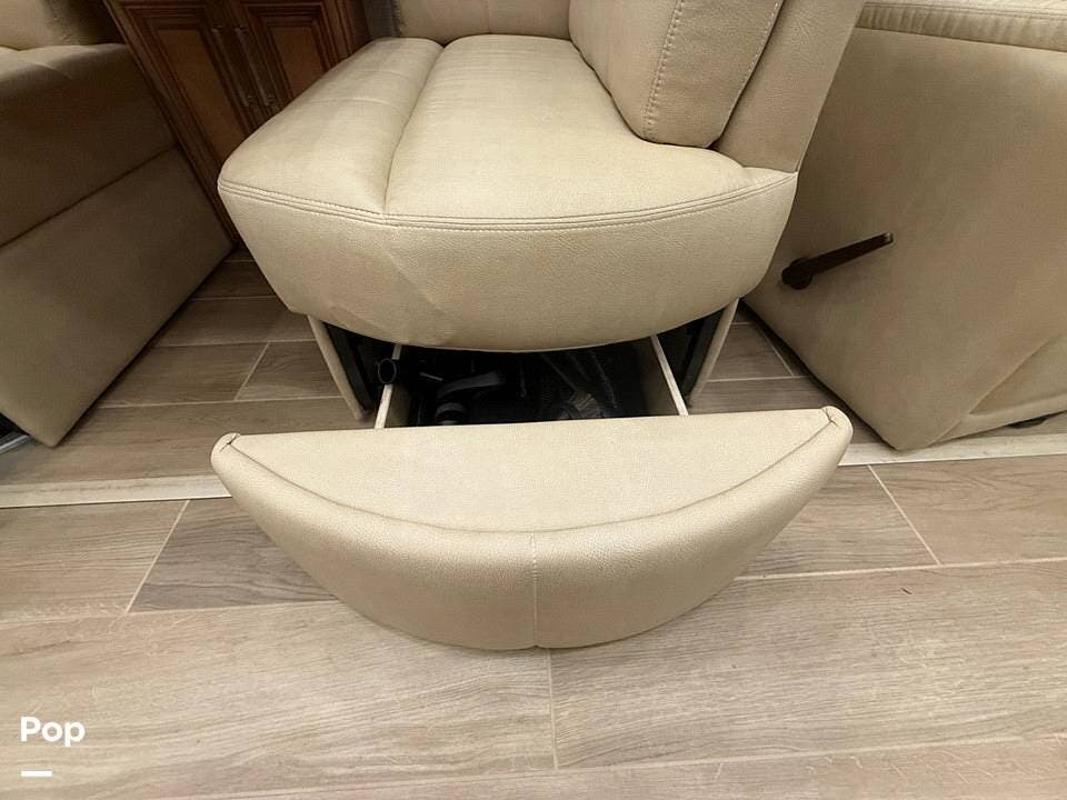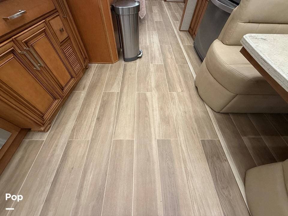 Inside, you'll find top-of-the-line residential features, including a full-sized French door refrigerator/freezer, a two-burner induction cooktop, a convection microwave oven, a large single-bowl sink, a dishwasher, a slide-out countertop extension with drawers, a pantry, a washer and dryer, and a built-in safe. Motion-powered shades and a basement-mounted refrigerator/freezer provide added convenience and storage flexibility for extended journeys.