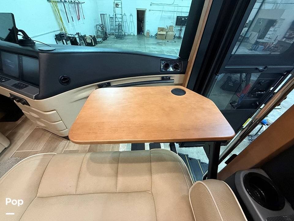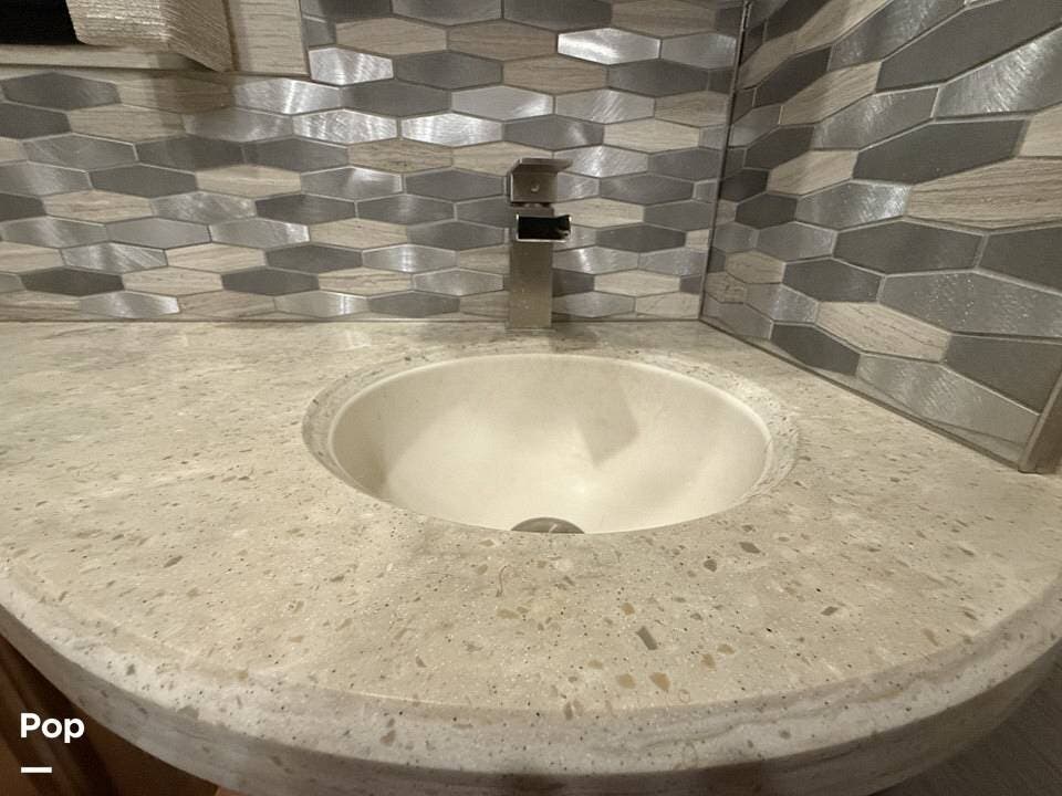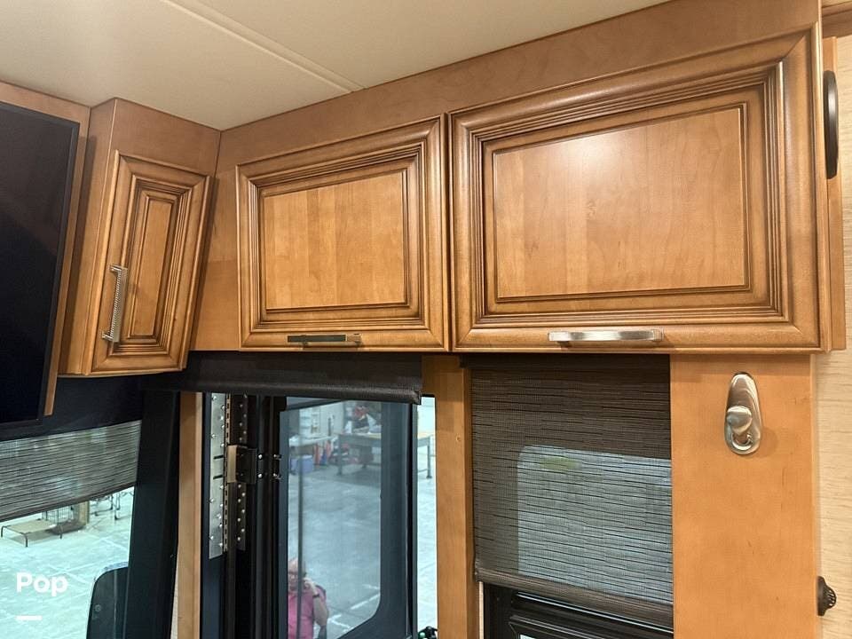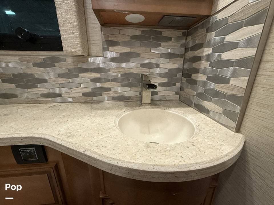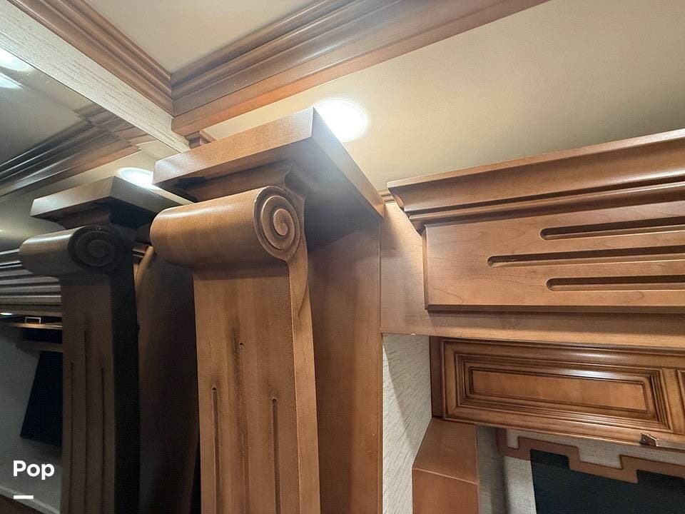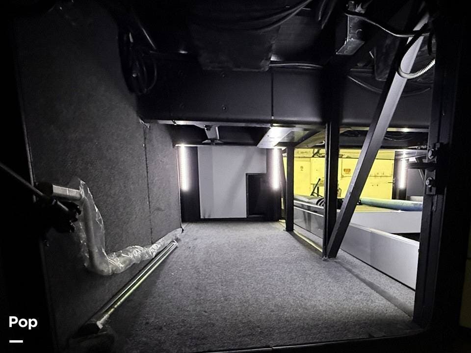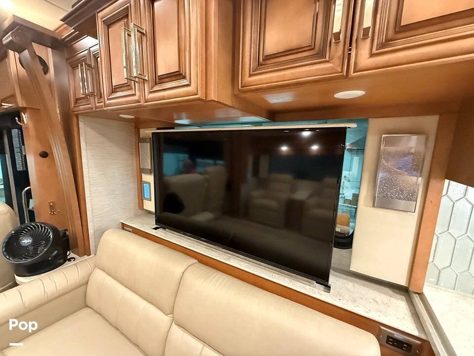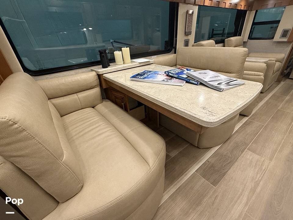 Inside, you'll find top-of-the-line residential features, including a full-sized French door refrigerator/freezer, a two-burner induction cooktop, a convection microwave oven, a large single-bowl sink, a dishwasher, a slide-out countertop extension with drawers, a pantry, a washer and dryer, and a built-in safe. Motion-powered shades and a basement-mounted refrigerator/freezer provide added convenience and storage flexibility for extended journeys.