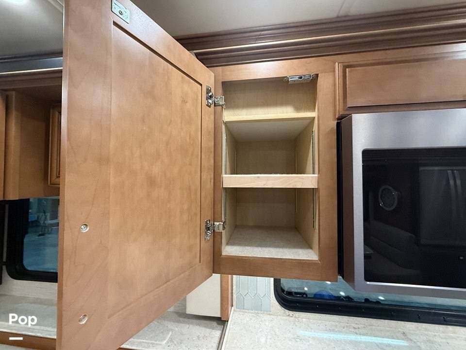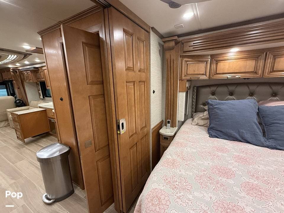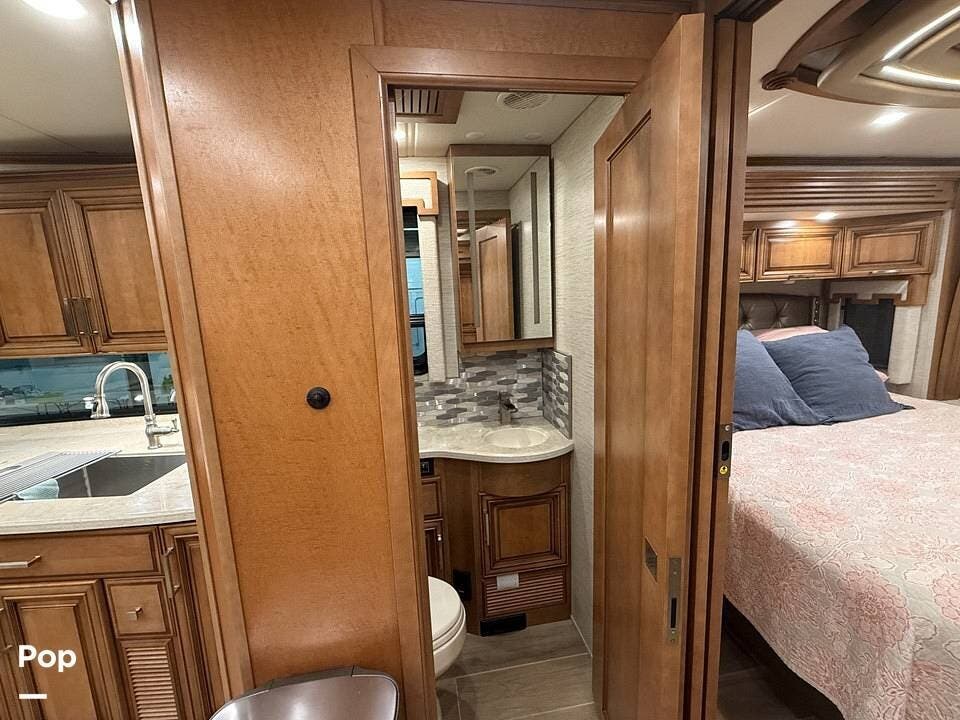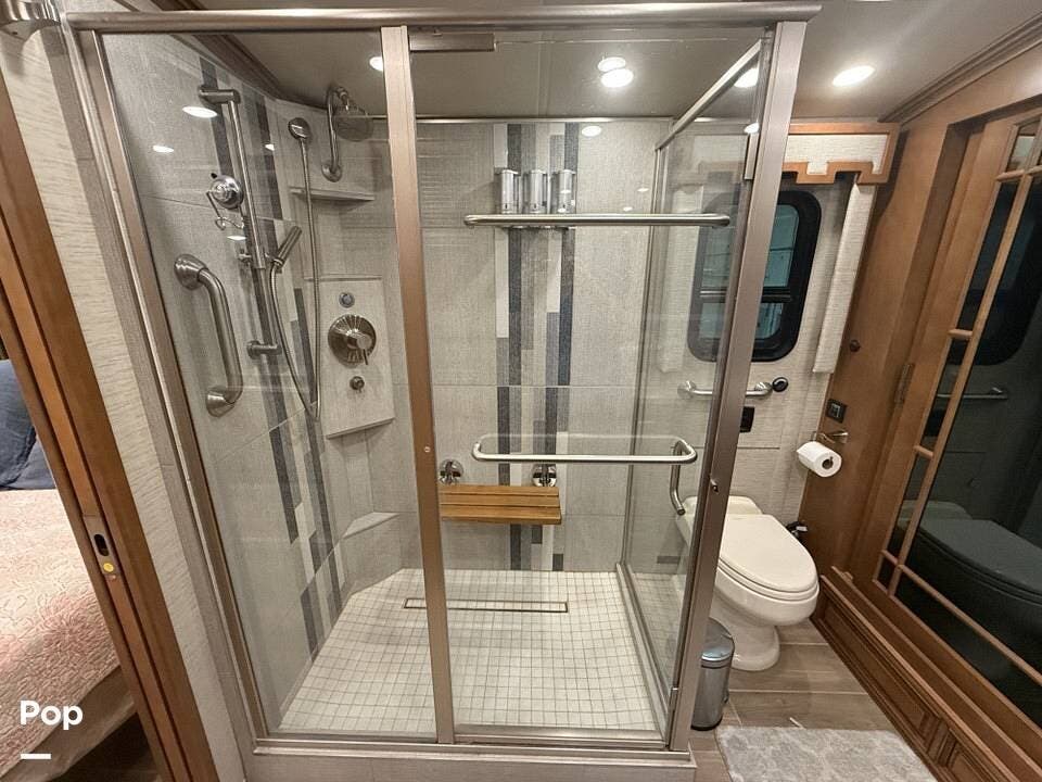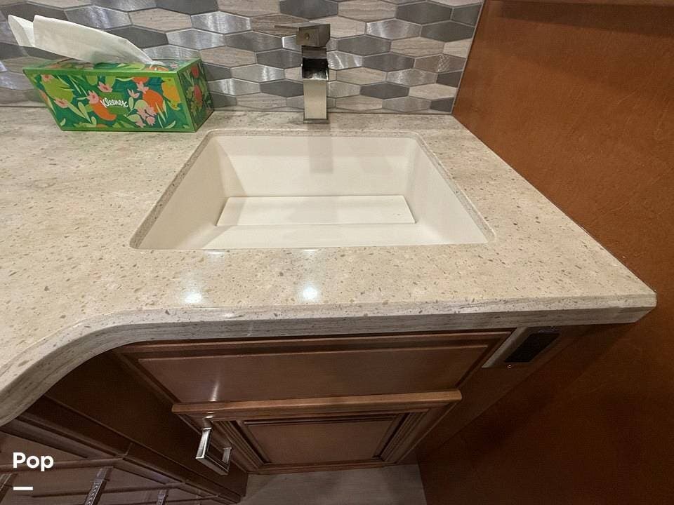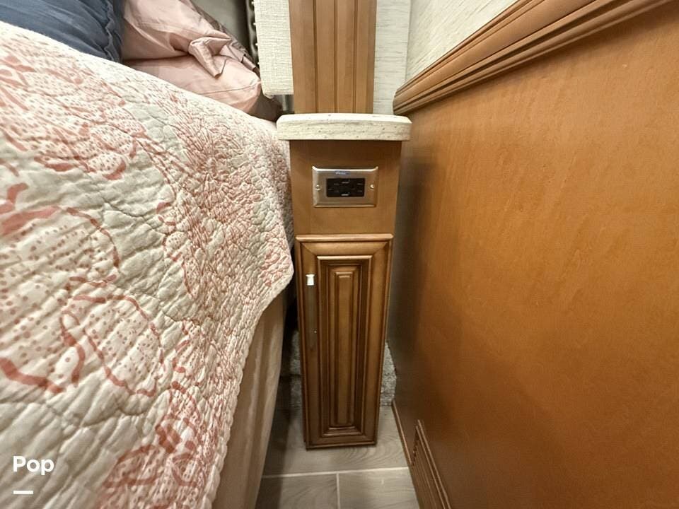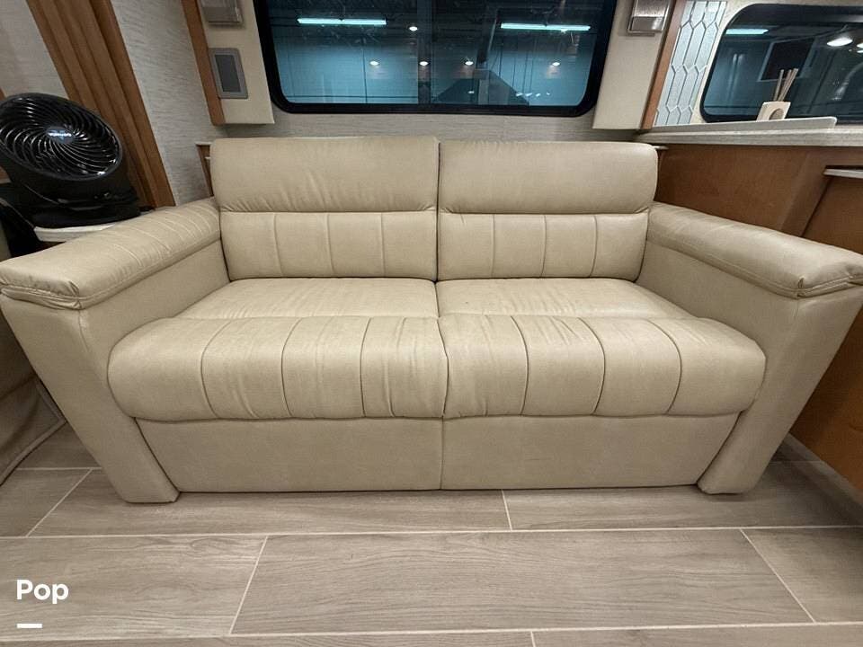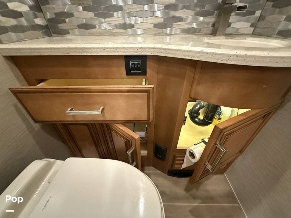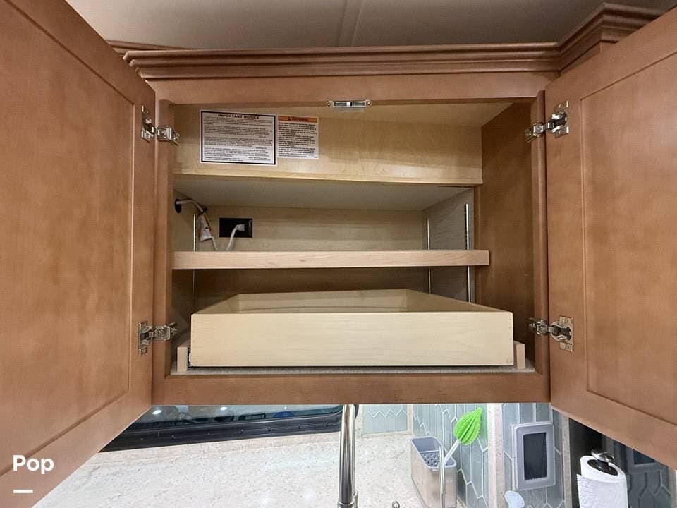 Inside, you'll find top-of-the-line residential features, including a full-sized French door refrigerator/freezer, a two-burner induction cooktop, a convection microwave oven, a large single-bowl sink, a dishwasher, a slide-out countertop extension with drawers, a pantry, a washer and dryer, and a built-in safe. Motion-powered shades and a basement-mounted refrigerator/freezer provide added convenience and storage flexibility for extended journeys.