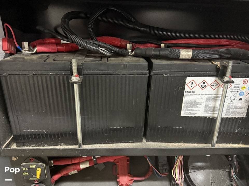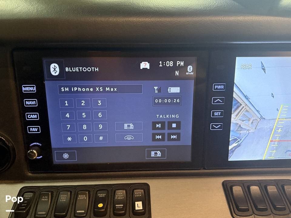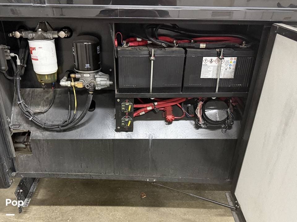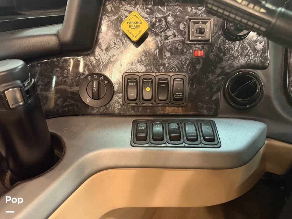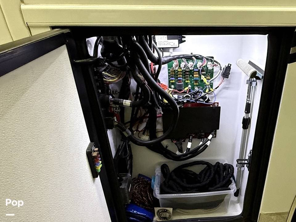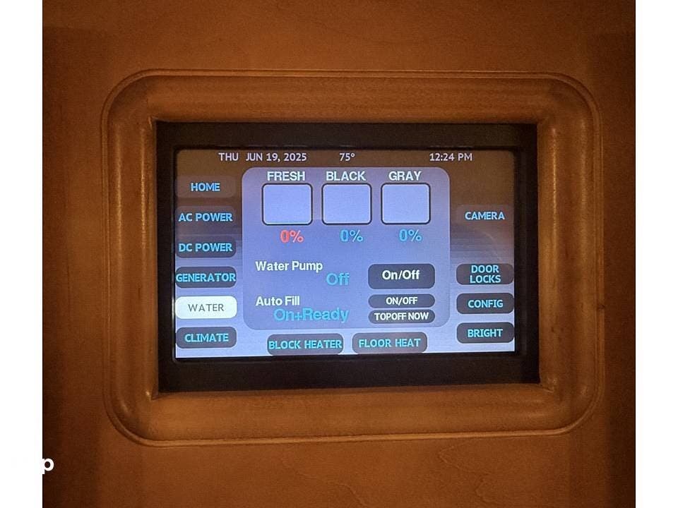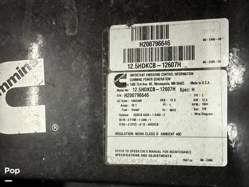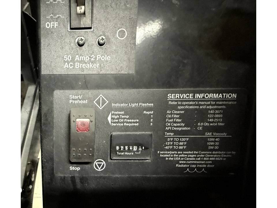 Climate control is provided by three roof-mounted Penguin AC/heat pumps, which collectively produce a total of 45,000 BTUs. Off-grid capability is supported by a six-bank house battery system and a 12.5 kW Onan diesel generator.