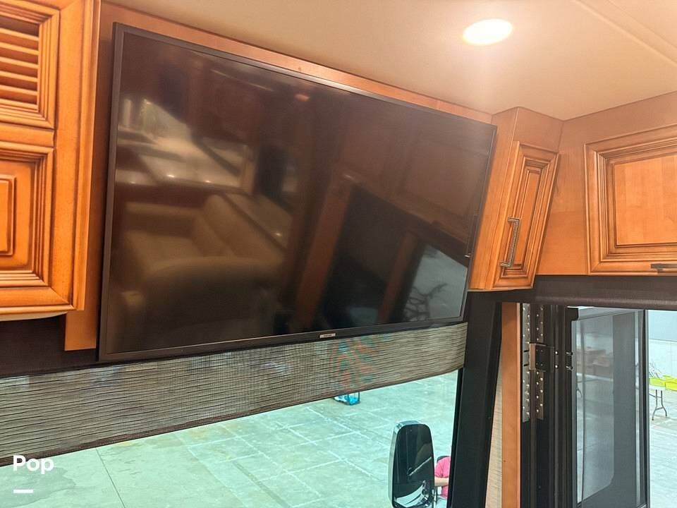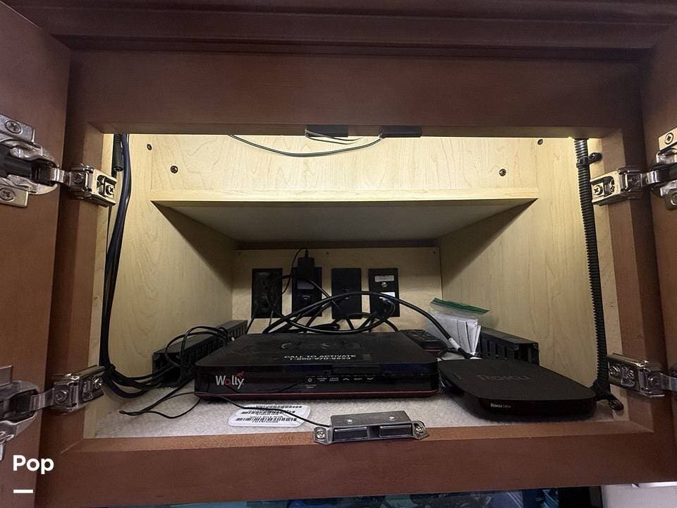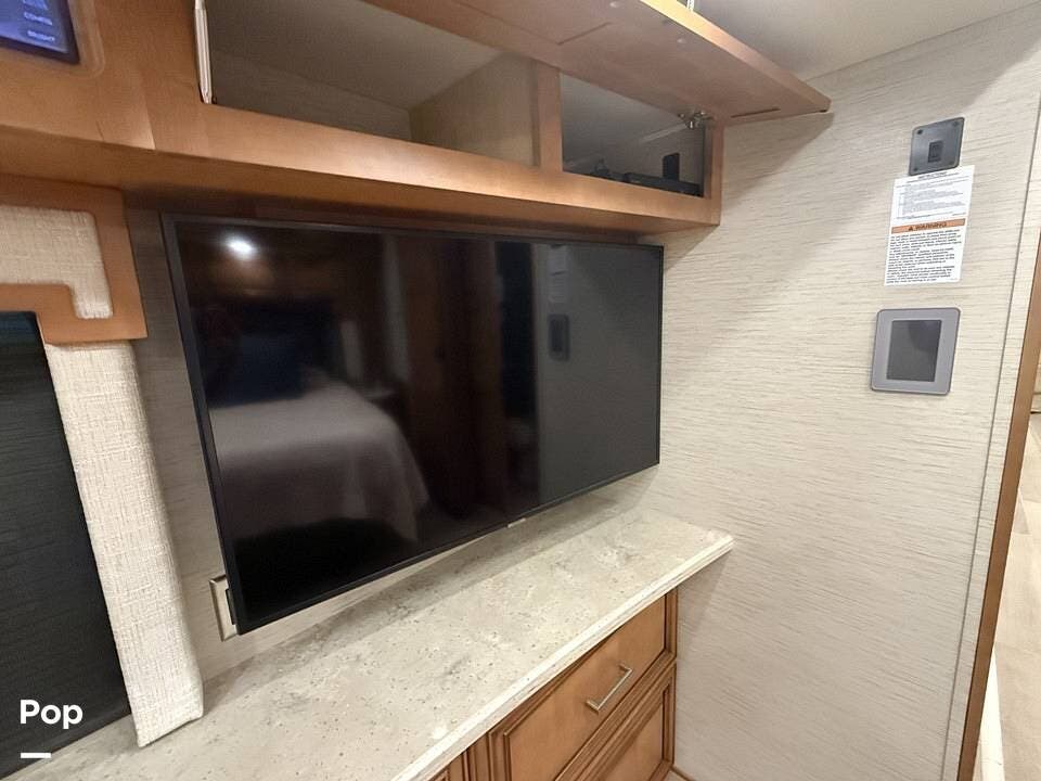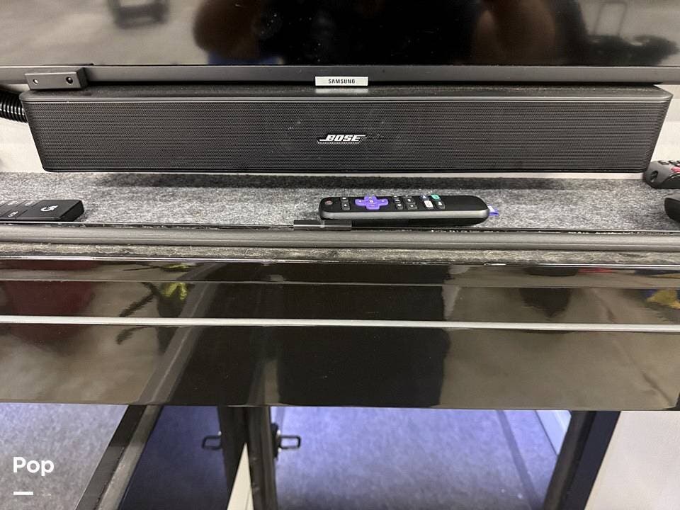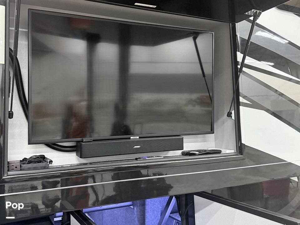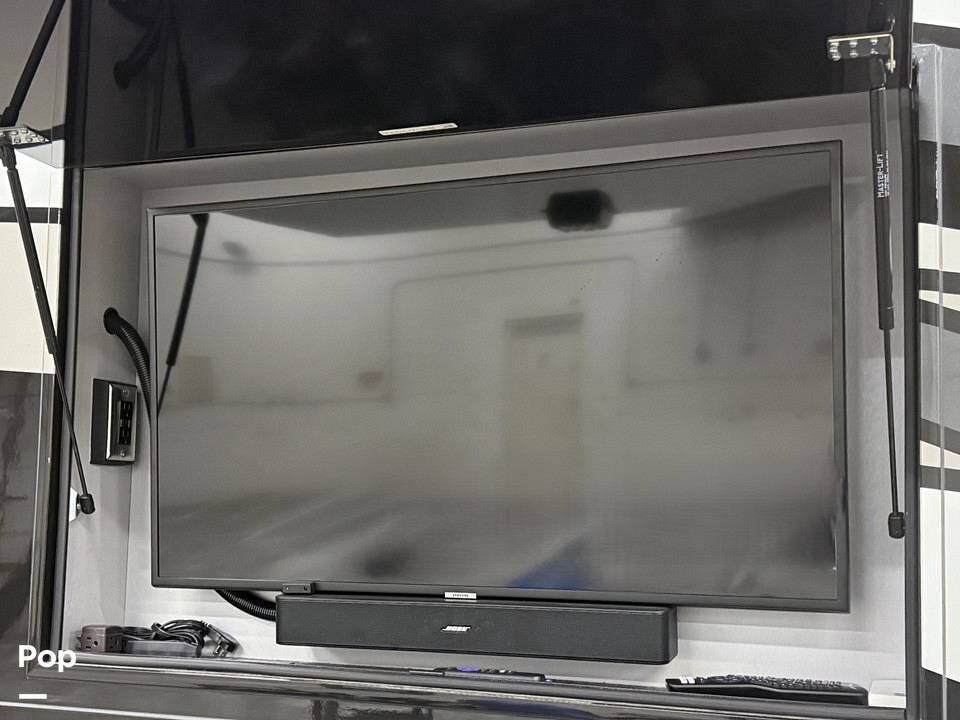 Entertainment and connectivity are fully integrated with a power-lift Samsung 4K TV, cab-mounted and bedroom TVs, an exterior TV, Roku streaming, a Dish satellite system, a Wi-Fi extender, and a Starlink receiver.