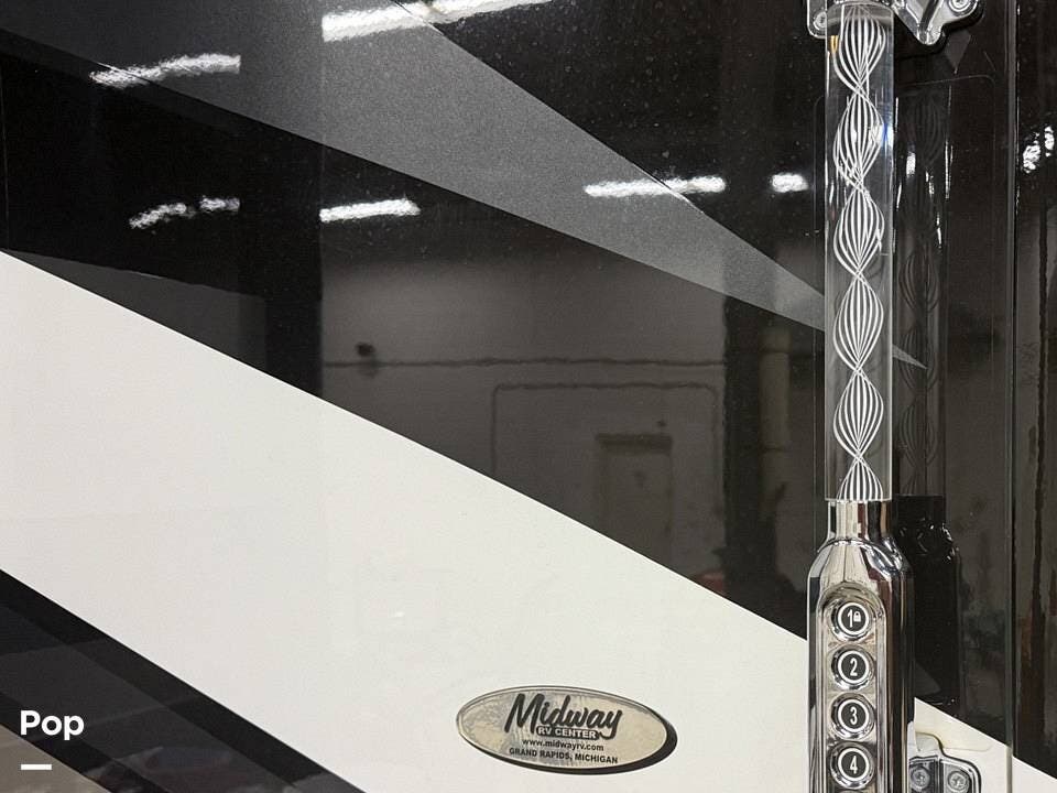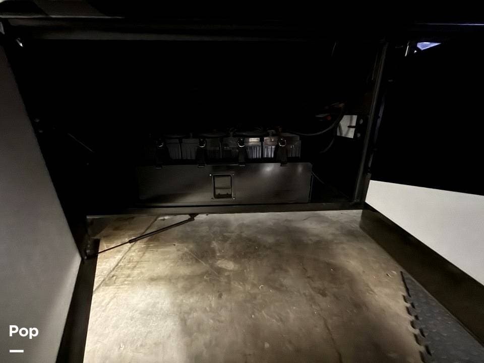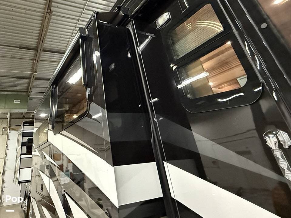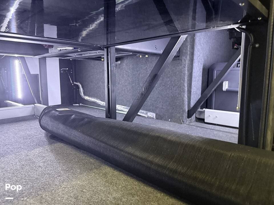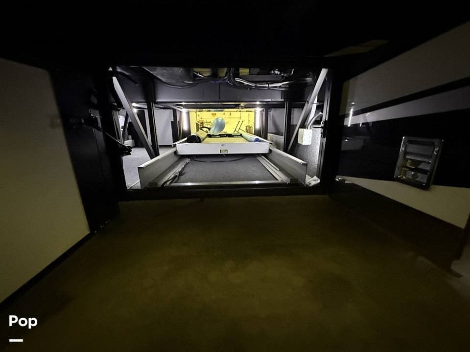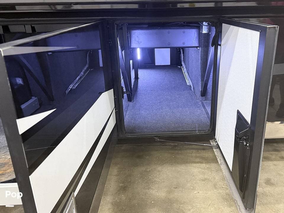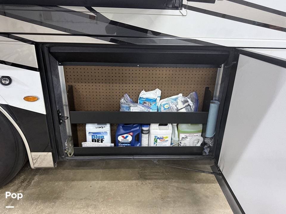 Exterior features include two Girard Nova awnings with wind sensors, slide-toppers, window awnings, and a rear emergency exit door in the master bathroom. Ample basement storage, featuring a power slide-out tray, adds practicality and ease.