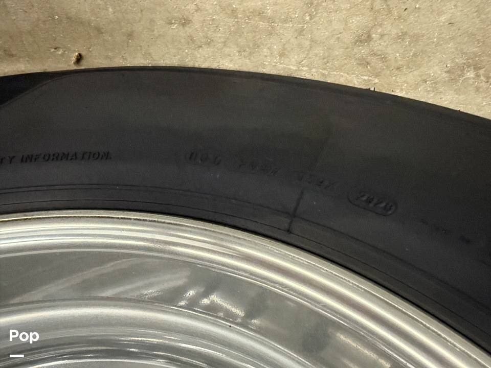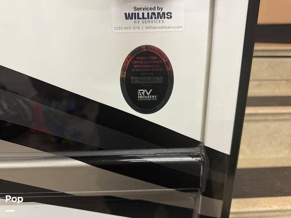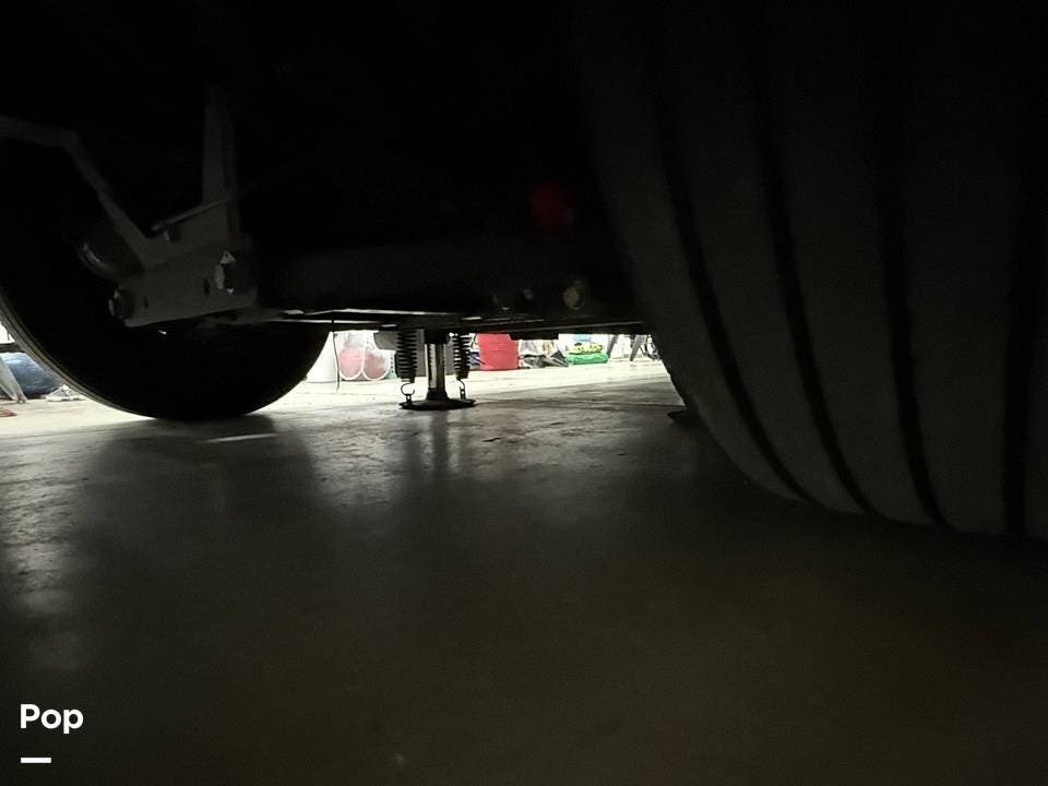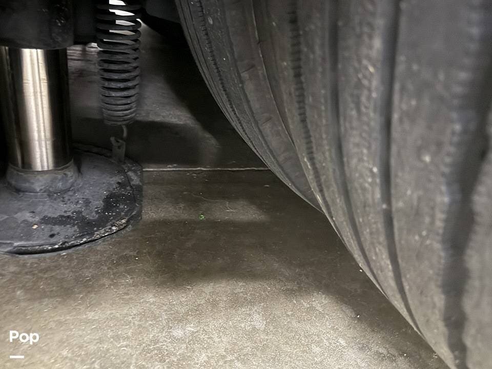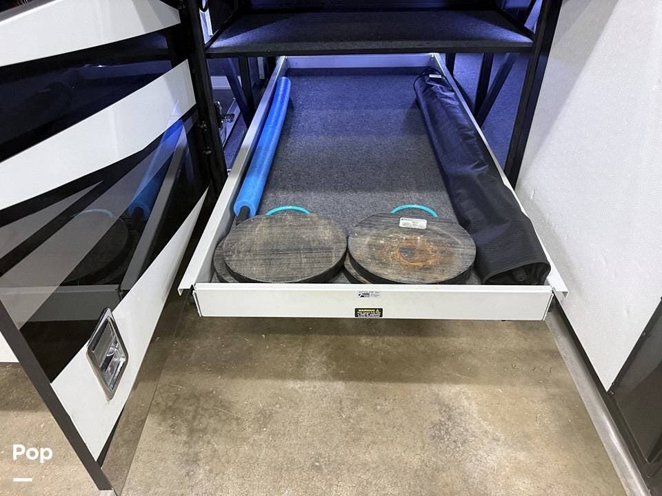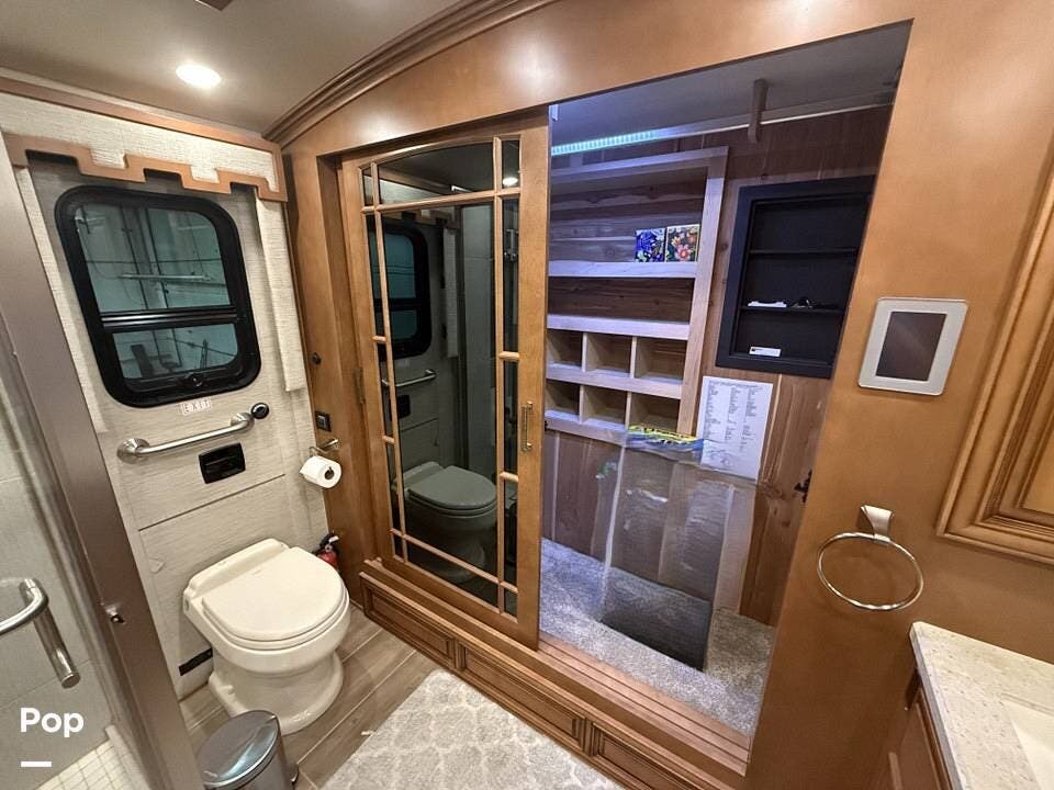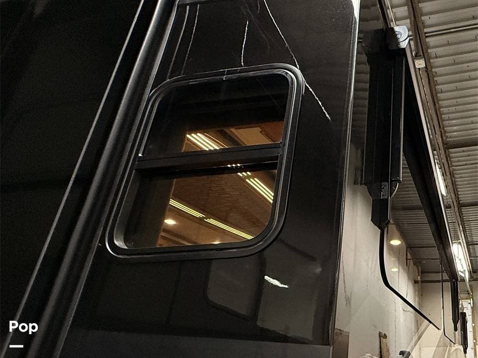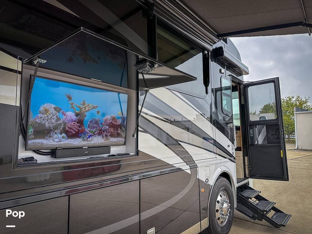 Exterior features include two Girard Nova awnings with wind sensors, slide-toppers, window awnings, and a rear emergency exit door in the master bathroom. Ample basement storage, featuring a power slide-out tray, adds practicality and ease.