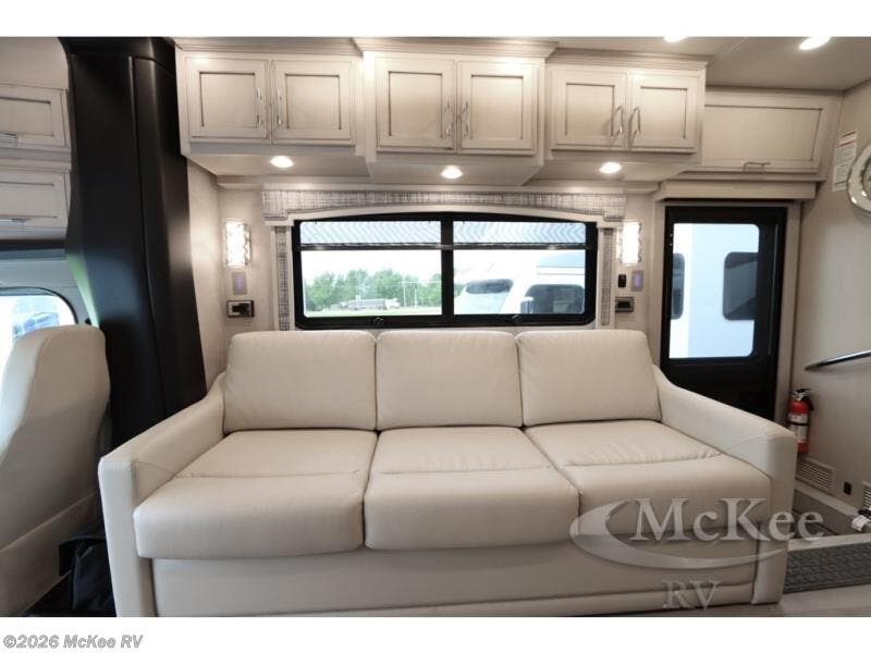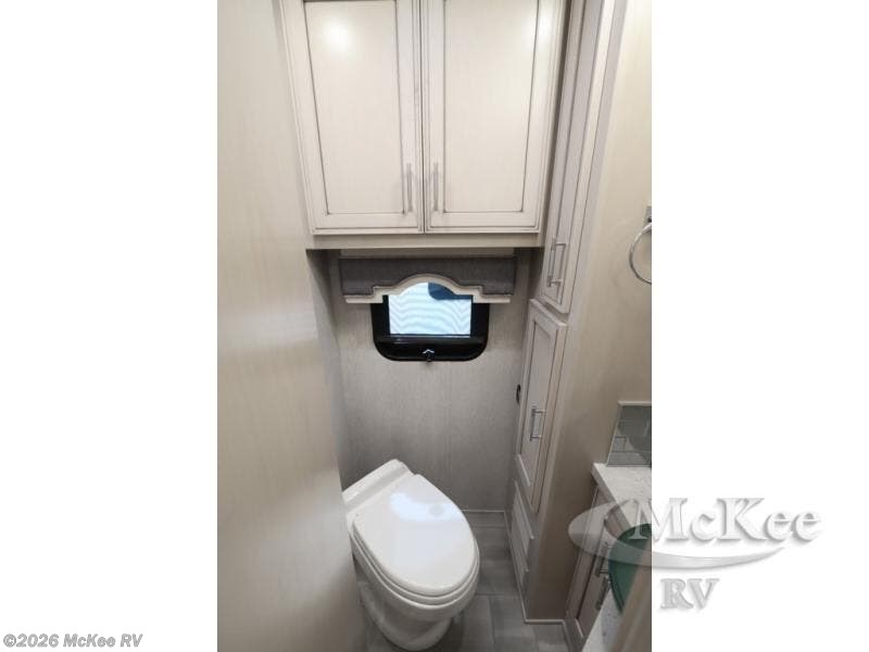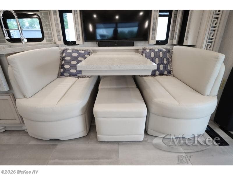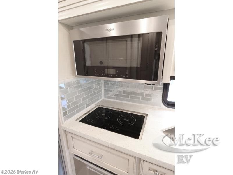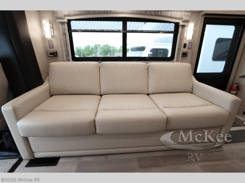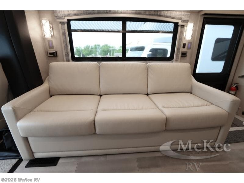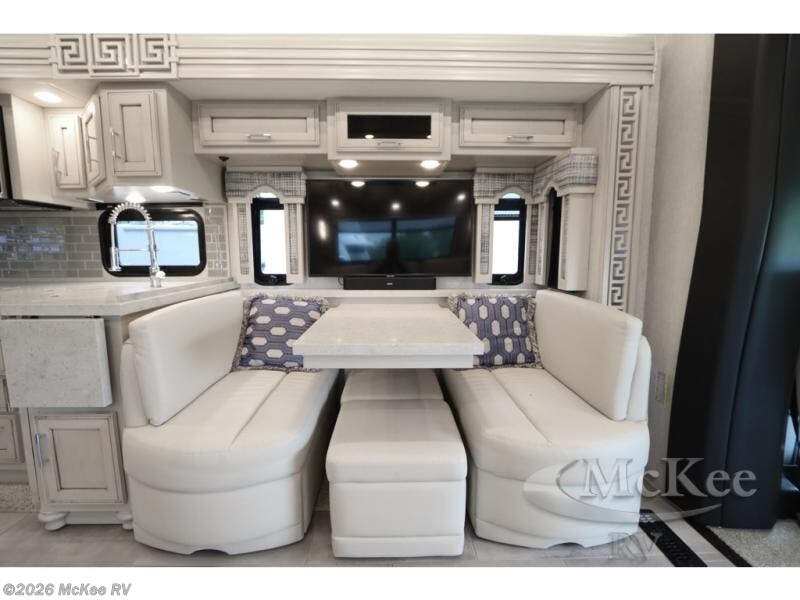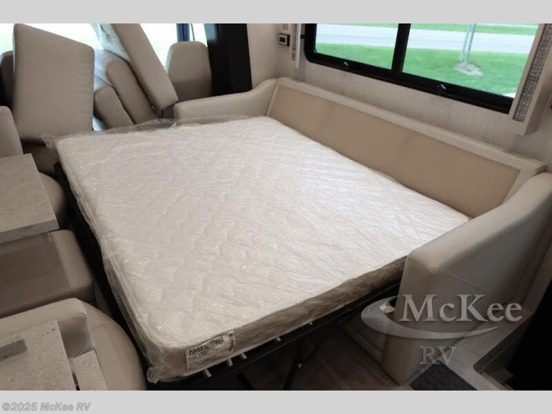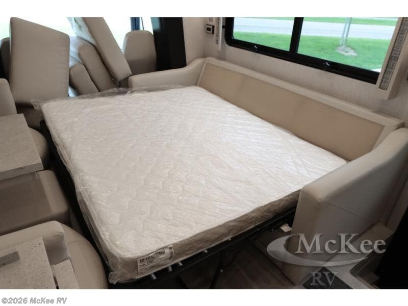 Everyone will stay squeaky clean in this motorhome with a bath and a half! The full rear bathroom has a 35" x 35" radius shower, a closet prepped to add the optional washer and dryer, and a wardrobe with bi-folding doors, plus an emergency exit door behind the toilet. As you walk through the private bedroom, you will see a king bed and shirt wardrobes on either side of a dresser with a Samsung 4K TV above it. The half bathroom is conveniently by the kitchen so you can get back to cooking a delicious meal on the recessed three burner gas cooktop. You can enjoy your meals at the booth dinette then relax in true comfort on the 87" hide-a-bed sofa with two ottomans to rest your feet on!