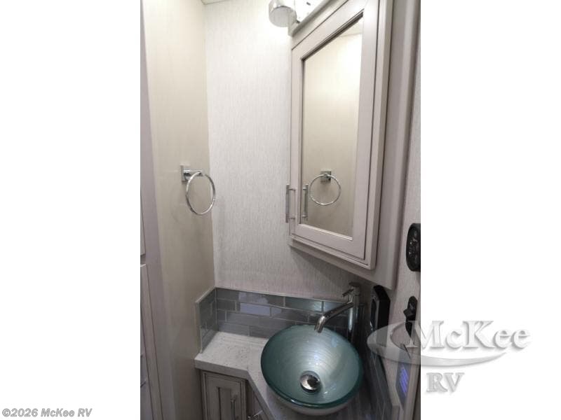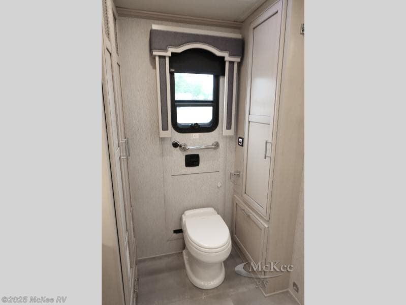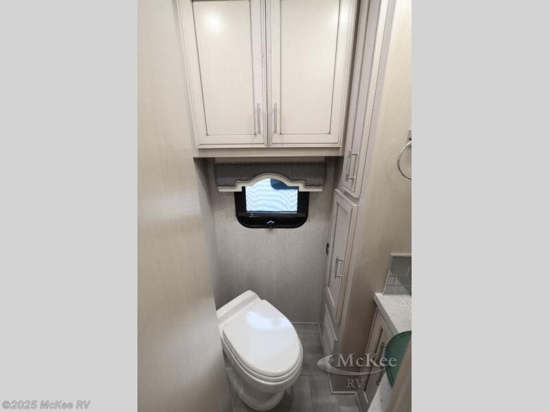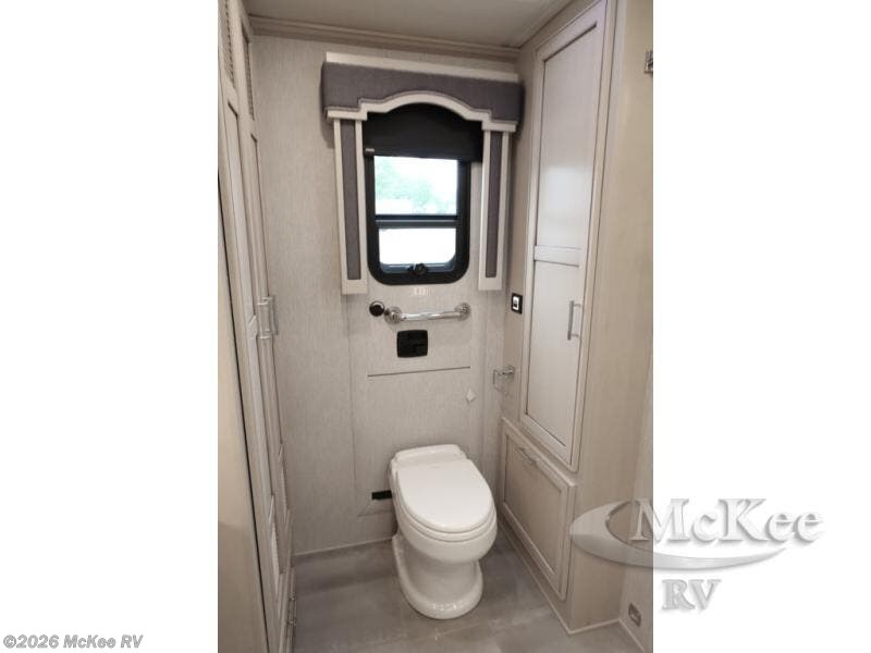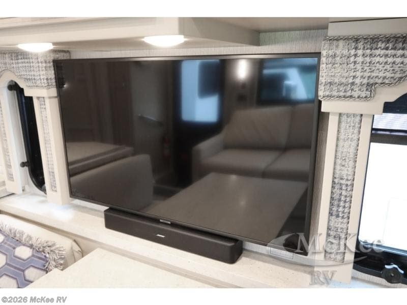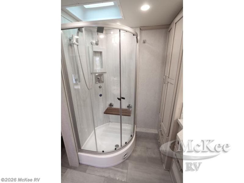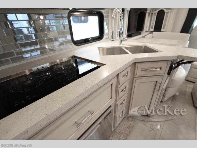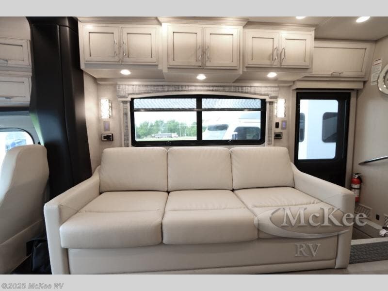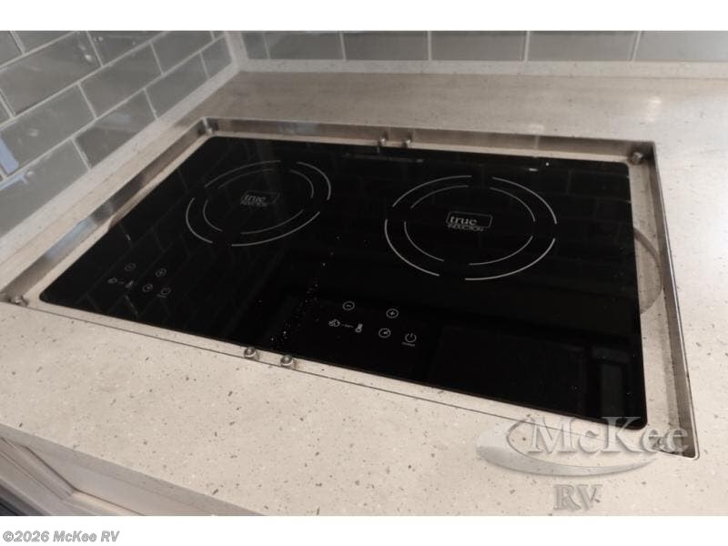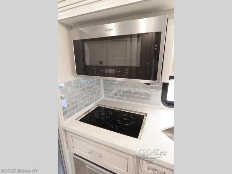Everyone will stay squeaky clean in this motorhome with a bath and a half! The full rear bathroom has a 35" x 35" radius shower, a closet prepped to add the optional washer and dryer, and a wardrobe with bi-folding doors, plus an emergency exit door behind the toilet. As you walk through the private bedroom, you will see a king bed and shirt wardrobes on either side of a dresser with a Samsung 4K TV above it. The half bathroom is conveniently by the kitchen so you can get back to cooking a delicious meal on the recessed three burner gas cooktop. You can enjoy your meals at the booth dinette then relax in true comfort on the 87" hide-a-bed sofa with two ottomans to rest your feet on!