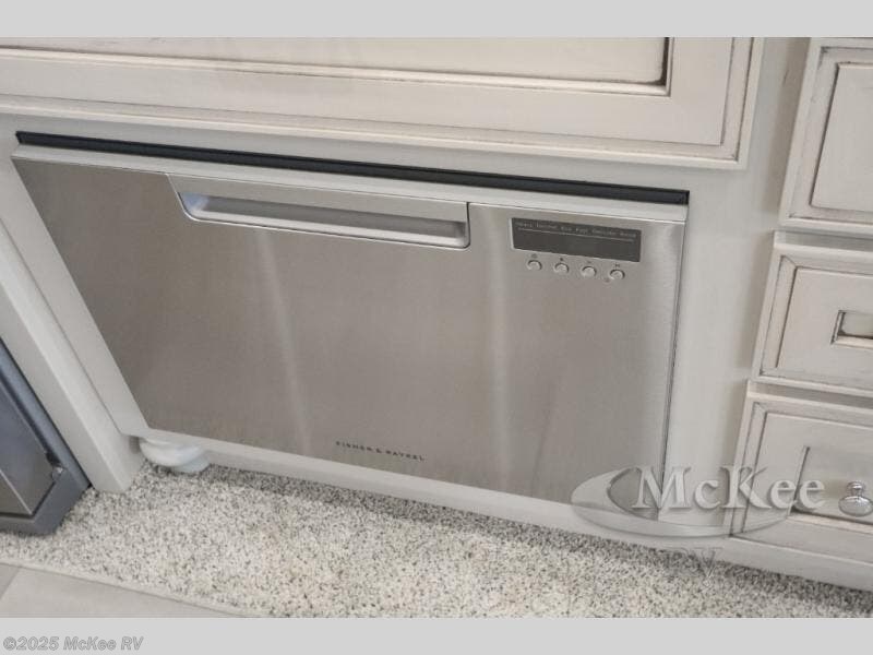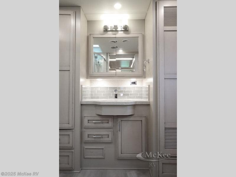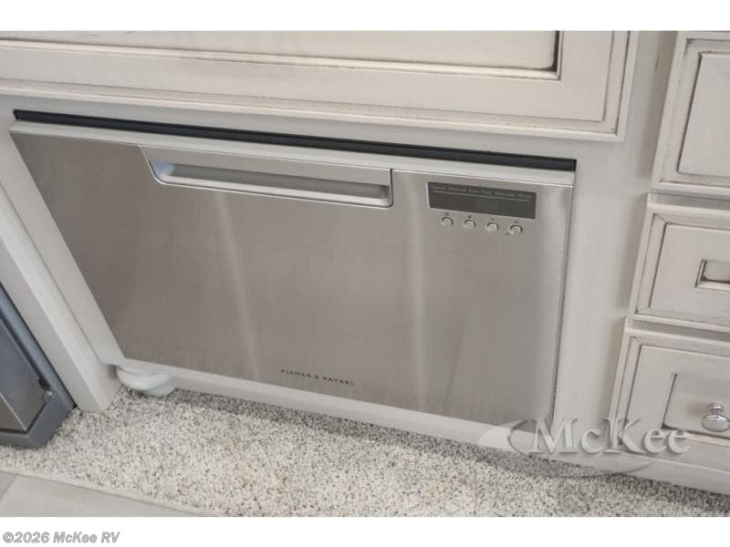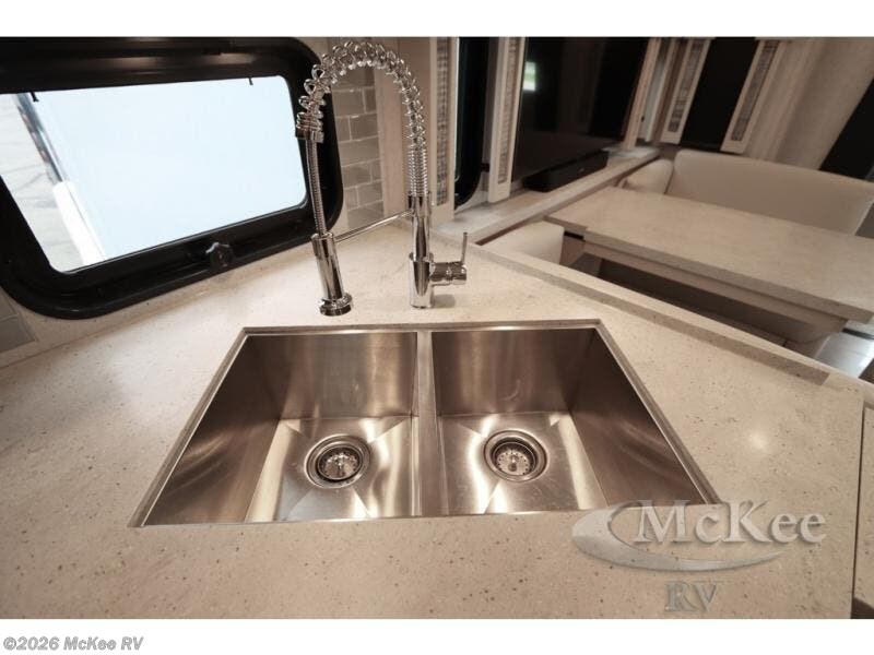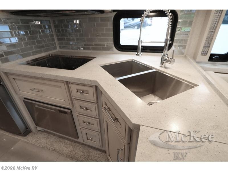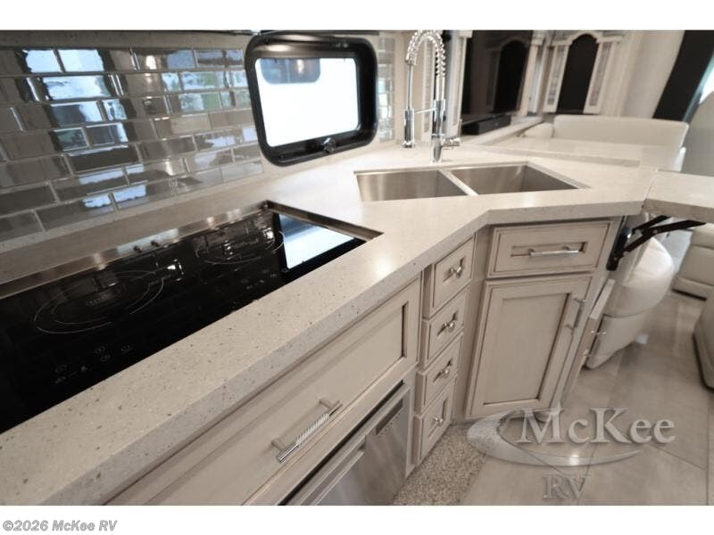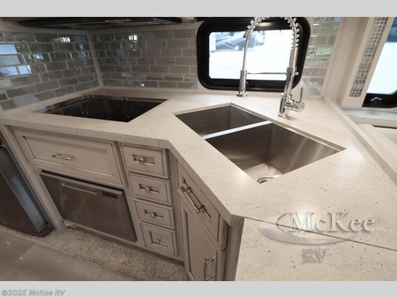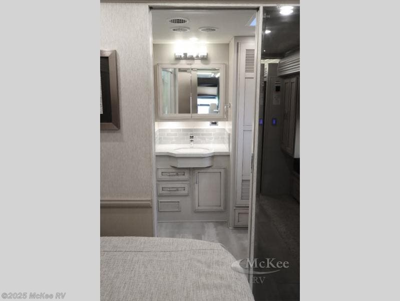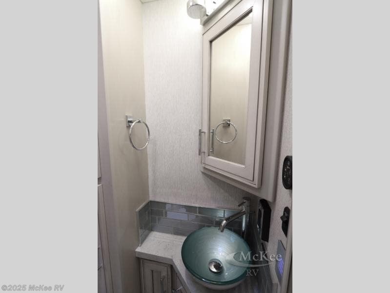 Everyone will stay squeaky clean in this motorhome with a bath and a half! The full rear bathroom has a 35" x 35" radius shower, a closet prepped to add the optional washer and dryer, and a wardrobe with bi-folding doors, plus an emergency exit door behind the toilet. As you walk through the private bedroom, you will see a king bed and shirt wardrobes on either side of a dresser with a Samsung 4K TV above it. The half bathroom is conveniently by the kitchen so you can get back to cooking a delicious meal on the recessed three burner gas cooktop. You can enjoy your meals at the booth dinette then relax in true comfort on the 87" hide-a-bed sofa with two ottomans to rest your feet on!