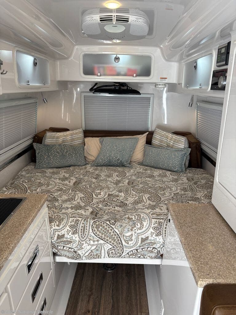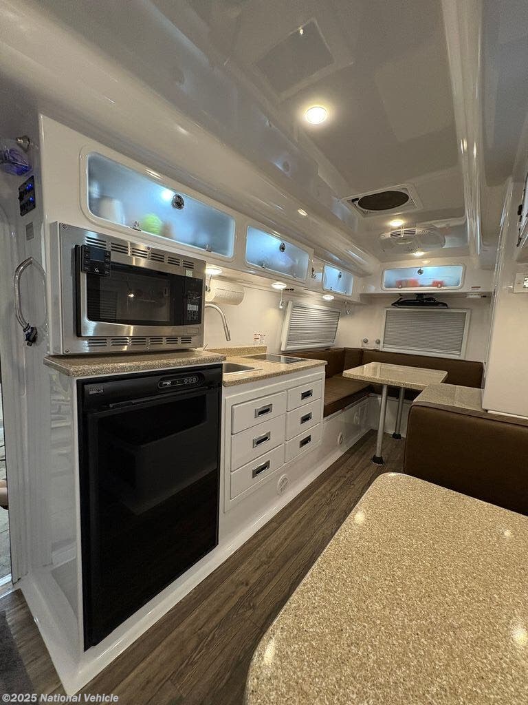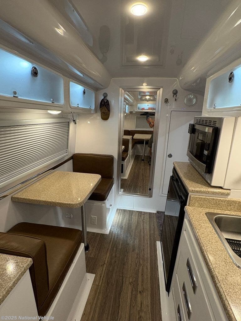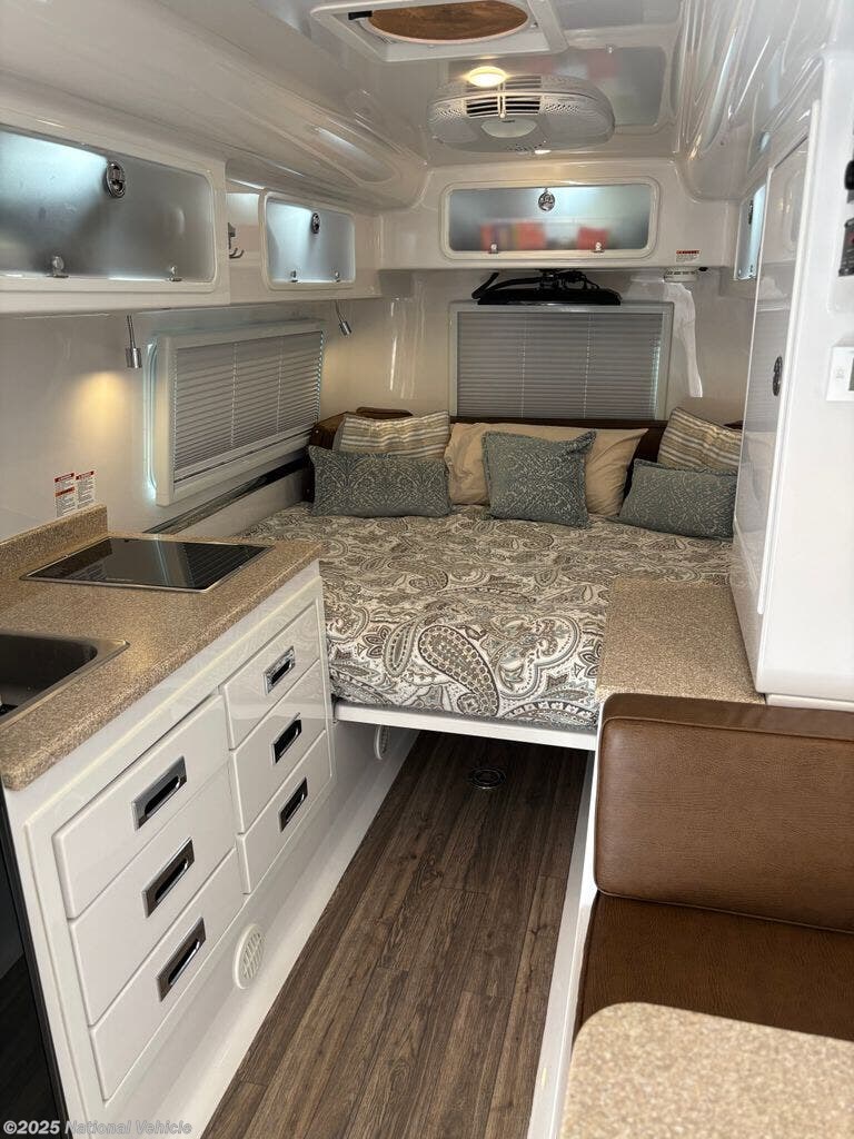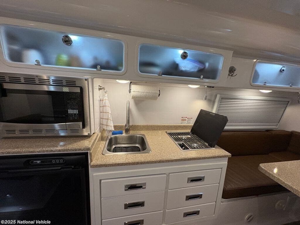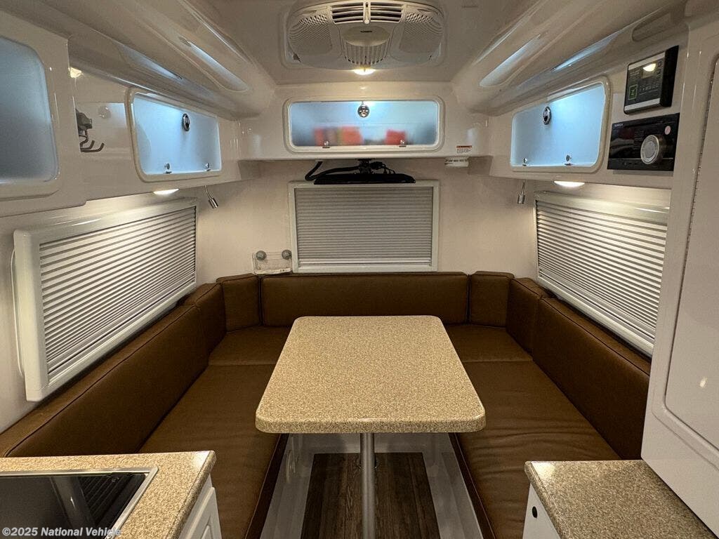 Inside, you?ll find a thoughtfully designed layout featuring a rear dinette that converts into a massive 80" bed, a fully equipped kitchen with solid-surface countertops, a two-burner stove, microwave, and refrigerator. The wet bath includes a molded fiberglass shower and marine-grade components for easy cleaning and durability.