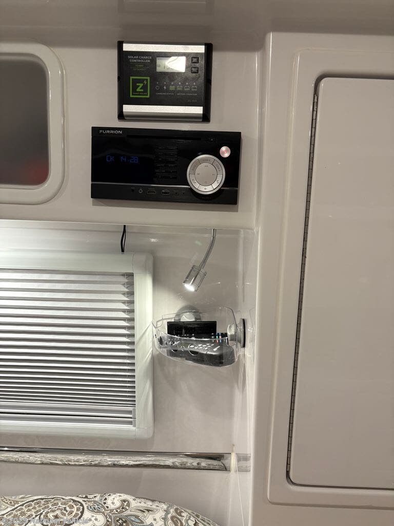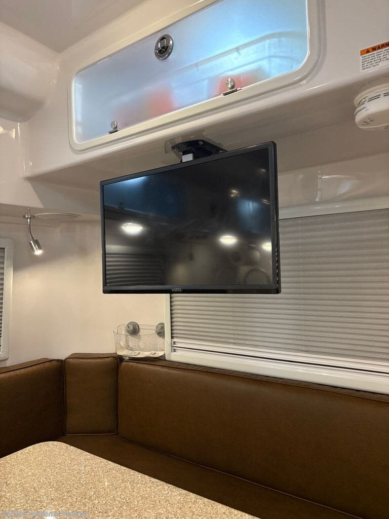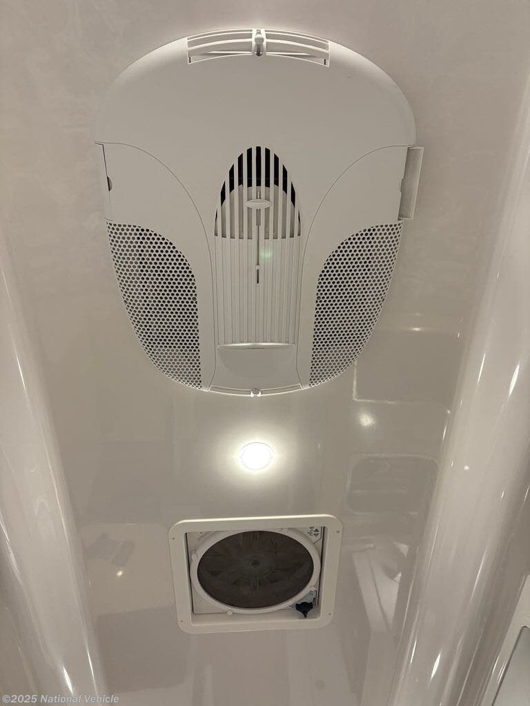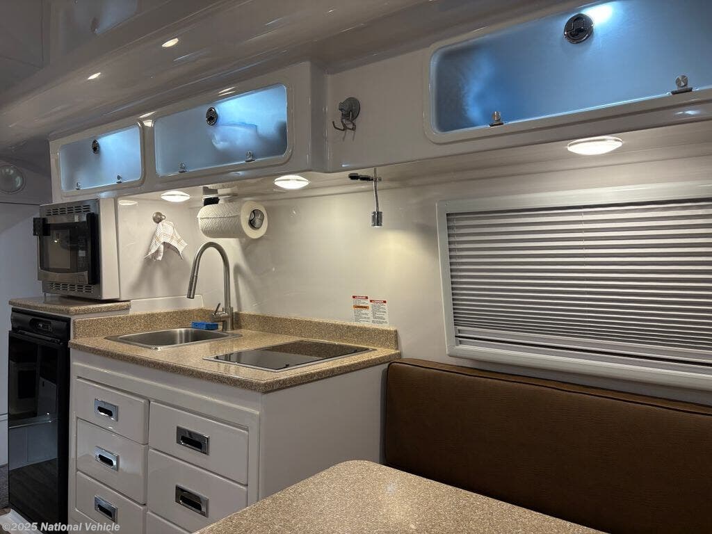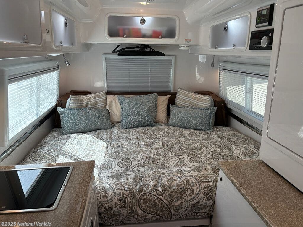 Inside, you?ll find a thoughtfully designed layout featuring a rear dinette that converts into a massive 80" bed, a fully equipped kitchen with solid-surface countertops, a two-burner stove, microwave, and refrigerator. The wet bath includes a molded fiberglass shower and marine-grade components for easy cleaning and durability.