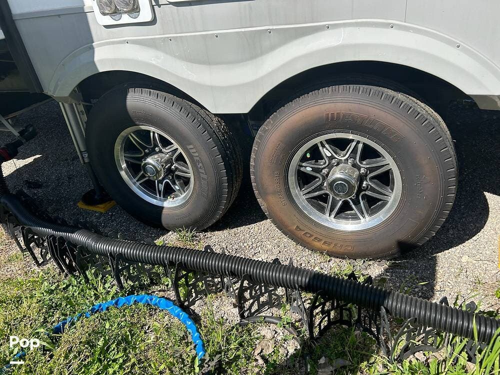 This model includes slam latches on storage doors, 2-tone aluminum wheels, a painted fiberglass front cap, and a heated utility convenience center. Additionally, it offers an outside shower, an outside FM/Bluetooth receiver with a USB port, and a full-view entry door with a window and screen door.