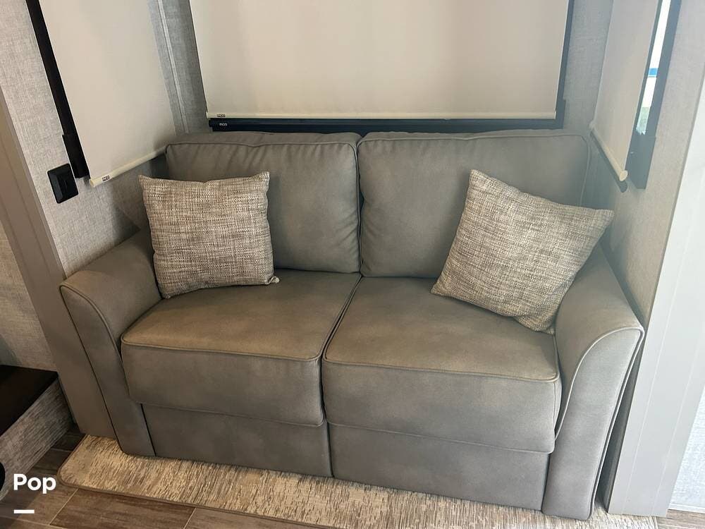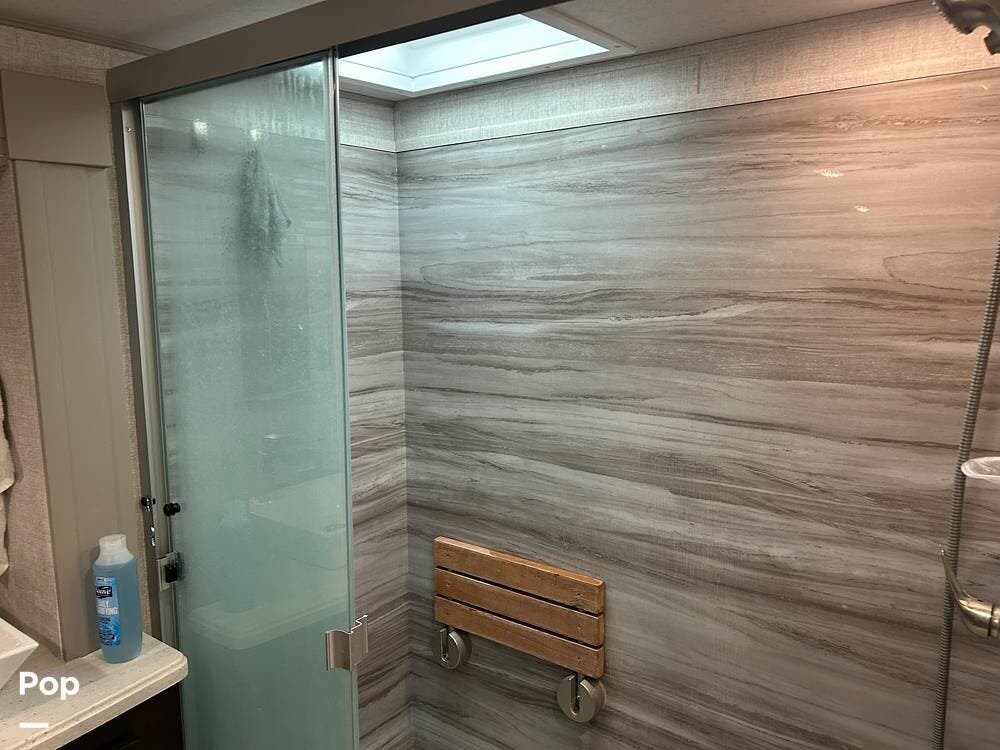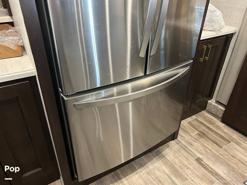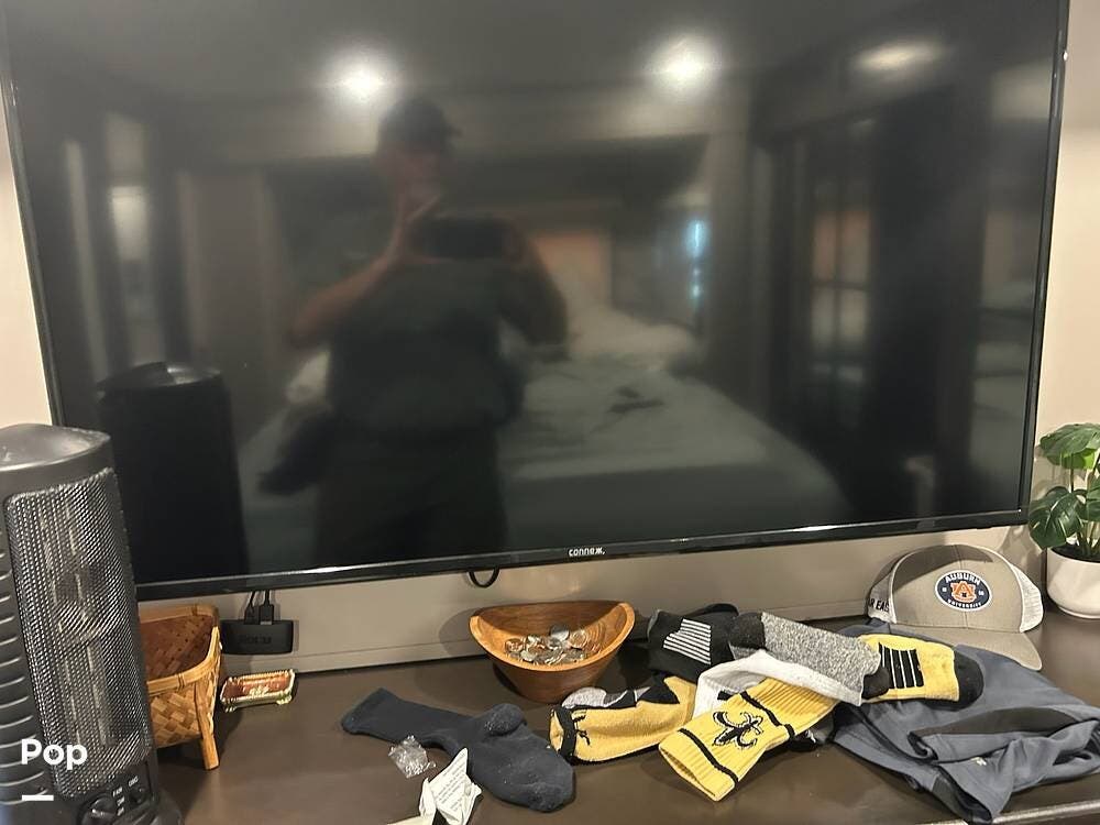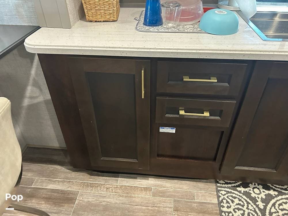 The interior boasts large frameless tinted windows, solid wood slide fascia, roller day/night shades, and residential crown molding. It has soft close constructed reinforced doors & drawers with upgraded hardware, upgraded crack/mold/mildew-resistant flooring, and true solid surface countertops in both the bath and kitchen.