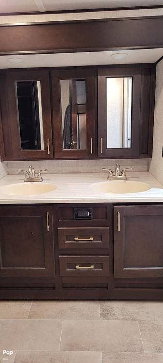 The full-size bathroom and shower are very family-friendly, extremely roomy, and center-located. The double bathroom sink is built into a slide, which greatly expands the size of the bathroom.