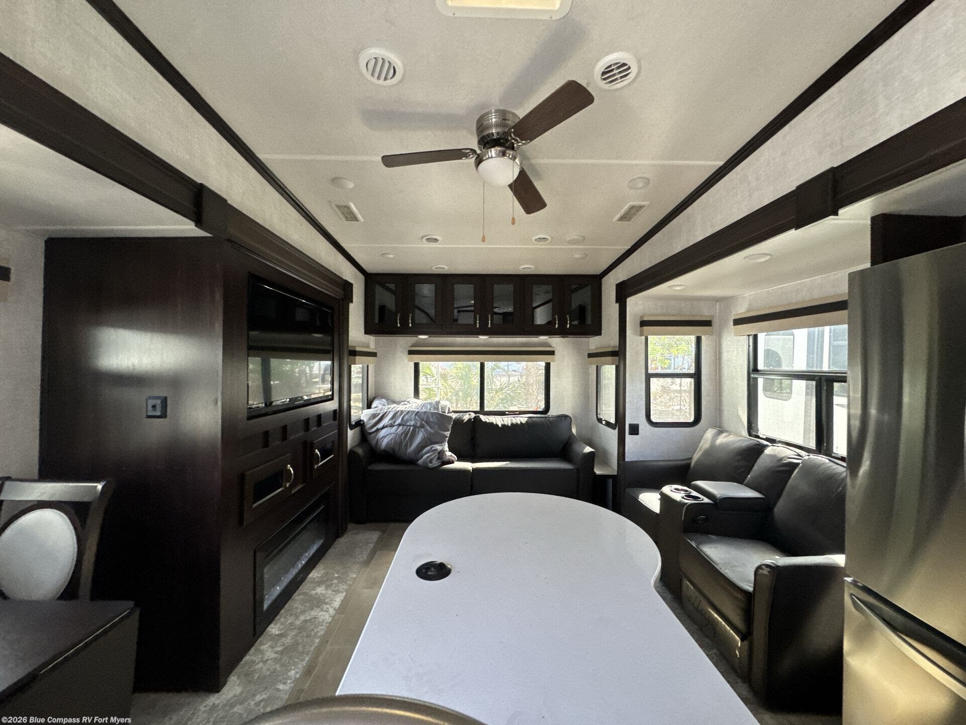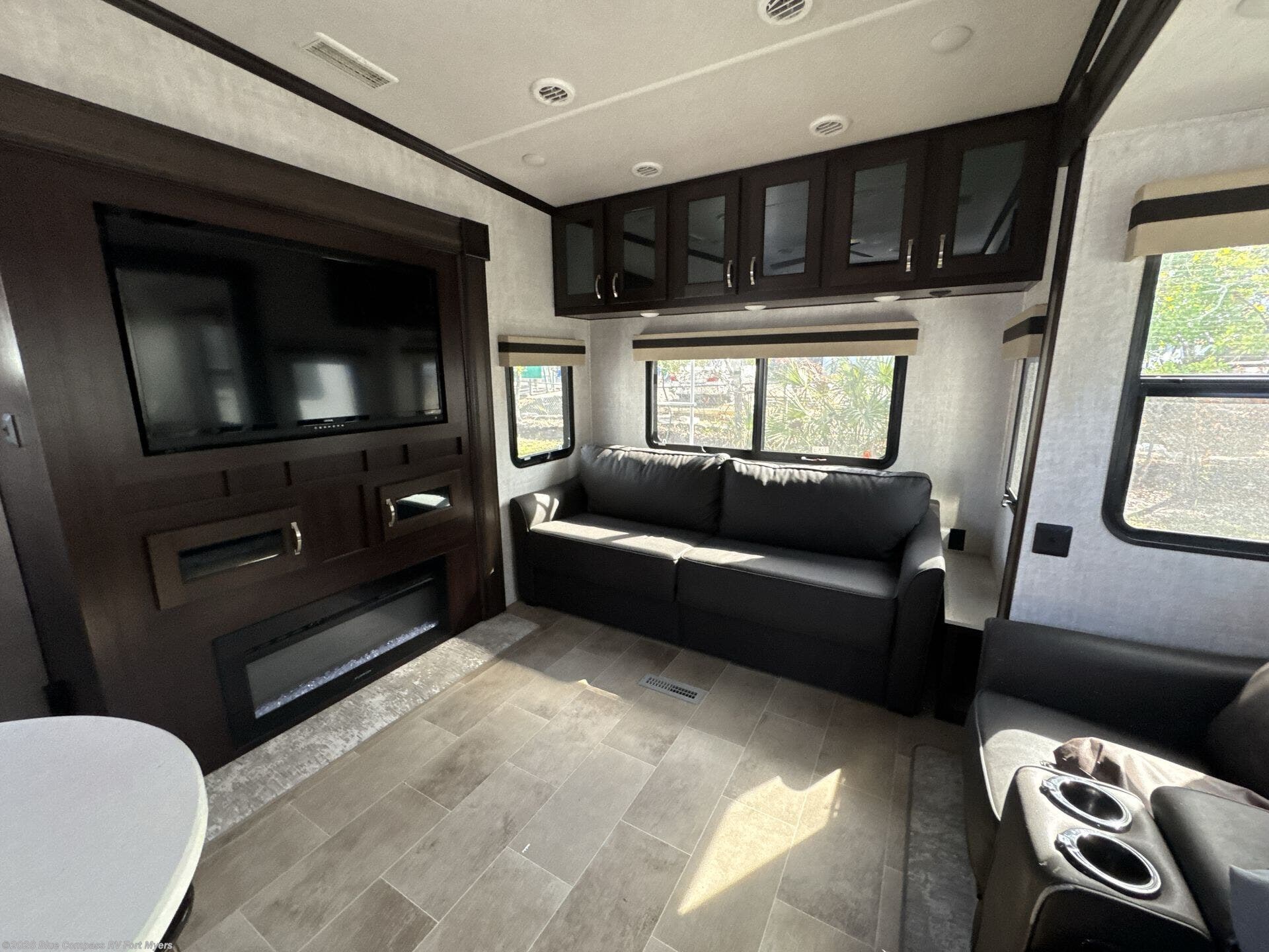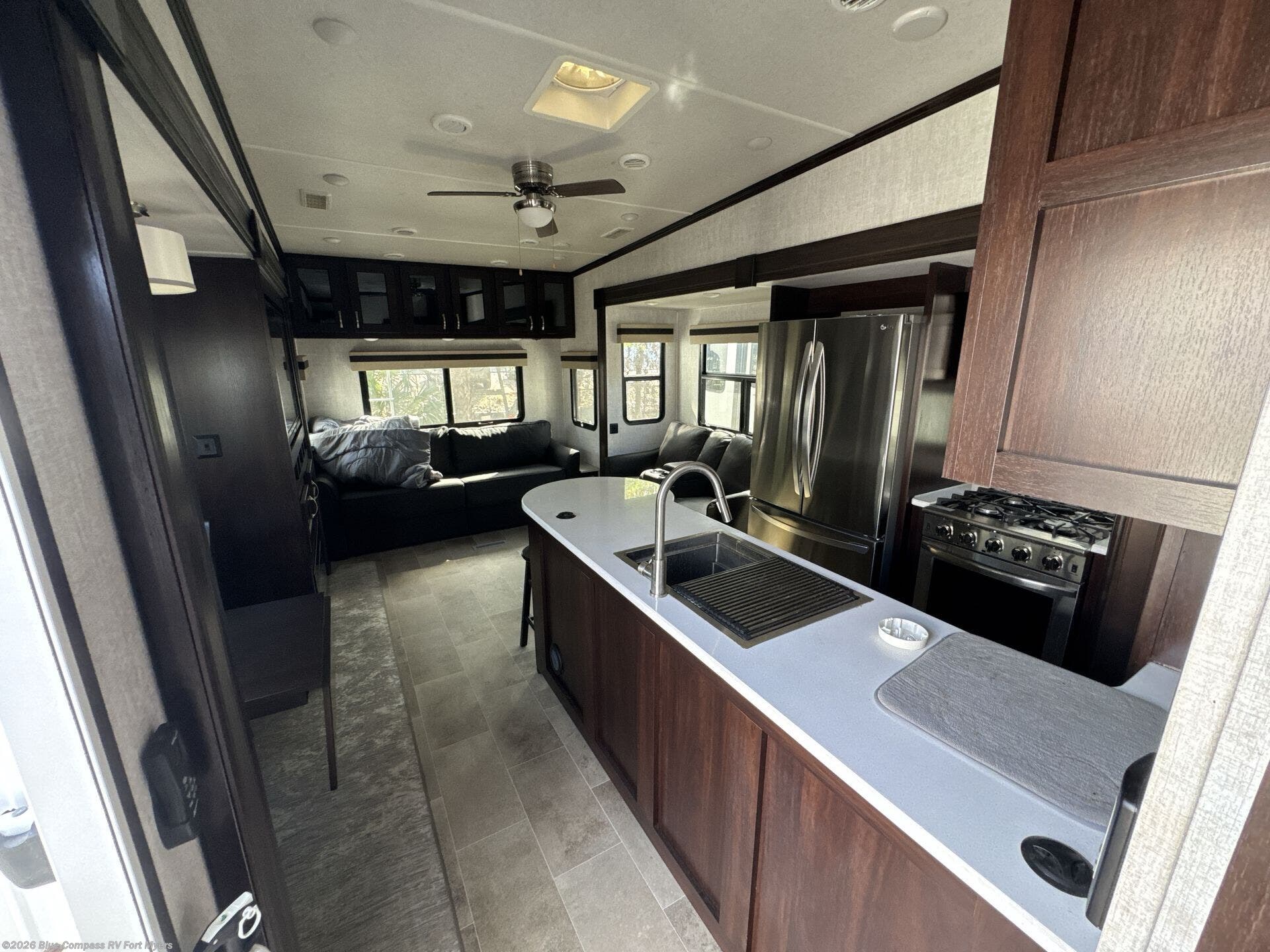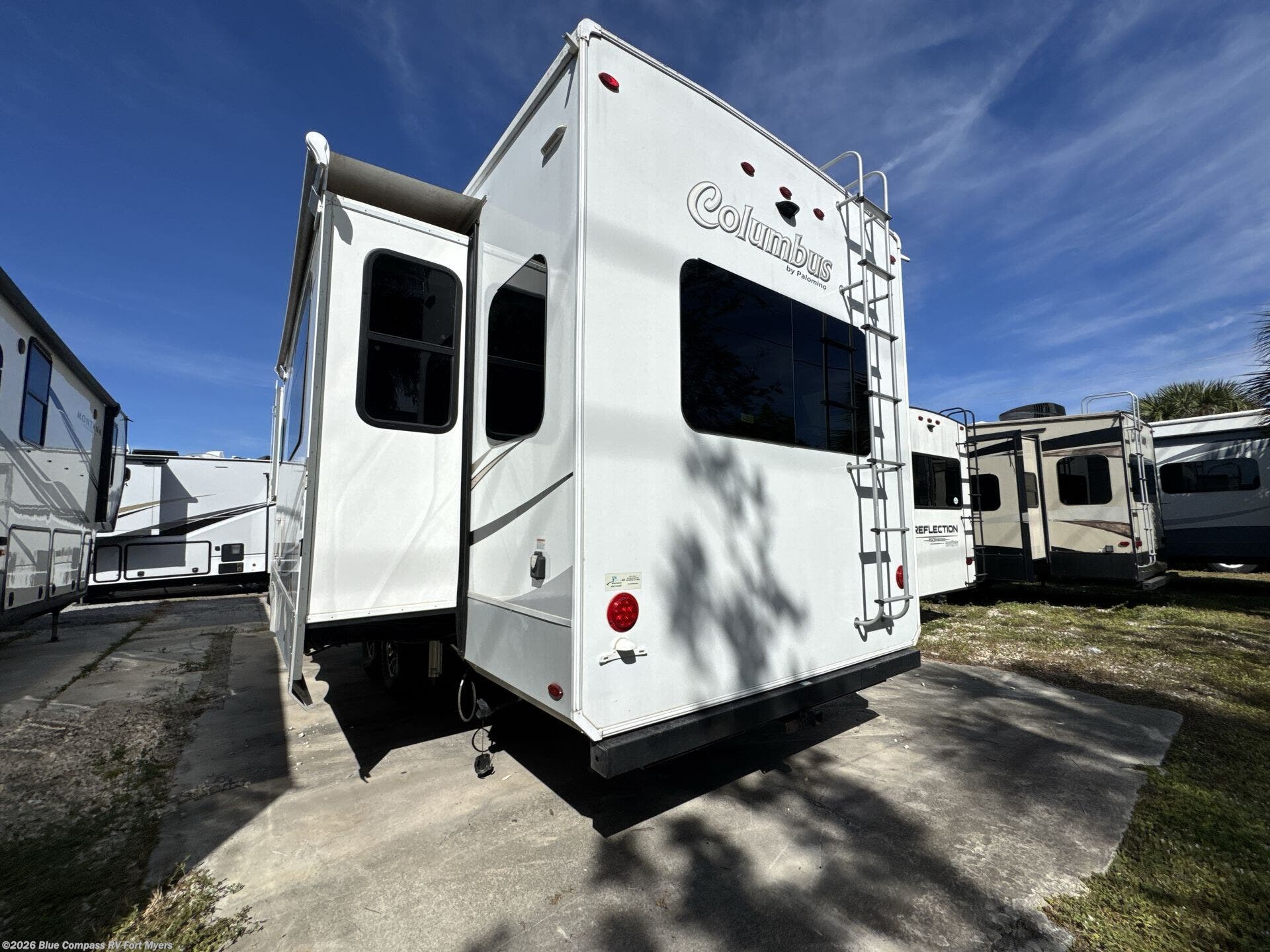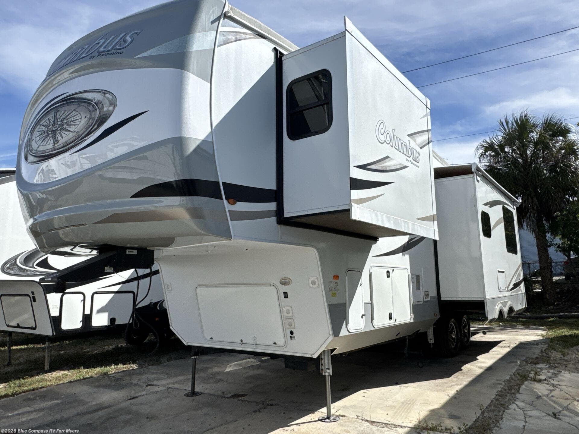 Luxury and convenience can be found in every detail throughout this Columbus Compass fifth wheel. From the front master bedroom with a pillowtop mattress and plenty of storage to the combined living and kitchen area with opposing slides, you will appreciate all that this unit has to offer. You can entertain other campers with the 65" theater seating and invite guests to stay the night on the 88" tri-fold sofa. Your friends will enjoy using your large walk-in shower with a seat and taking in the beautiful sunshine through the skylight dome above. When you want to carry the party outside, the exterior kitchen comes in handy for cooking meals outdoors. What are you waiting for? Choose this model today!