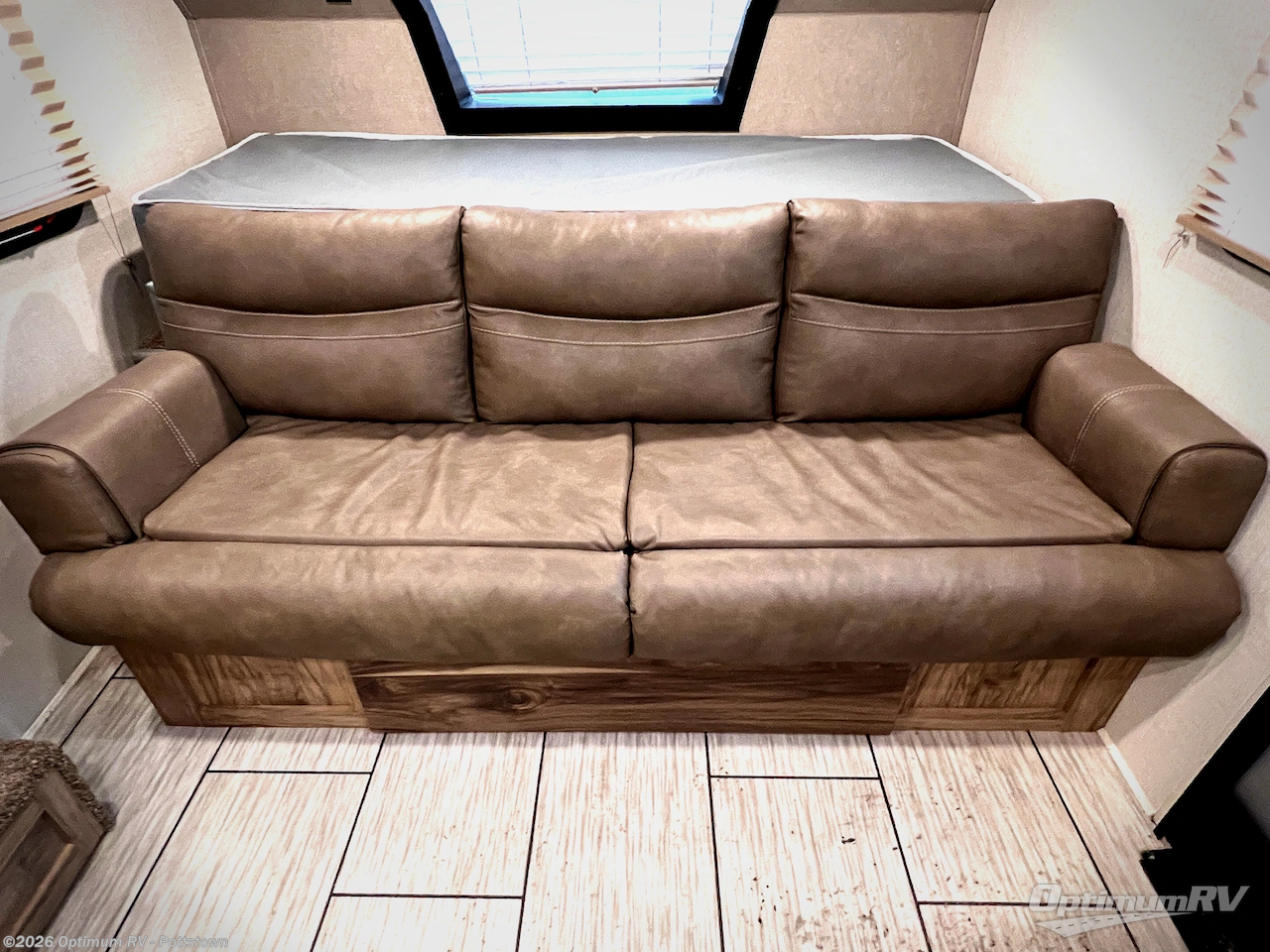 The 36" x 70" dinette slide offers dining and sleeping space as well as extra floor space for everyone in this PaloMini travel trailer! Tired campers will love having bunk beds to call their own at night as well as on rainy days, and having the private toilet and shower room just steps away is convenient. The queen Murphy bed up front gives you your own bedding, and in the morning you can easily push the bed back into the wall to relax on the sofa. Someone can make warm meals using the cooktop, heat leftovers in the microwave, and store food in the refrigerator and pantry. And the power awning outside creates an outdoor living area protected by the elements.