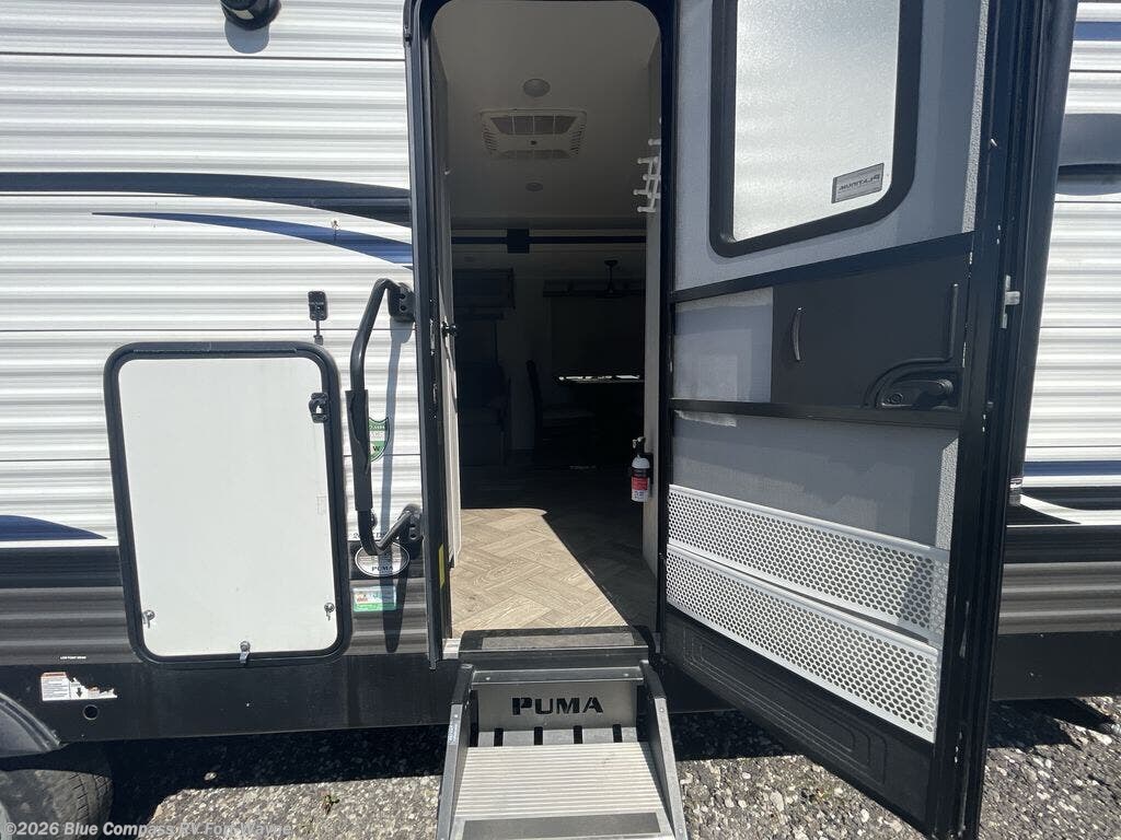 Just imagine the amazing memories you'll be able to make with this Puma travel trailer! This trailer has plenty of convenience with its two entry doors, and you can make this trailer even more convenient by adding a washer/dryer to the closet that has been prepped for a washer/dryer. The master suite is completely accessible from just about anywhere since it features a main door leading out into the living area, a private entrance into the dual-entry bathroom, and an exterior entrance. As you spend your time up front in the kitchen, you'll appreciate that the sofa and booth dinette rest upon a large slide so that you can have some extra space to prepare dinner or sit down with friends.