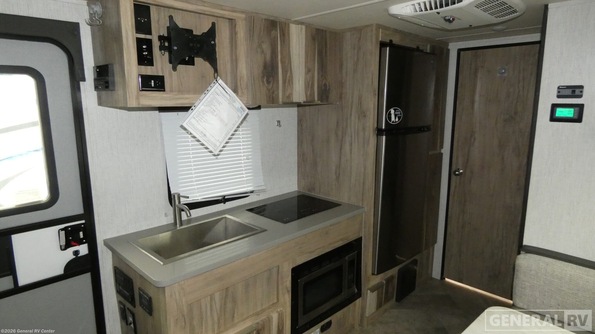 **Palomino Revolve travel trailer EV4 highlights:** * Bunk Beds * Private Toilet & Shower * Booth Dinette * 24" 12V TV * Off Grid Package You and your family will love this trailer! The kids will claim the bunk beds and you will have a queen Murphy bed up front as well as a sofa to relax on during the daytime! The kids can even invite a friend to sleep on the booth dinette. The cook will enjoy making meals using the two burner stove and the convection microwave, and the refrigerator can store leftovers plus the pantry will hold your snacks. And the toilet and shower room offers privacy when changing and getting cleaned up. You don't need to revolve your campsite choice around your electrical needs with any one of these Palomino Revolve travel trailers! They are completely solar powered and can charge not only by solar, but also by shore power and tow vehicle, making them a 100% zero emissions RV. There is also an interior monitor panel to provide real time battery bank usage so you won't have to worry about running out of power. The construction promotes better fuel efficiency, and includes Azdel construction, vacuum bonded construction, a gel coat exterior fiberglass for easy cleaning and maintenance, and a fully walkable roof. Make your selection today!