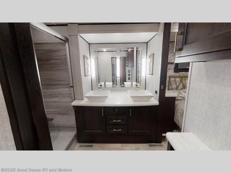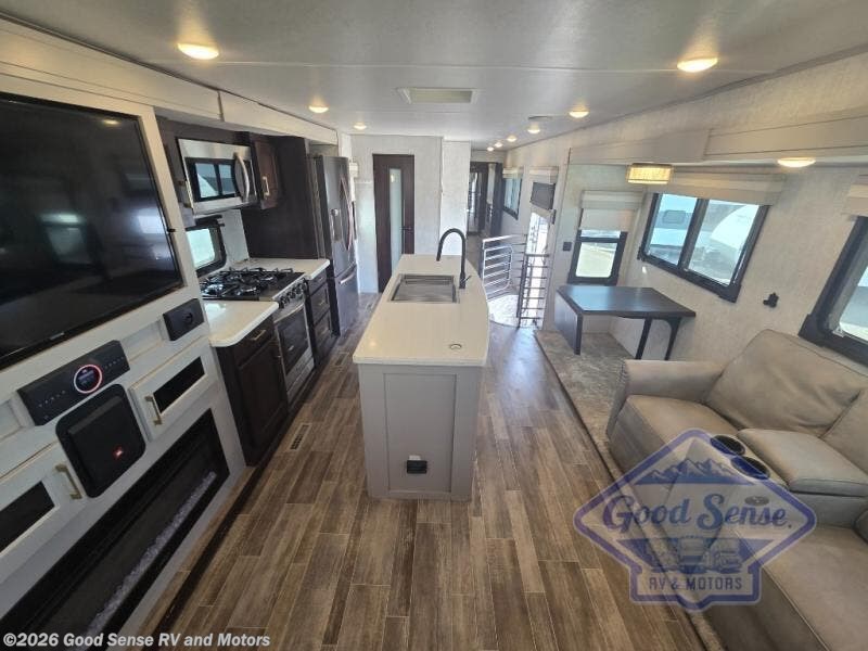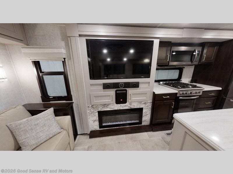 Get ready for comfort on your next trip whether it is to camp at your favorite state park or to relax and unwind at a luxury RV park. This fifth wheel offers a front master suite with a king bed, an entertainment center with pop-up 32" TV and fireplace below, clothing storage and a space prepped for a washer and dryer option. You can easily enter the double entry bathroom through a pocket door to enjoy dual sinks, linen storage and the Signature Spa walk-in shower with teak wood seat. When it is time to make breakfast, the kitchen offers everything you will need plus some with a residential stainless steel four-burner gas range and microwave, a kitchen island plus a walk-in pantry. The two opposing slides offer lots of floor space to stretch out and relax on the split tri-fold sofa, the theatre seats and the wall-mounted free-standing table with extension and residential dinette chairs. The living room also offers a 50" LED TV and fireplace to enjoy. More highlights include the two power awnings, the Go Power Solar prep, the frameless windows, and the basement residential 2-ton Coleman Serenity A/C with heat pump, plus more!