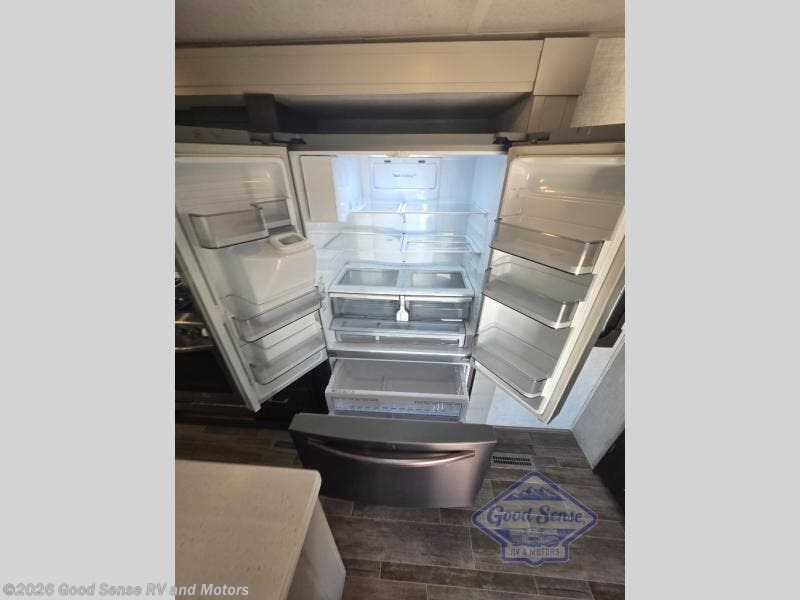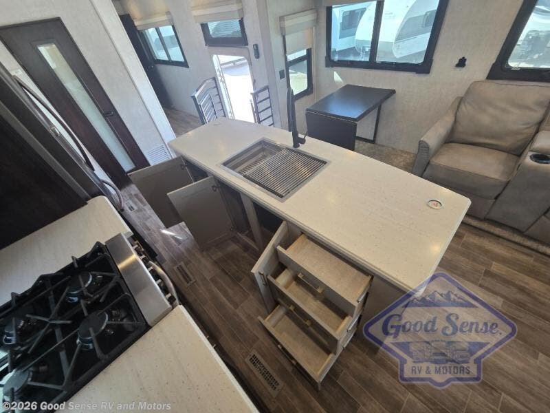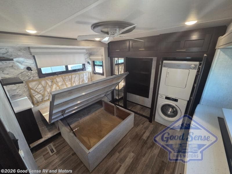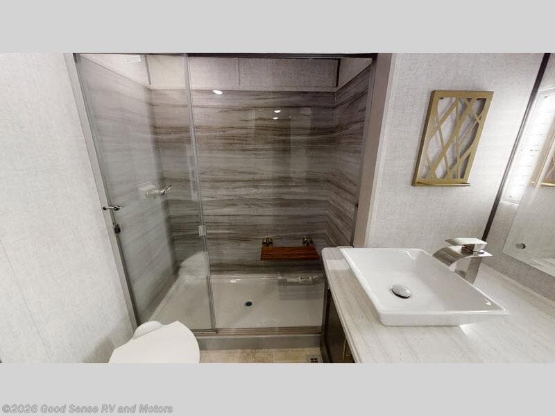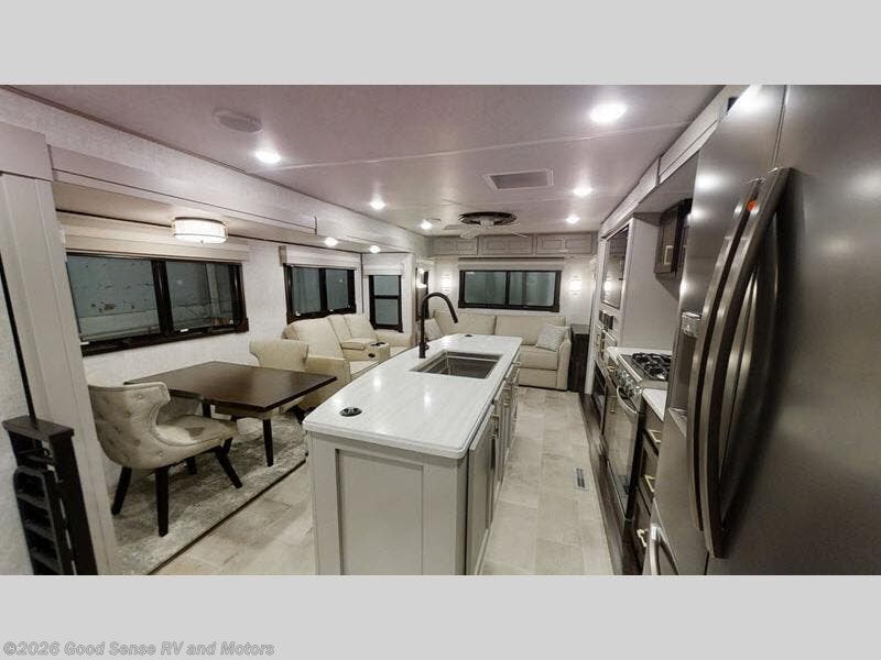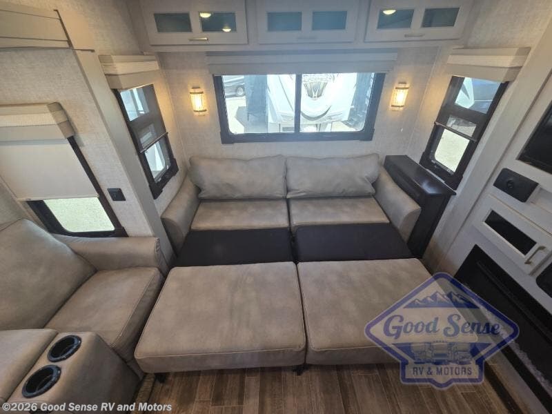 Get ready for comfort on your next trip whether it is to camp at your favorite state park or to relax and unwind at a luxury RV park. This fifth wheel offers a front master suite with a king bed, an entertainment center with pop-up 32" TV and fireplace below, clothing storage and a space prepped for a washer and dryer option. You can easily enter the double entry bathroom through a pocket door to enjoy dual sinks, linen storage and the Signature Spa walk-in shower with teak wood seat. When it is time to make breakfast, the kitchen offers everything you will need plus some with a residential stainless steel four-burner gas range and microwave, a kitchen island plus a walk-in pantry. The two opposing slides offer lots of floor space to stretch out and relax on the split tri-fold sofa, the theatre seats and the wall-mounted free-standing table with extension and residential dinette chairs. The living room also offers a 50" LED TV and fireplace to enjoy. More highlights include the two power awnings, the Go Power Solar prep, the frameless windows, and the basement residential 2-ton Coleman Serenity A/C with heat pump, plus more!