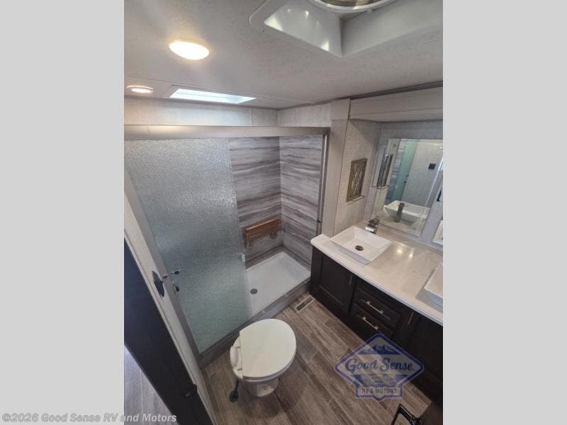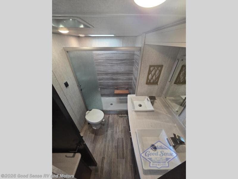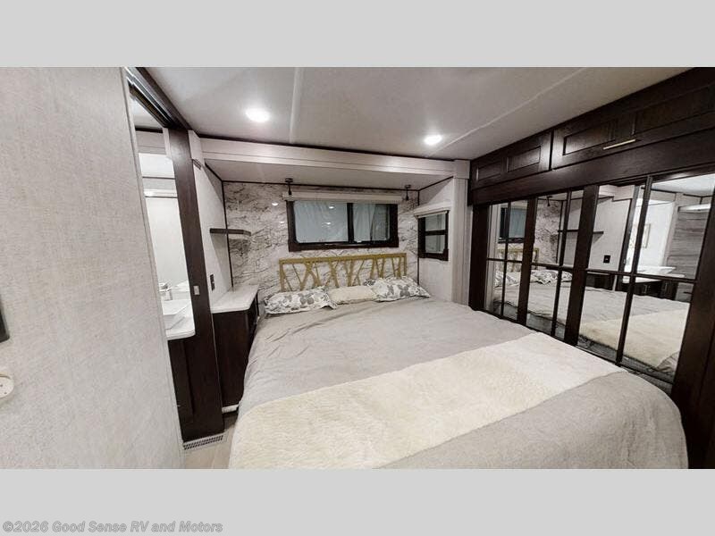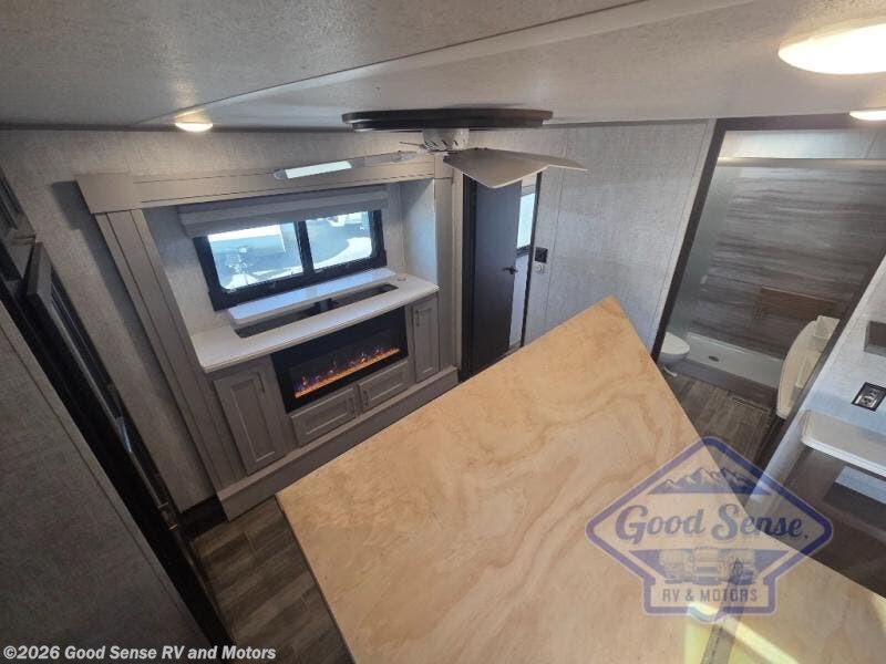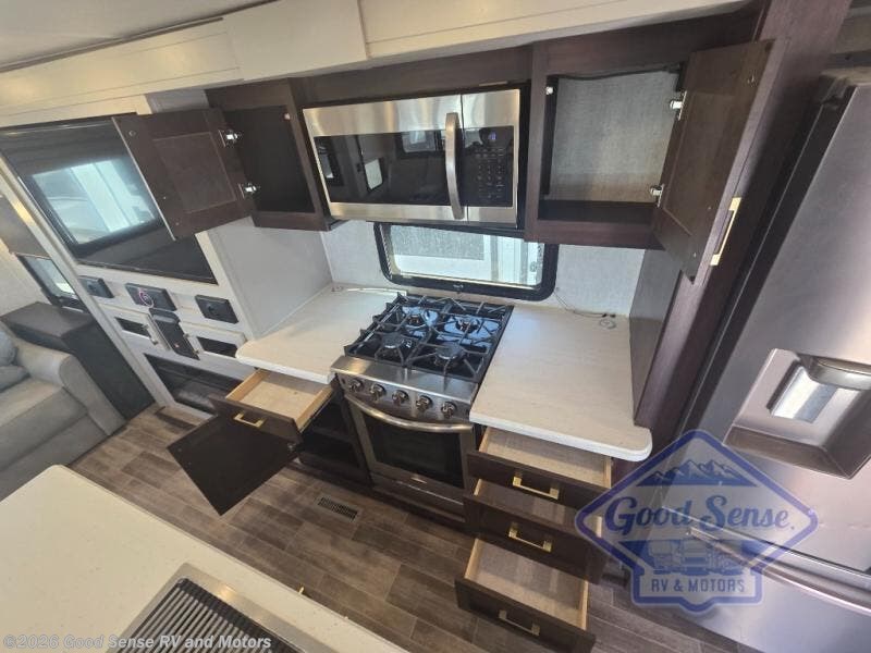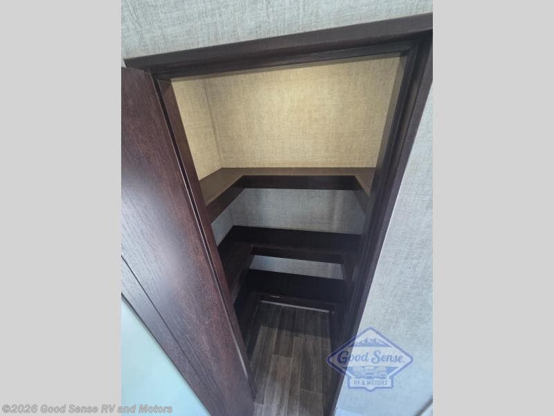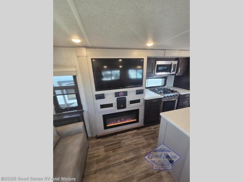 Get ready for comfort on your next trip whether it is to camp at your favorite state park or to relax and unwind at a luxury RV park. This fifth wheel offers a front master suite with a king bed, an entertainment center with pop-up 32" TV and fireplace below, clothing storage and a space prepped for a washer and dryer option. You can easily enter the double entry bathroom through a pocket door to enjoy dual sinks, linen storage and the Signature Spa walk-in shower with teak wood seat. When it is time to make breakfast, the kitchen offers everything you will need plus some with a residential stainless steel four-burner gas range and microwave, a kitchen island plus a walk-in pantry. The two opposing slides offer lots of floor space to stretch out and relax on the split tri-fold sofa, the theatre seats and the wall-mounted free-standing table with extension and residential dinette chairs. The living room also offers a 50" LED TV and fireplace to enjoy. More highlights include the two power awnings, the Go Power Solar prep, the frameless windows, and the basement residential 2-ton Coleman Serenity A/C with heat pump, plus more!