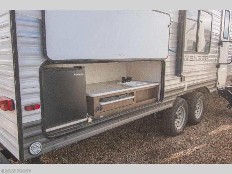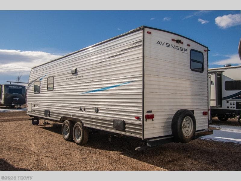 With premium fabrics and beautiful interior décor, the Prime Time Avenger travel trailers offer complete customer satisfaction! The innovative and lasting construction of the Avenger provides you with confidence as you travel. The Avenger is built with a powder-coated I-beam frame, an aluminum exterior skin, a PEX plumbing system, a Dynaspan 5/8" seamless floor decking, a secure tank system, and an extreme weather package. The interior has excellent features to accommodate all sorts of traveling types with its massive under-bed storage, Bluetooth entertainment system, in-floor ducted heat, large fully vented windows, and USB ports. You will also enjoy having an exterior hot/cold shower and a doggy D-ring so that you can rinse off your puppy's paws before taking them back inside for the night.