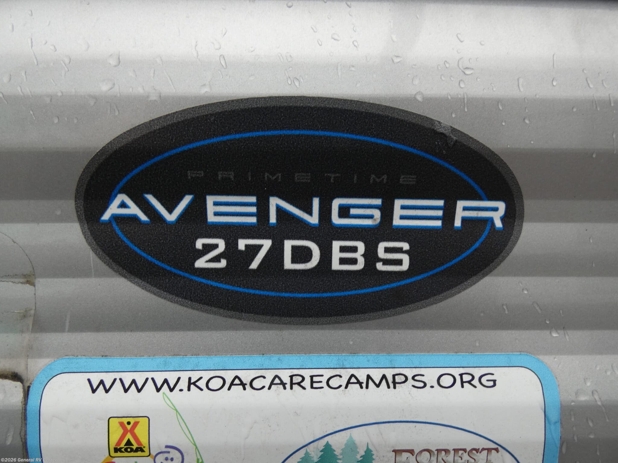 Prime Time Avenger travel trailer 27DBS highlights: Double-Size Bunks Private Bedroom U-Shaped Dinette Single Slide Large LED TV If you are a growing family that enjoys the comforts of home while away exploring at a state park, then you need this Avenger travel trailer. You are sure to enjoy the entertainment center and large LED TV, and the outdoor kitchen will be helpful as you visit with other campers and watch your kids play. From the U-shaped dinette and sofa, to the queen-size bed in the private bedroom and double-size bunks, you will have plenty of space to sleep ten people. With premium fabrics and beautiful interior décor, the Prime Time Avenger travel trailers offer complete customer satisfaction! The innovative and lasting construction of the Avenger provides you with confidence as you travel. The Avenger is built with a powder-coated I-beam frame, an aluminum exterior skin, a PEX plumbing system, a Dynaspan 5/8" seamless floor decking, a secure tank system, and an extreme weather package. The interior has excellent features to accommodate all sorts of traveling types with its massive under-bed storage, Bluetooth entertainment system, in-floor ducted heat, large fully vented windows, and USB ports. You will also enjoy having an exterior hot/cold shower and a doggy D-ring so that you can rinse off your puppy's paws before taking them back inside for the night.
