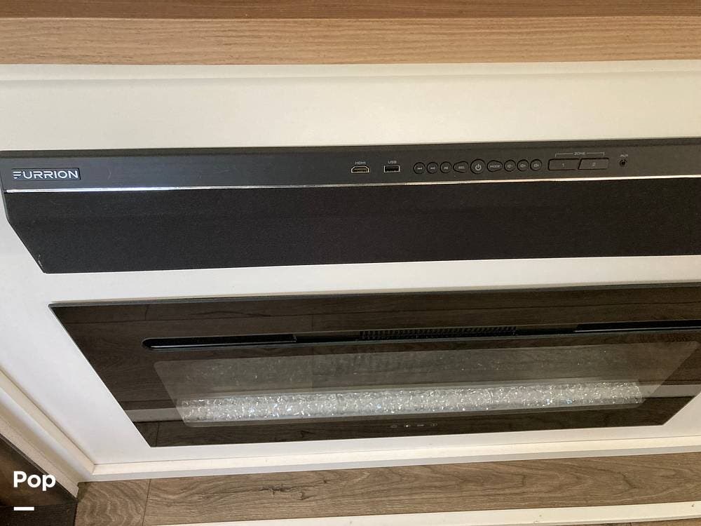 The living area is perfect for relaxing or entertaining, with a large sofa sleeper, an entertainment center with a large HDTV, a soundbar, and a fireplace. The Stadium Style recliners have a perfect view of the TV.