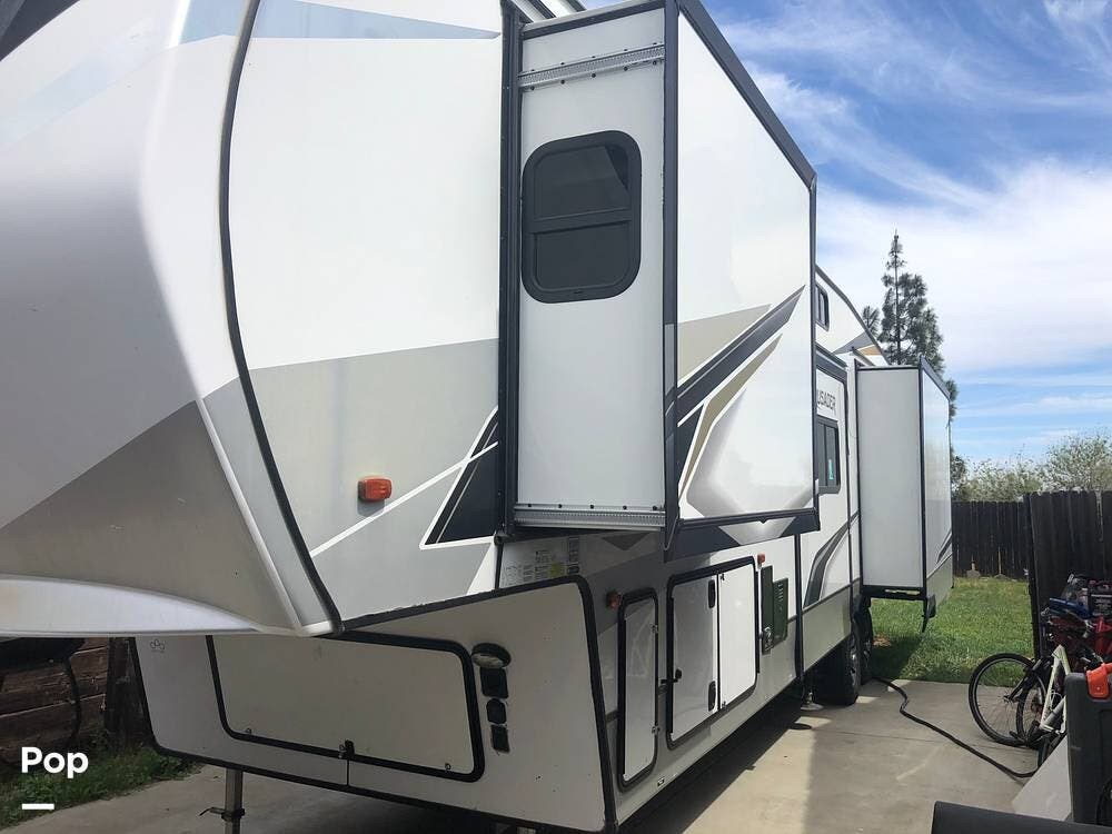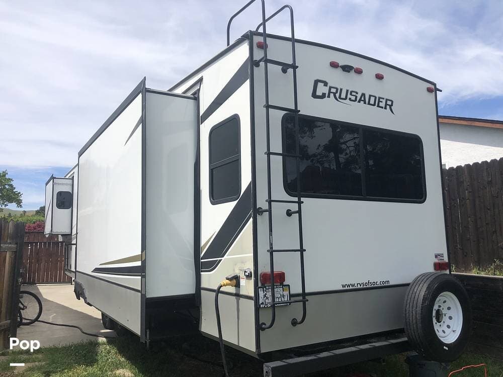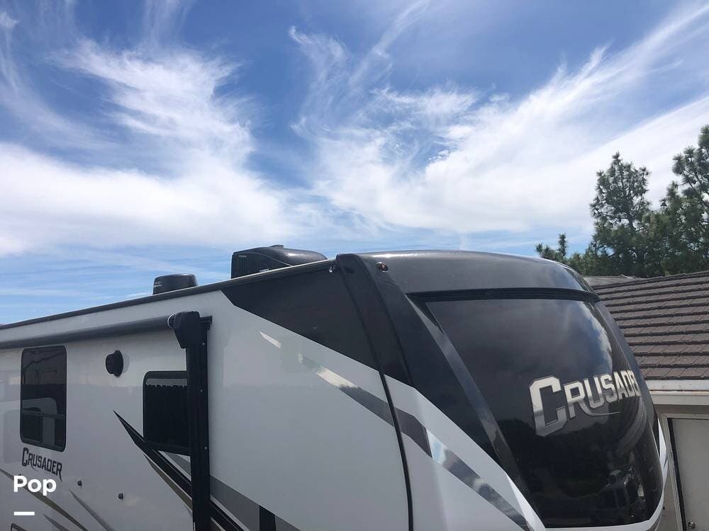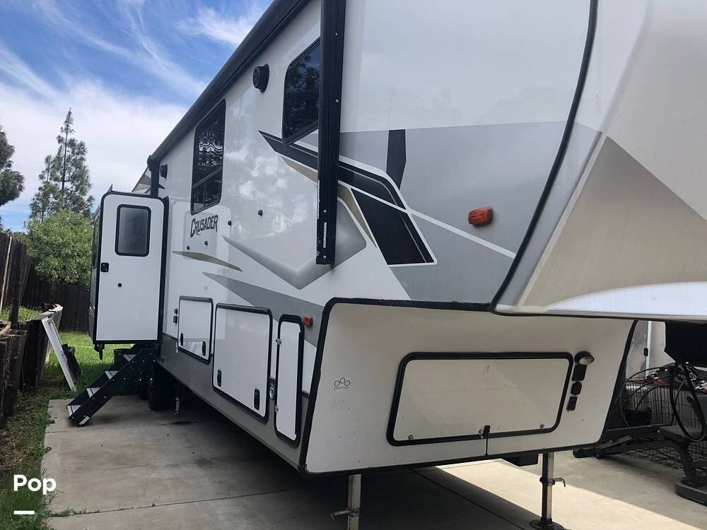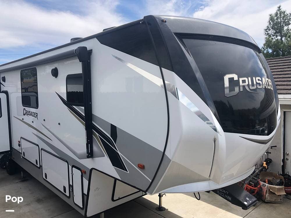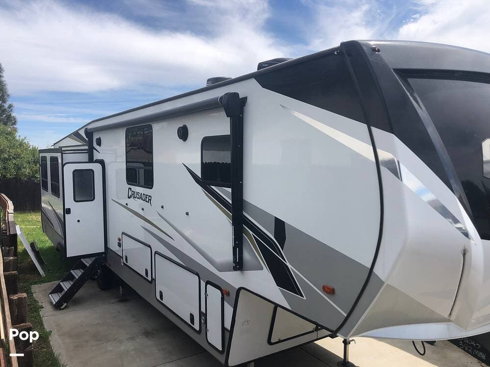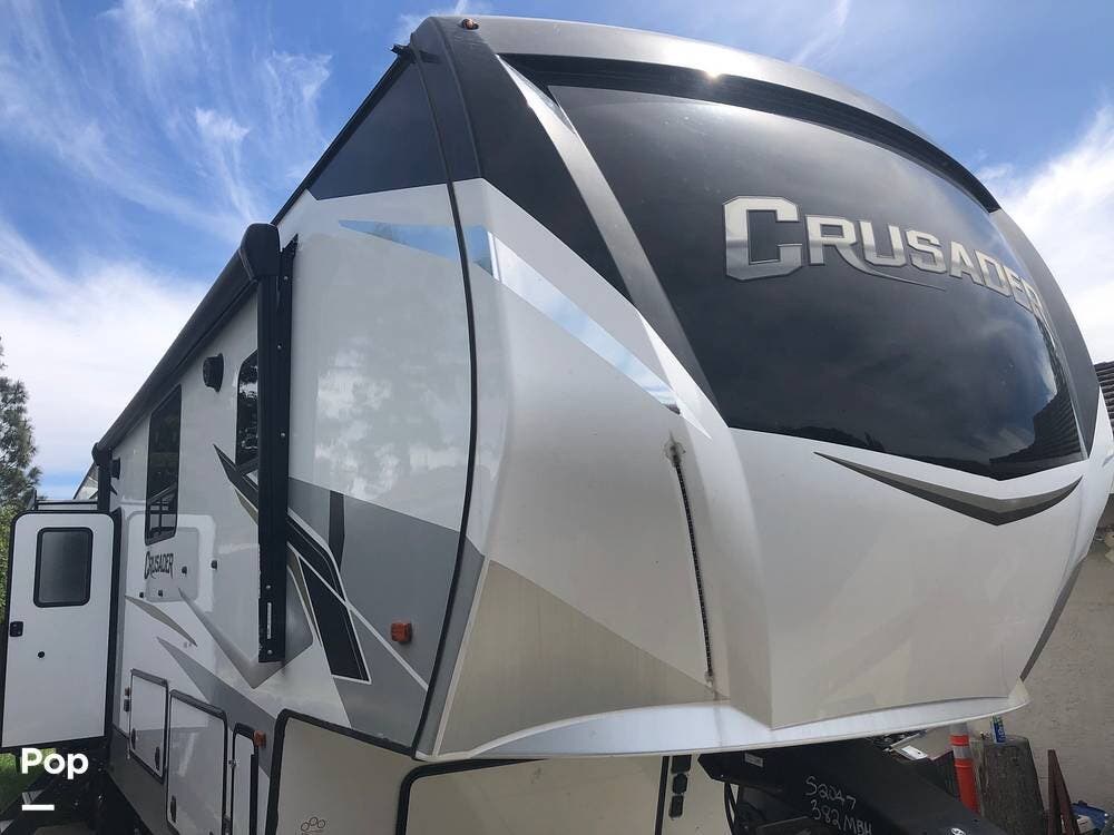 Experience luxury and versatility with this single-owner 2021 Crusader 382MBH fifth wheel, a standout model from Prime Time's lineup.