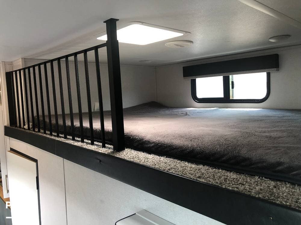 Above the bunkhouse, a cozy loft area offers additional sleeping space, perfect for kids or guests. At the front, the master bedroom boasts a king-size bed, a large wardrobe with washer/dryer hookups, and ample storage, ensuring a restful retreat.