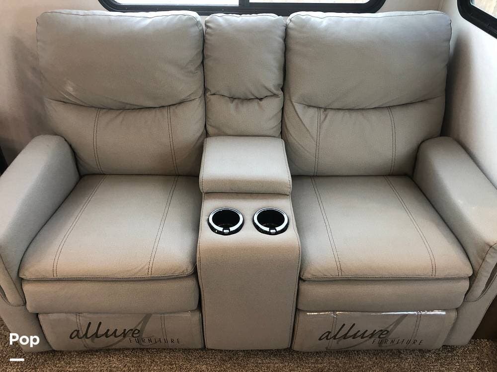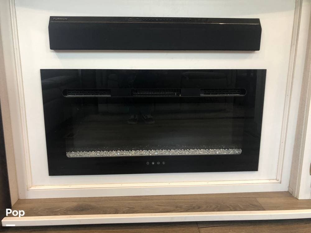 The rear living area is a relaxing haven, featuring theater-style recliners, a sleeper sofa, a fireplace, and an LED Smart TV.