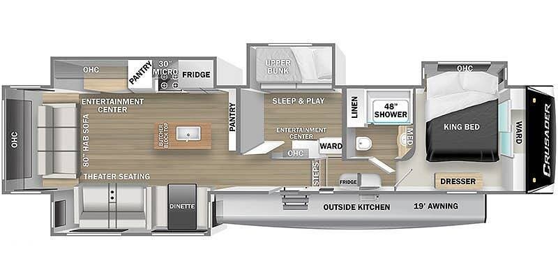 Constructed with durability in mind, the Crusader 382MBH features Eternabond five-sided lamination, a one-piece PVC roof, and a high-gloss gel coat fiberglass exterior. The RV has dual 15,000 BTU air conditioners, a 35,000 BTU high-capacity gas furnace, and a tankless on-demand water heater, ensuring comfort in any season. The Extreme Thermal Package Plus provides additional insulation, making year-round camping a reality.