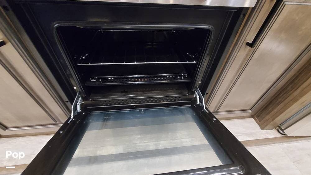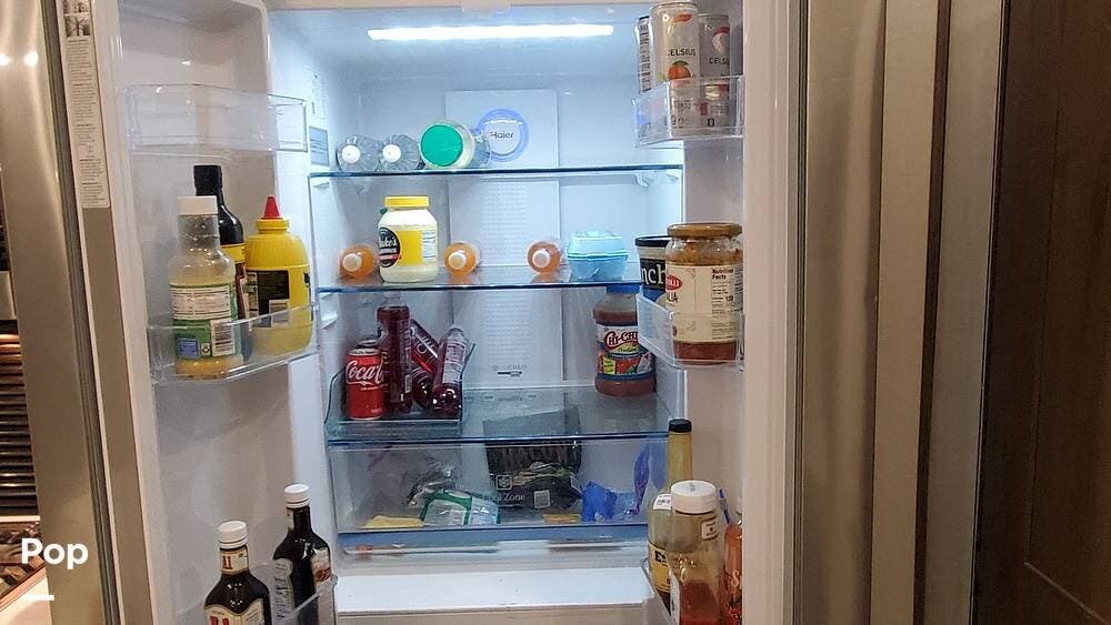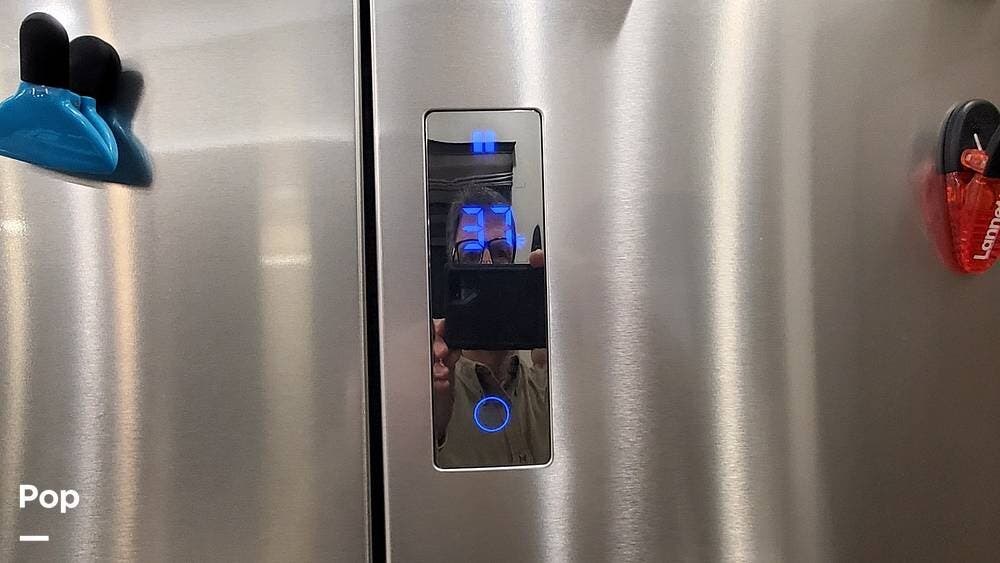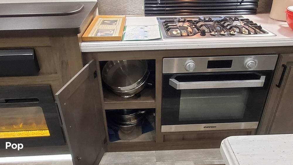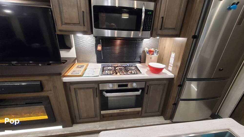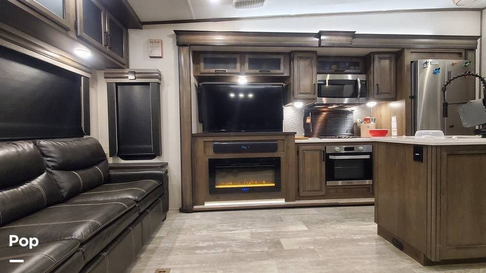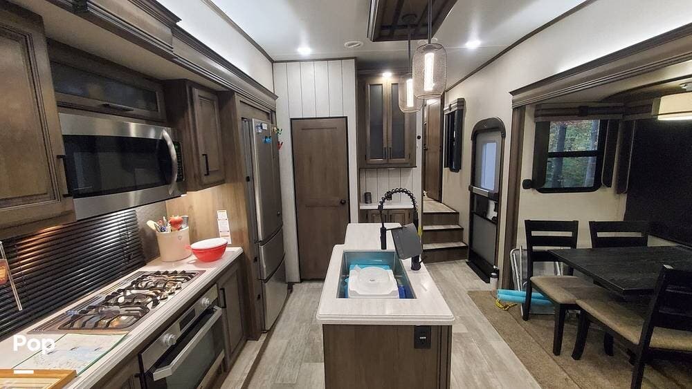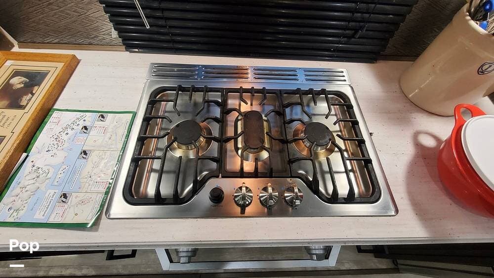 The galley has a kitchen island with a deep flush-mount sink, a Furrion Residential cooktop/oven, and a 15 CU.FT refrigerator and solid surface countertops.