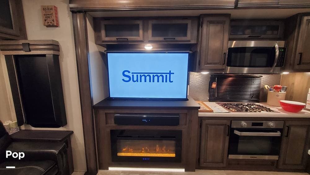 Your living room has a TV lift entertainment center with an electric fireplace and stereo with a soundbar.