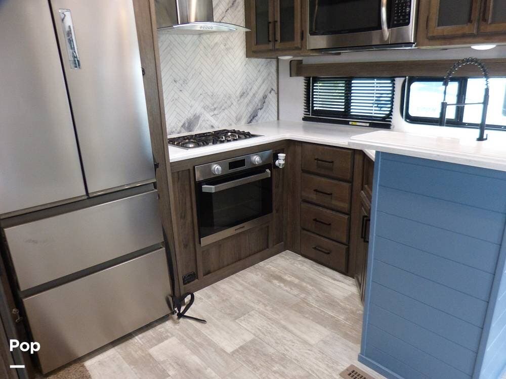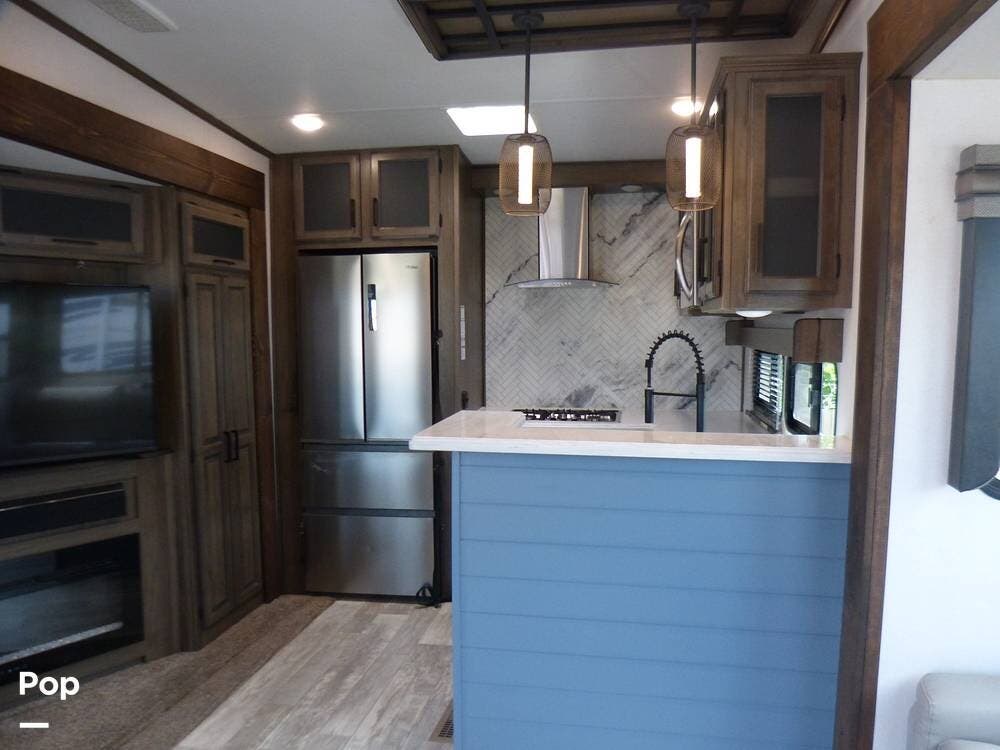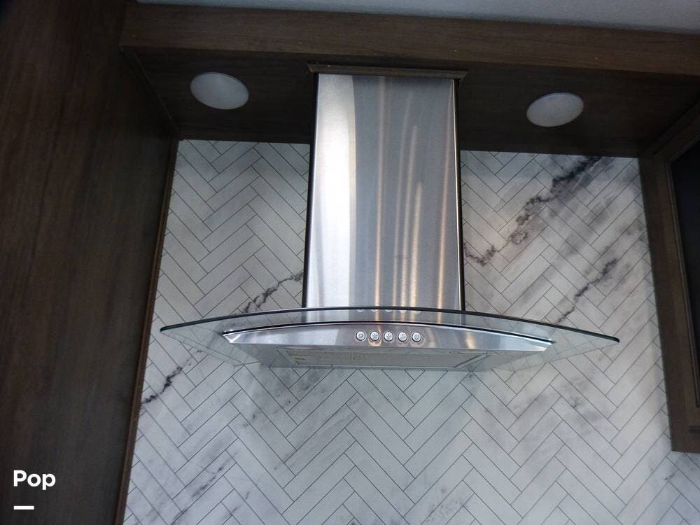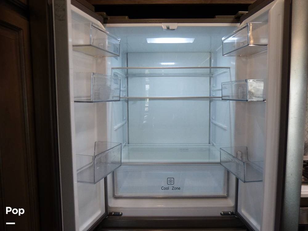 The kitchen is roomy and very inviting, with its designer lighting, Furrion Chef Collection appliances, beautiful backsplash and oven hood, and large refrigerator freezer with tons of freezer storage.