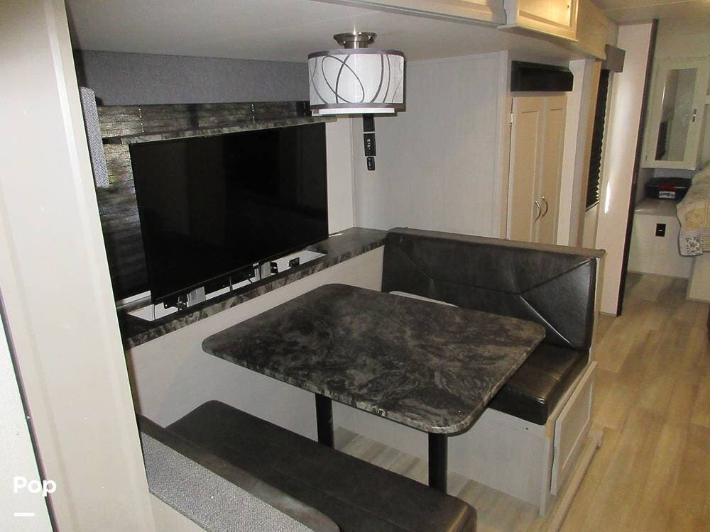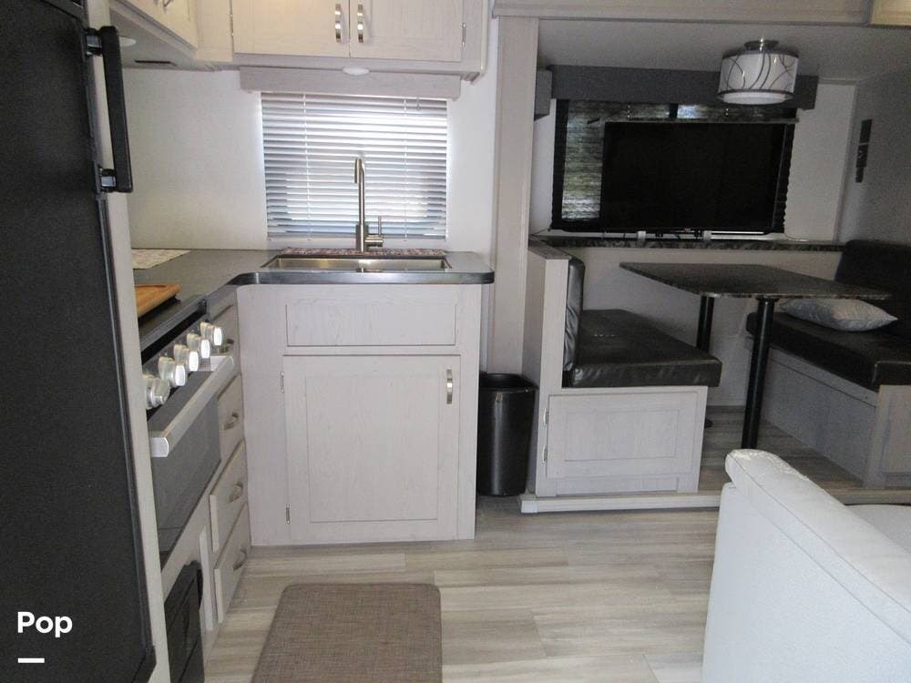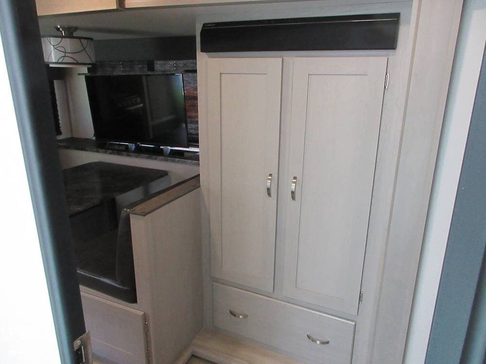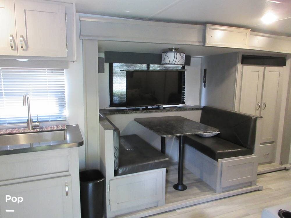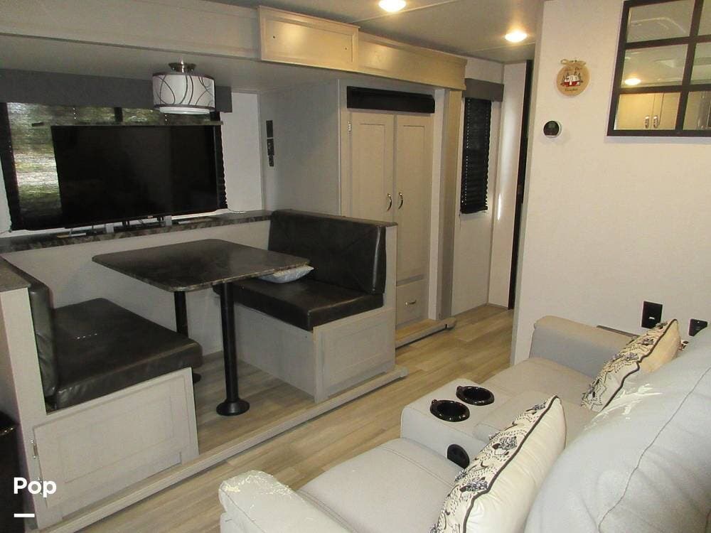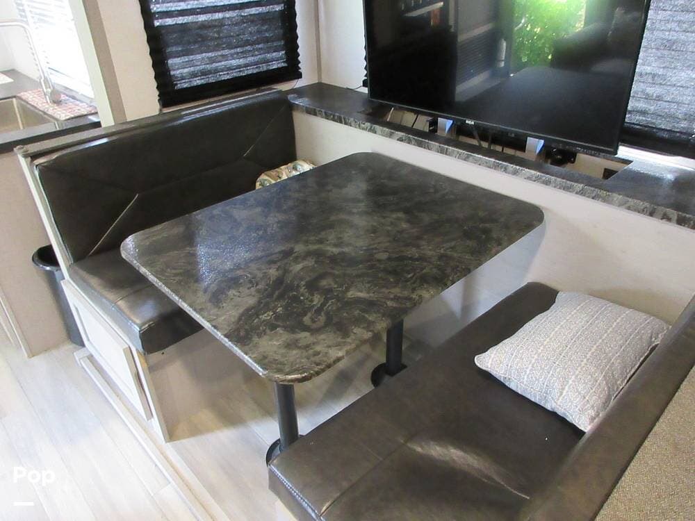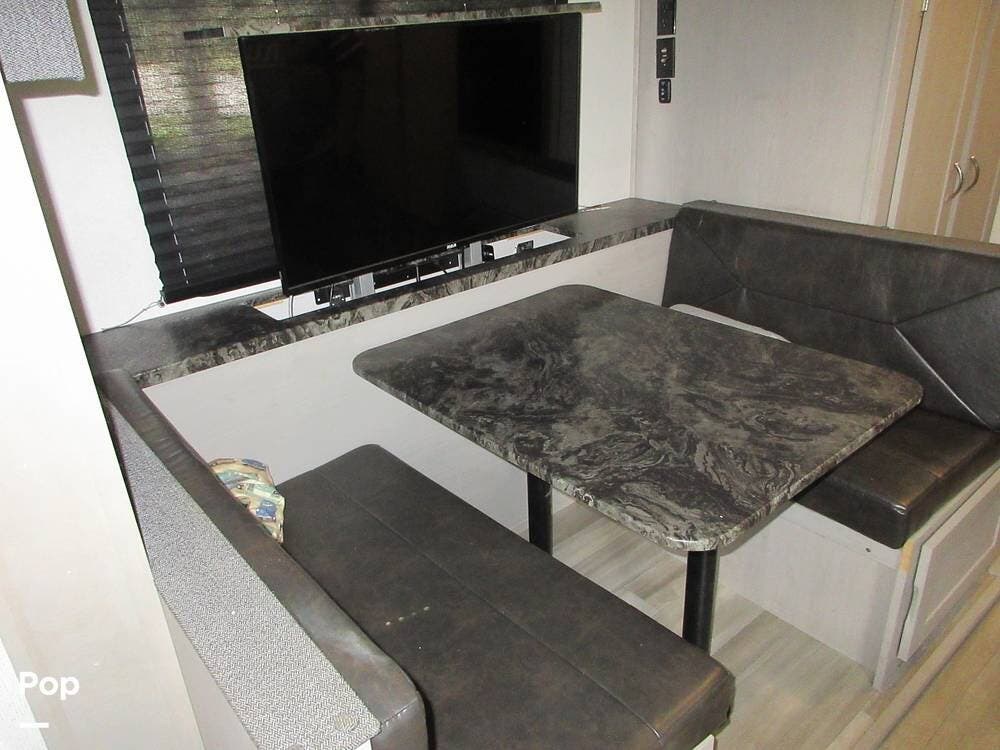 Kick your feet up on the theater seat? Sits directly across from the pop-up LED TV! Has a dinette that converts to another sleeping area.