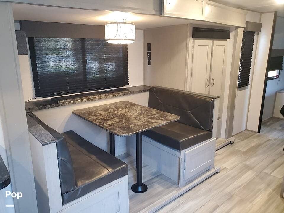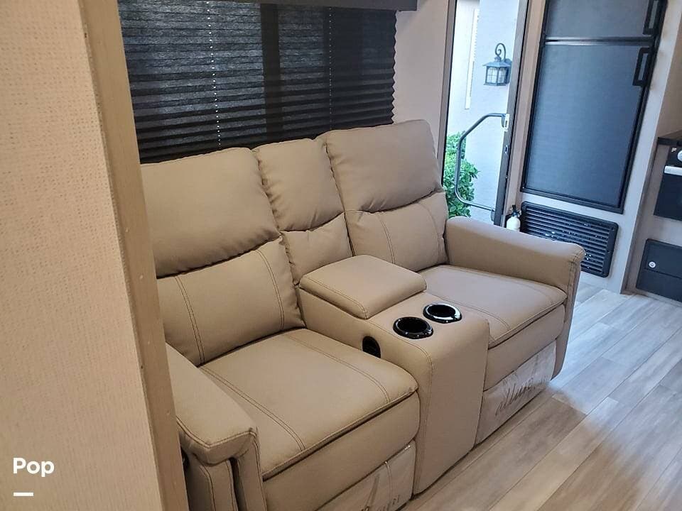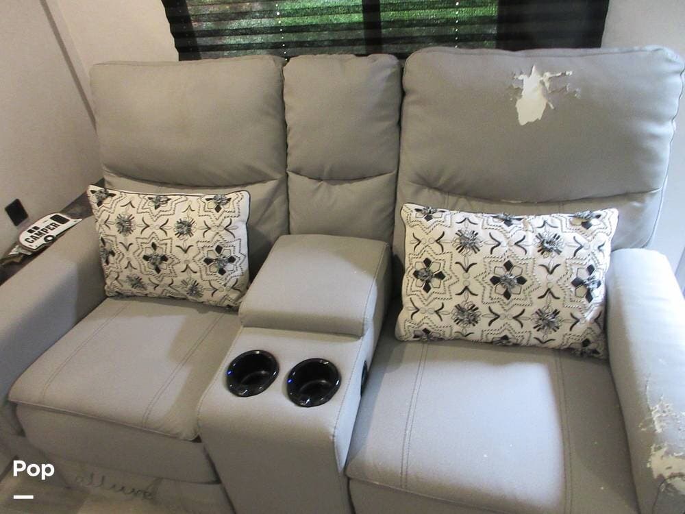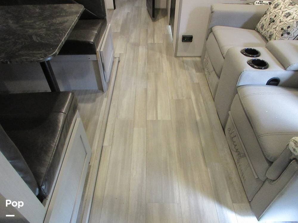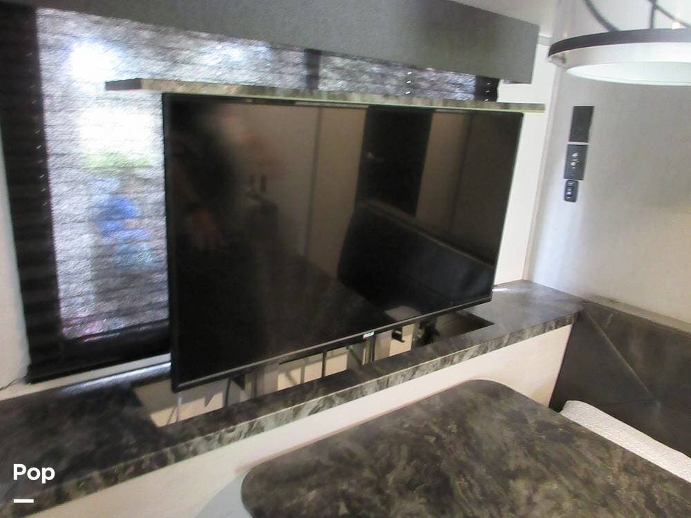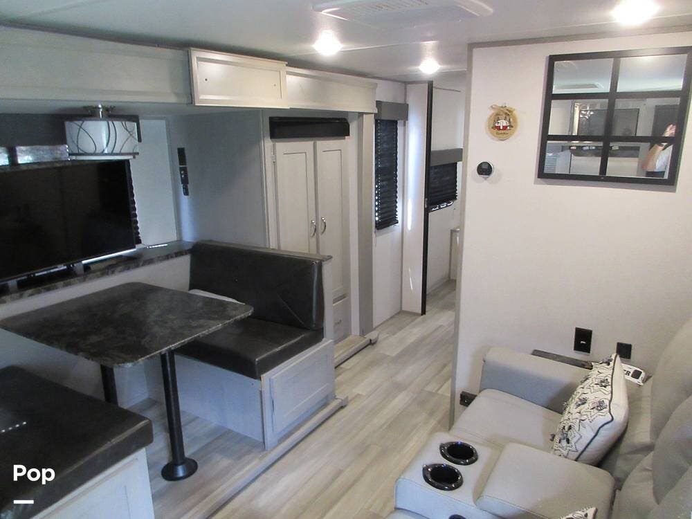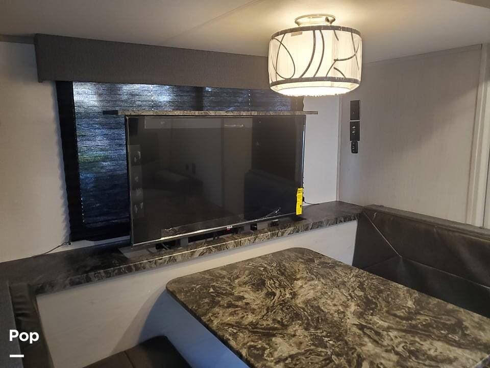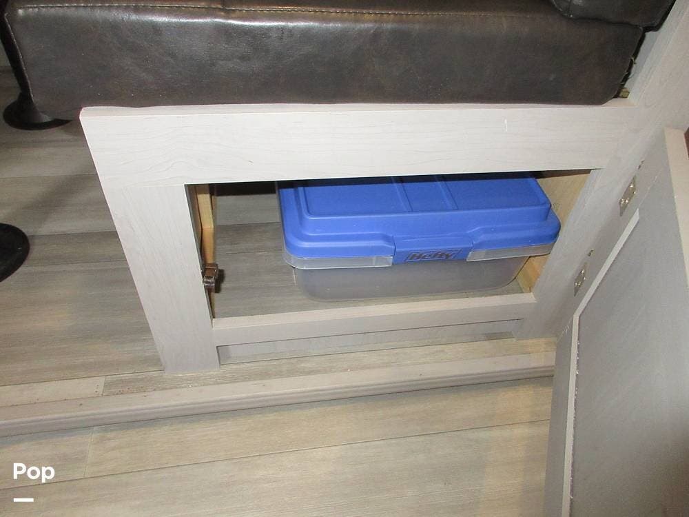 Kick your feet up on the theater seat? Sits directly across from the pop-up LED TV! Has a dinette that converts to another sleeping area.