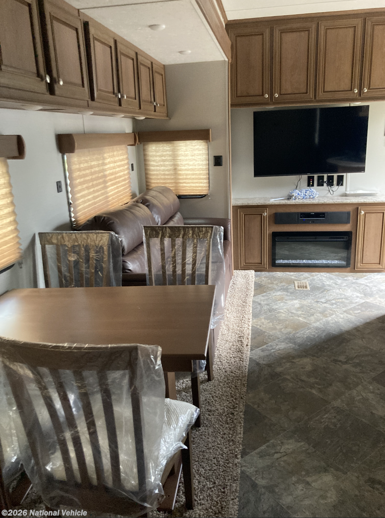 The main living area is highlighted by 8-foot tall ceilings and 7-foot slide-outs, creating an airy, residential feel enhanced by elegant faux marble countertops, two ceiling fans, and a built-in fireplace with remote for cozy evenings. The living space flows effortlessly into the dining area, featuring a dinette with four chairs and a comfortable tri-fold sofa, ideal for entertaining or relaxing after a long day.