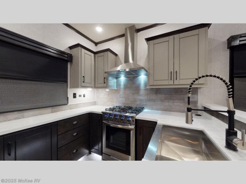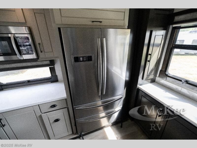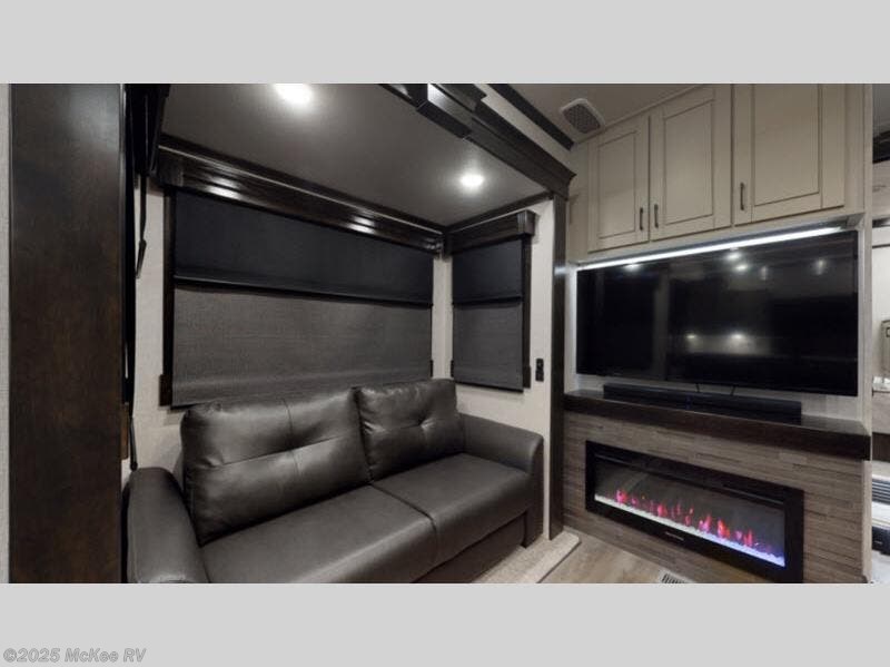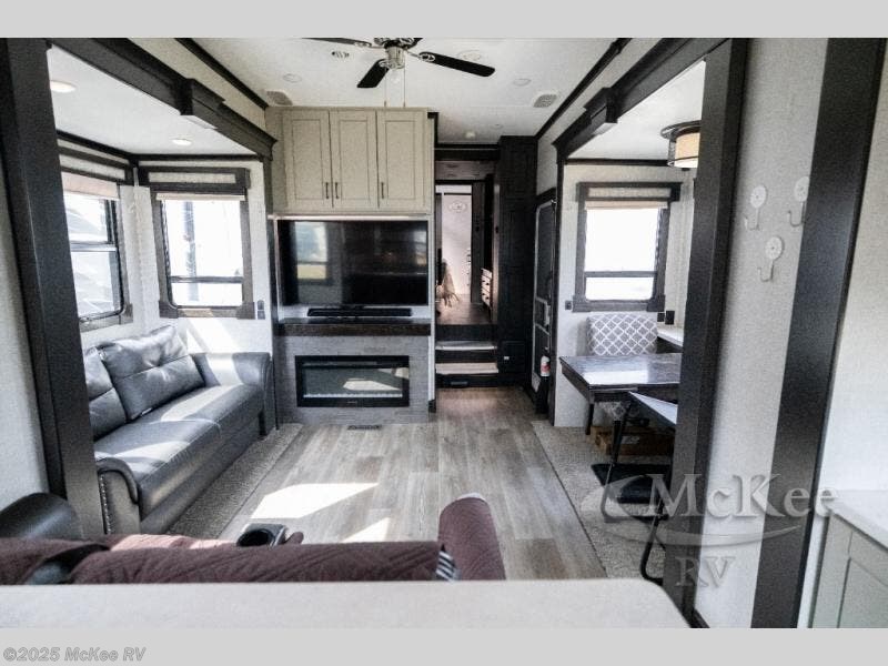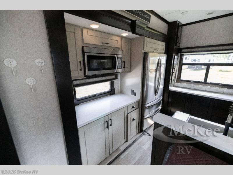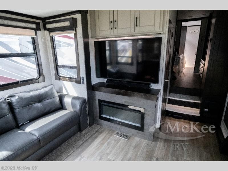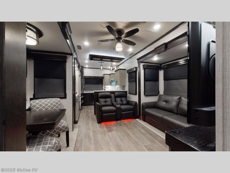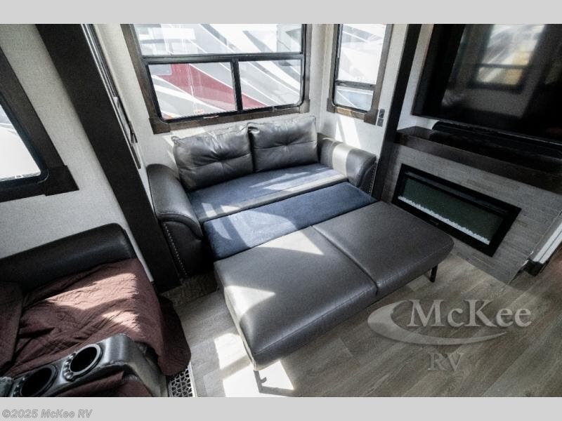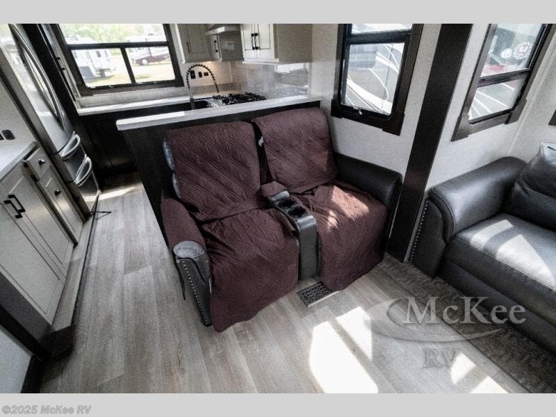 One step inside this fifth wheel and you'll see why it's an award-winning most-popular unit! You'll love the rear kitchen that includes ample counter space and a waterfall edge countertop. Head to the main living area where you can enjoy some family time on the theater seats, and the dinette with chairs will be the perfect place for a game of cards. The half bath is right off of this room for convenience, and your guests or kids can convert the tri-fold sofa into a bed for sleeping space at night. You will love the master bedroom with a king bed slide out, a dresser with a flip-up lid, plus a 39" LED HDTV. The front full bath is spacious, and it includes a large wardrobe where you can even add an optional washer and dryer if you choose!