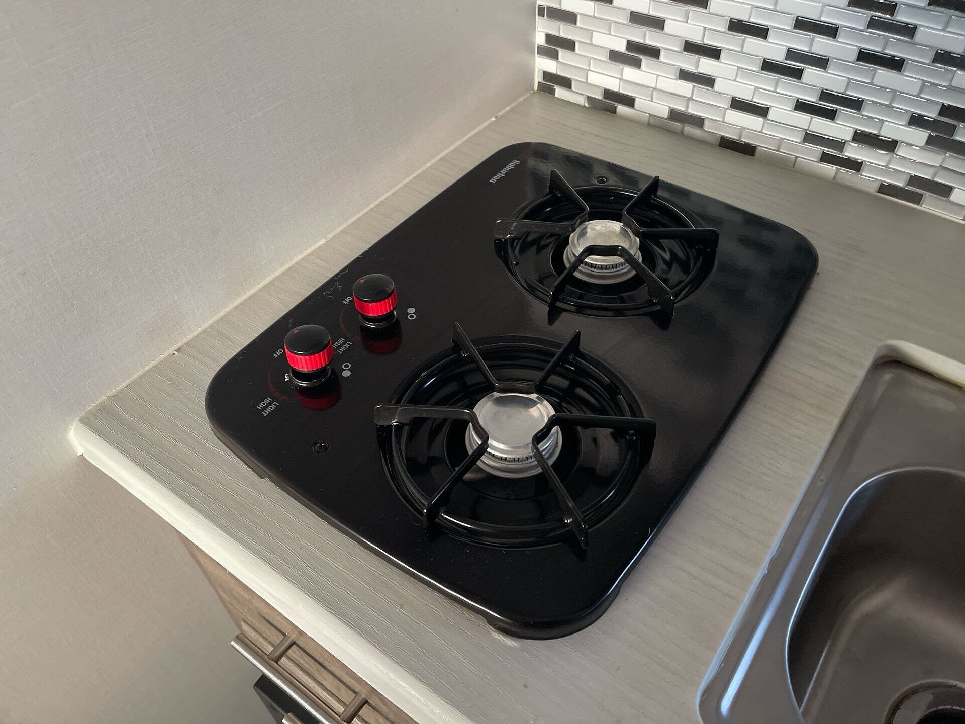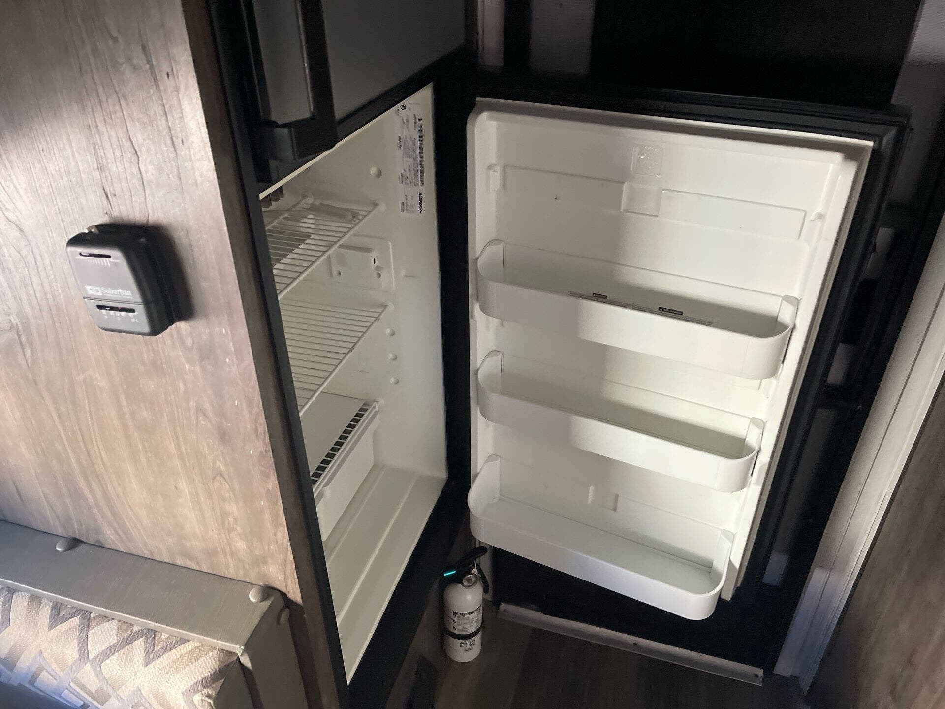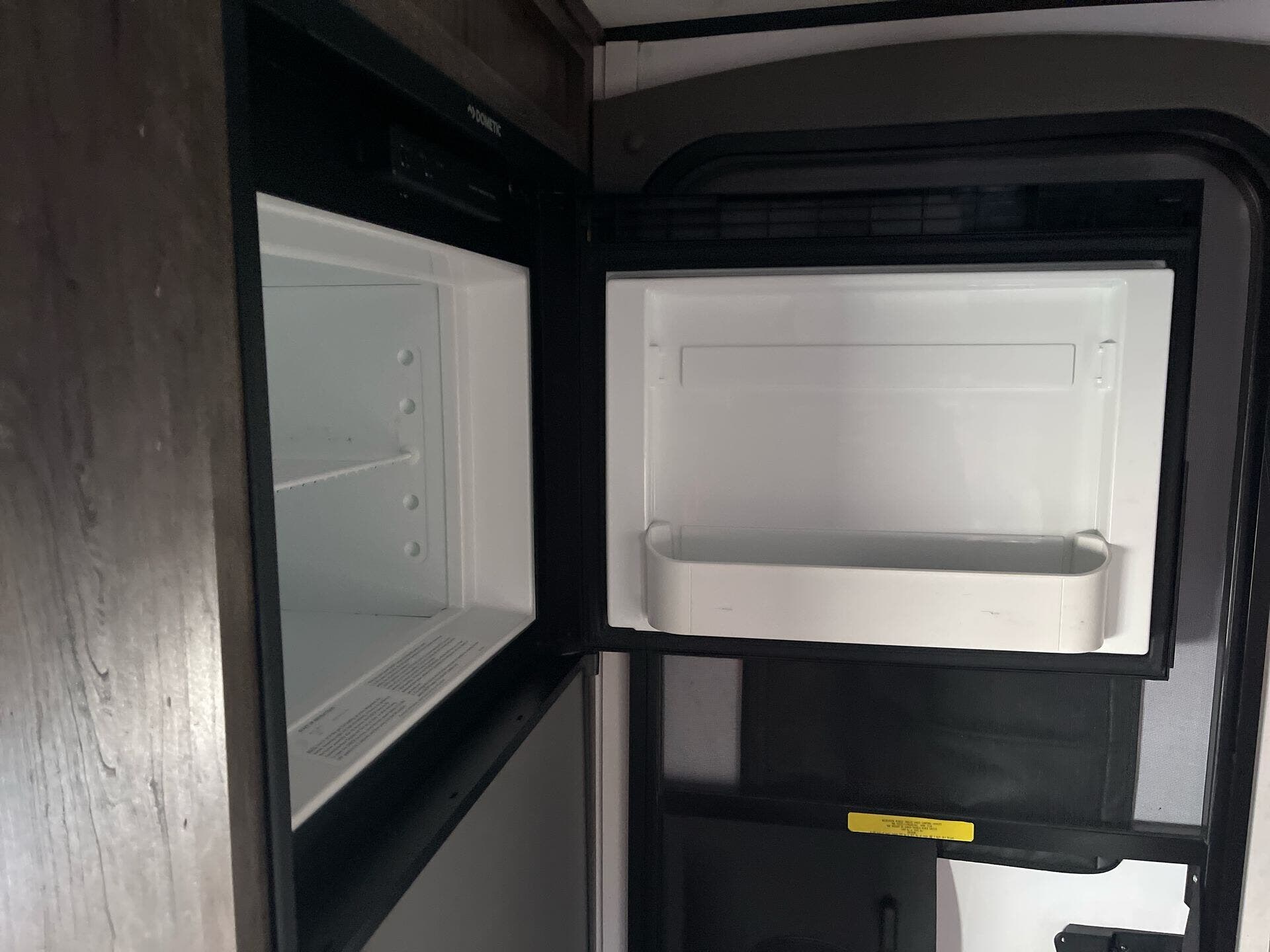 Inside, the Retro’s clever layout maximizes every inch of space. A cozy front bed provides a comfortable sleeping area, while convertible seating/dining space allows you to relax and enjoy meals or play games. The compact galley kitchen includes a two-burner cooktop, sink, refrigerator, and storage cabinets, making it easy to prepare meals on the road. Opposite the kitchen, overhead storage and conveniently placed cubbies help keep gear organized.