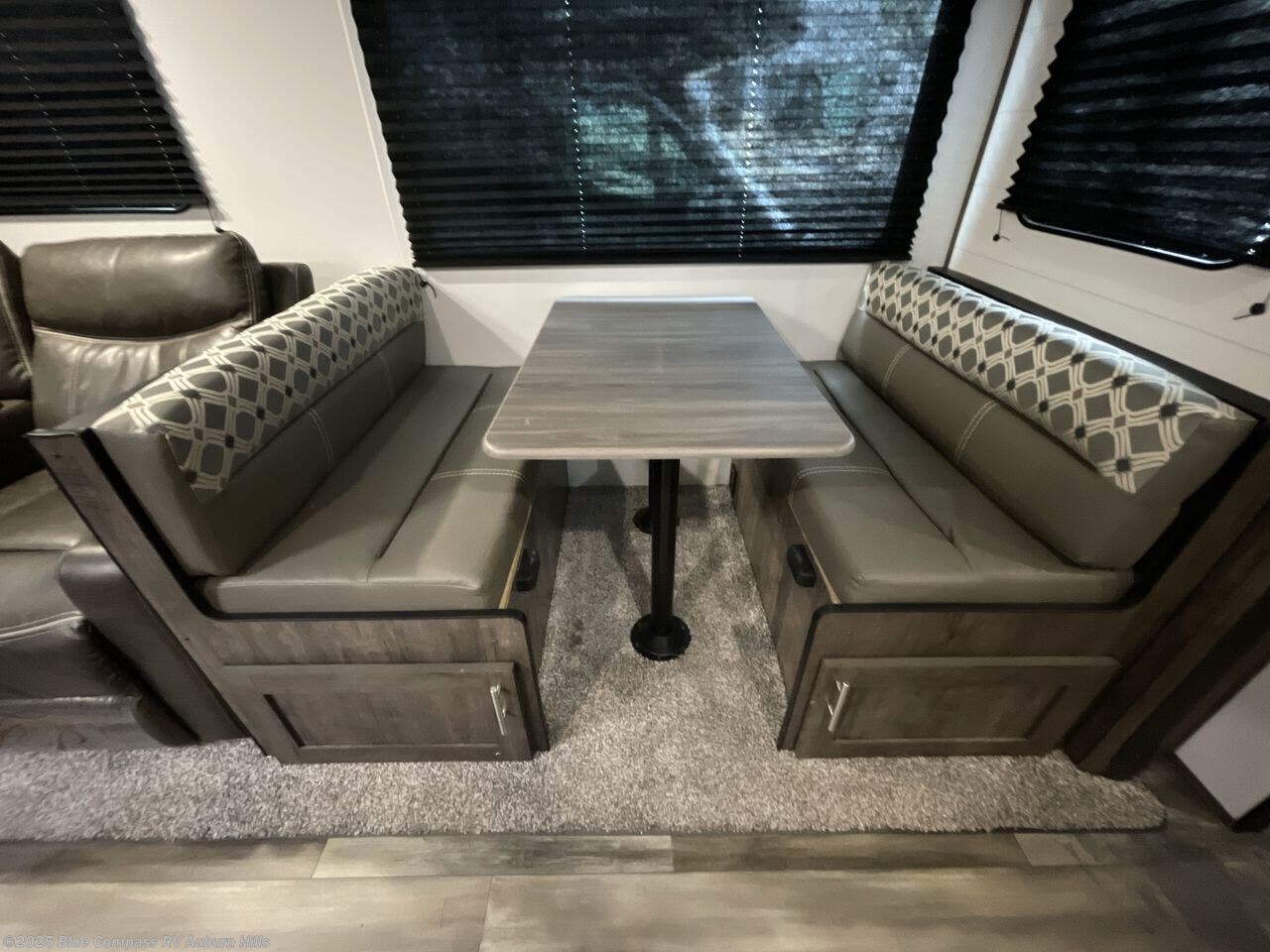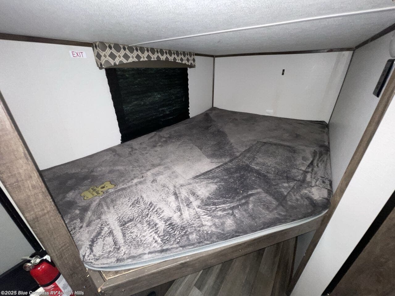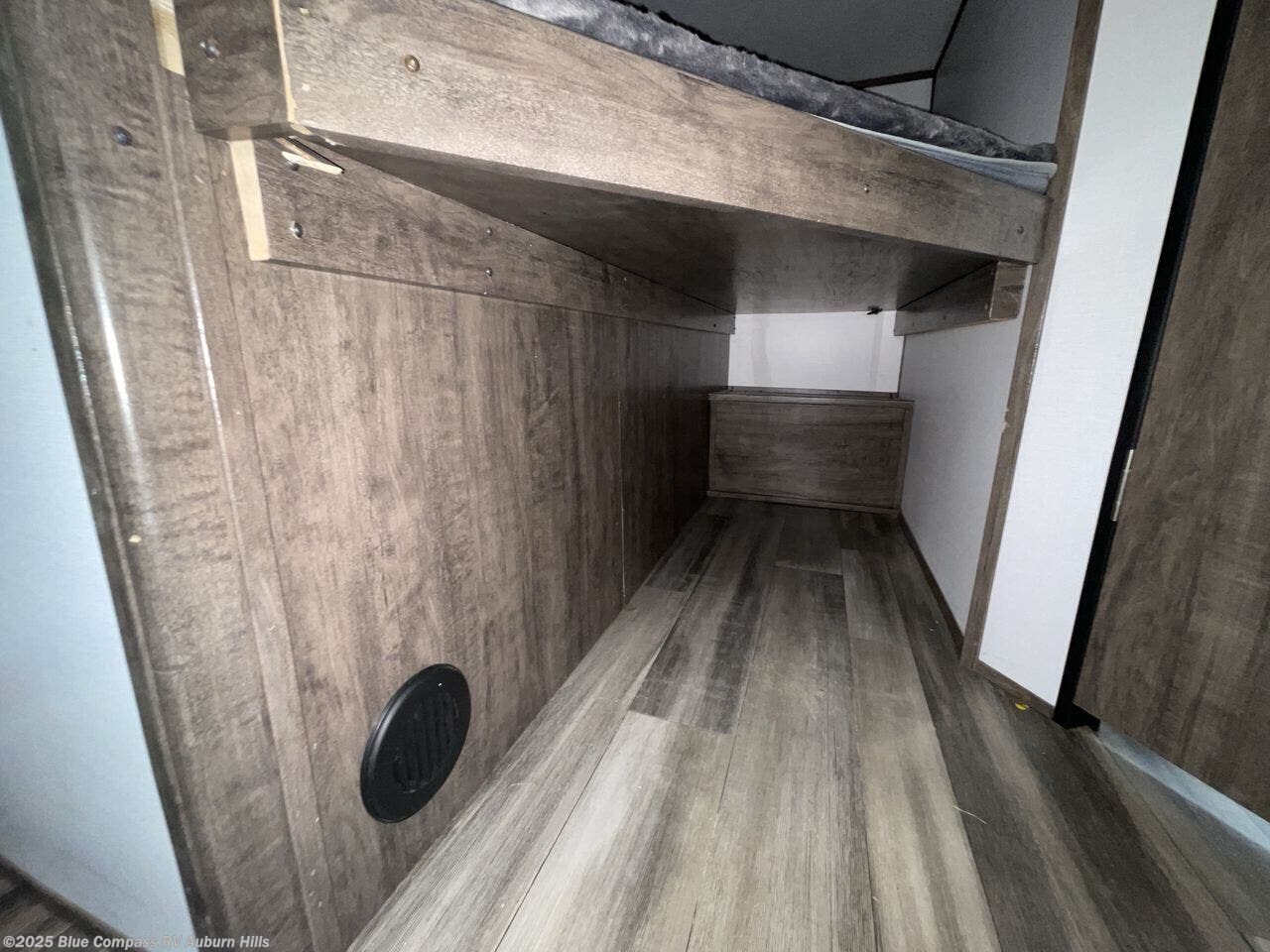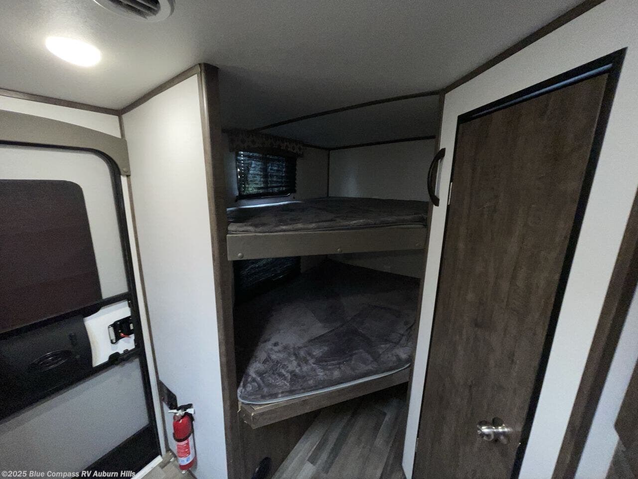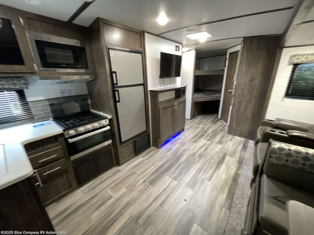 This travel trailer has it all! From the private front bedroom with a queen bed and its own exterior entry door, to the double bunk beds the kids are sure to love! The chef has the option to prepare breakfast inside or outdoors on the outside kitchen. Your family will appreciate the extra space you have thanks to the large slide out, and here you'll find a dinette and a sofa that is perfect for meal times, playing a game of cards, and additional sleeping space. This travel trailer also features a rear corner bath with a tub/shower combo that will make bath time for the little ones easier than ever.