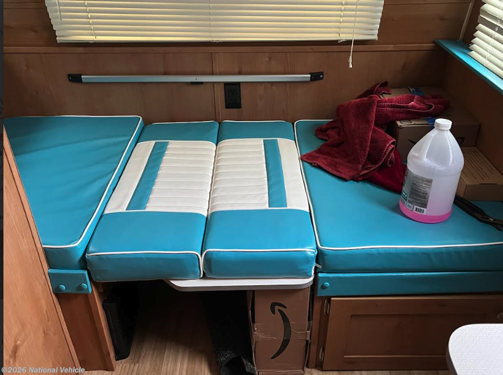 Step inside to discover a bright, inviting interior accented by retro-inspired finishes and modern amenities. The smart floorplan maximizes space, offering comfortable sleeping accommodations, a functional kitchenette, and a cozy dinette perfect for meals, relaxing, or planning the next adventure.