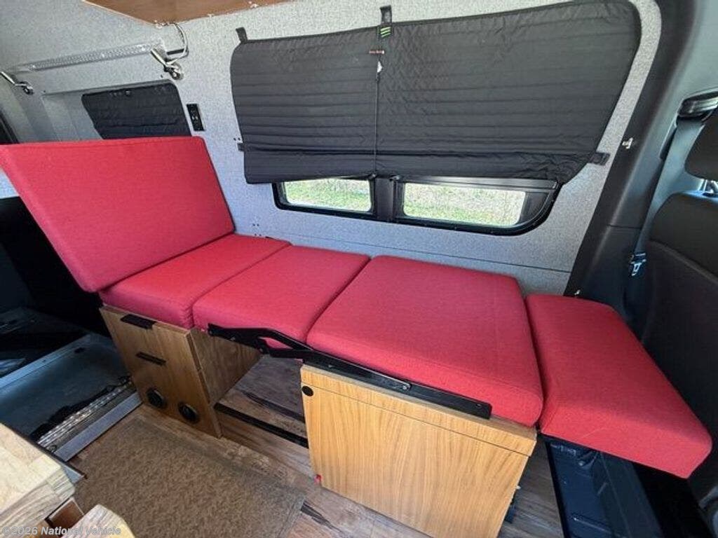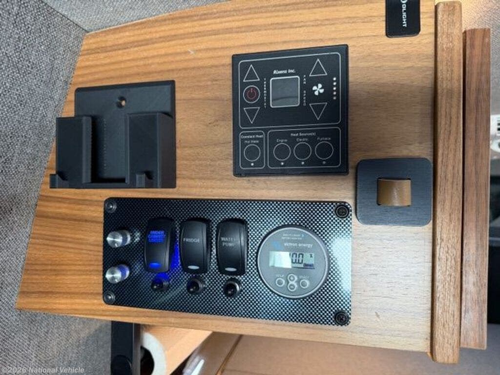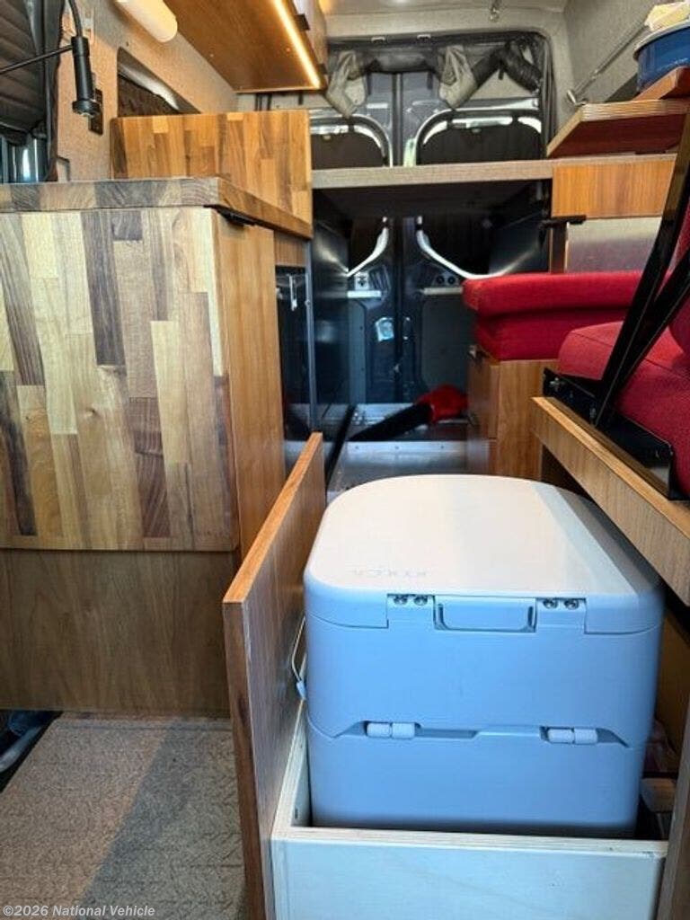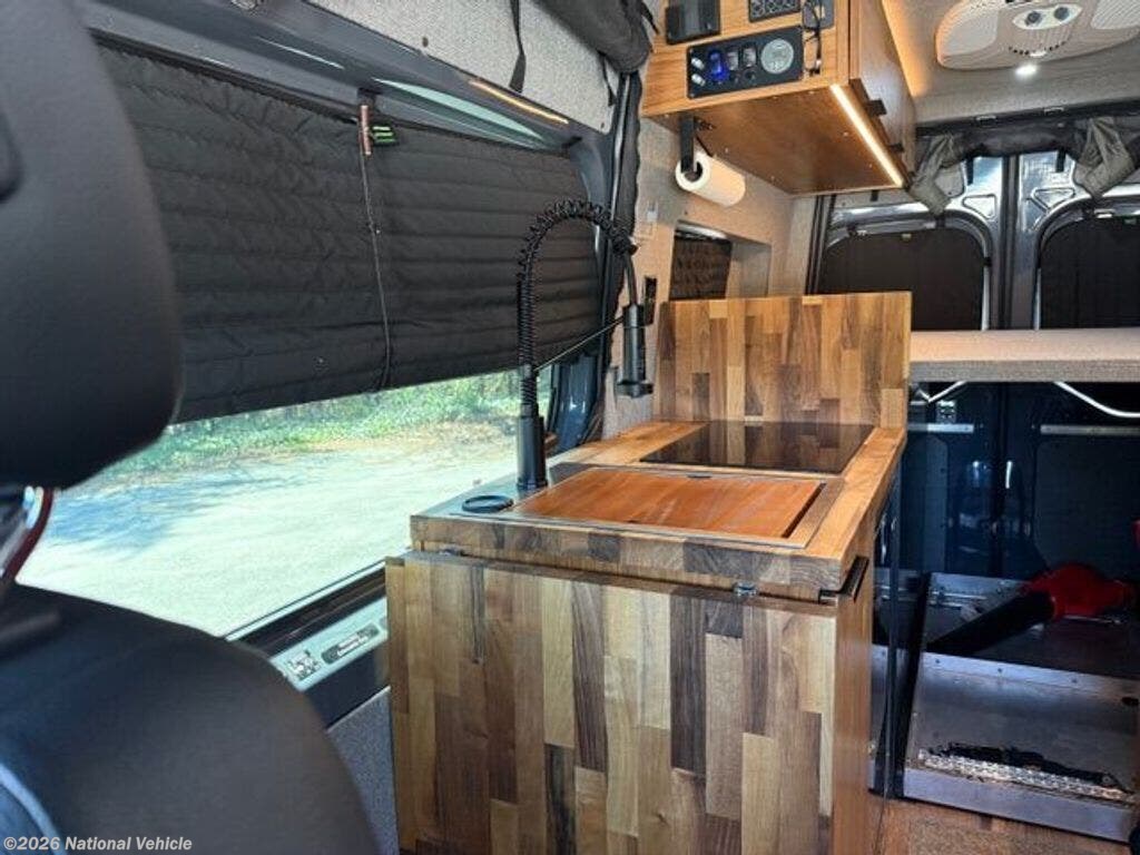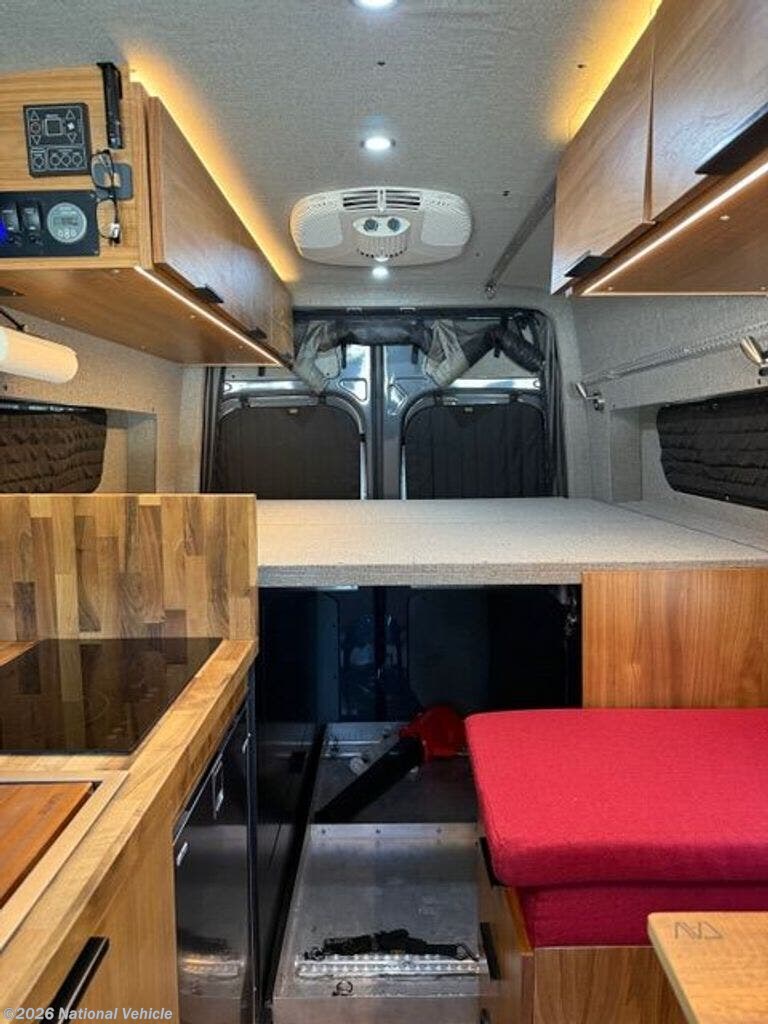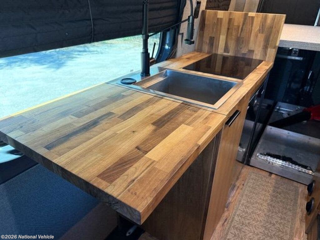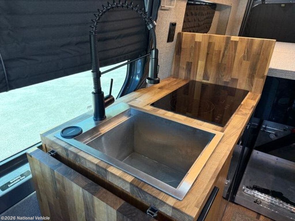 40-gallon fresh water tank, 7-gallon grey tank, stainless sink with sprayer, 2-burner induction cooktop, 4.6 cu ft Isotherm DC fridge (drawer style), Rixen diesel heat + hot water, Dometic A/C, MaxxAir fan, soft cab partition, window coverings, and magnetic bug screens. Optional Porta Potti included (no black tank).