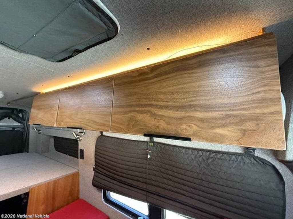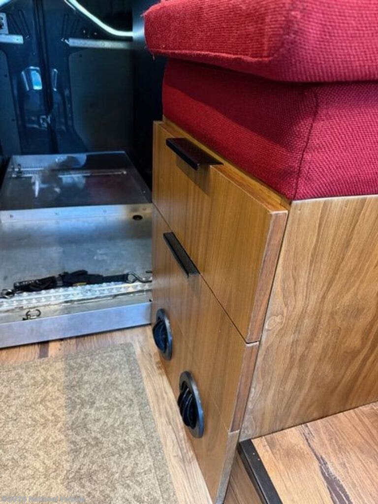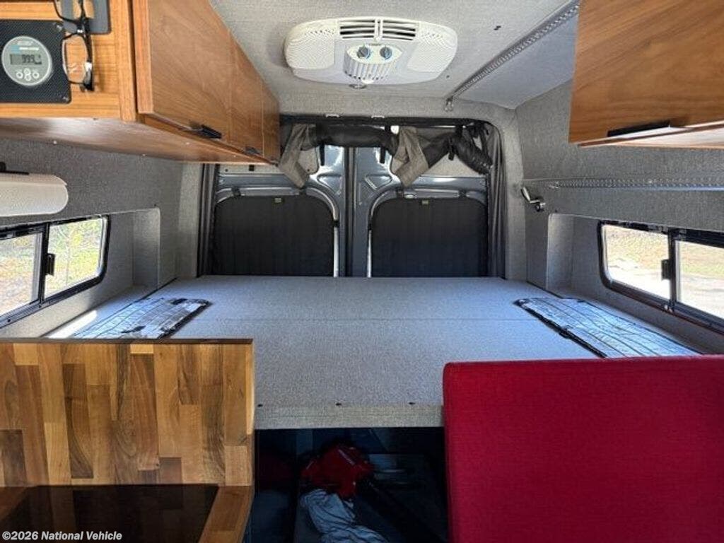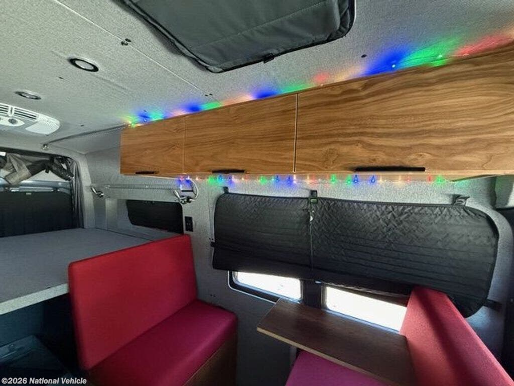 Wool insulation, Duramax fabric walls/ceiling, custom walnut cabinetry with butcher block, and crimson dinette cushions (convert to single bed with seatbelts). L-track throughout, dimmable LED lighting, and large under-bed slide-out for bikes/gear.