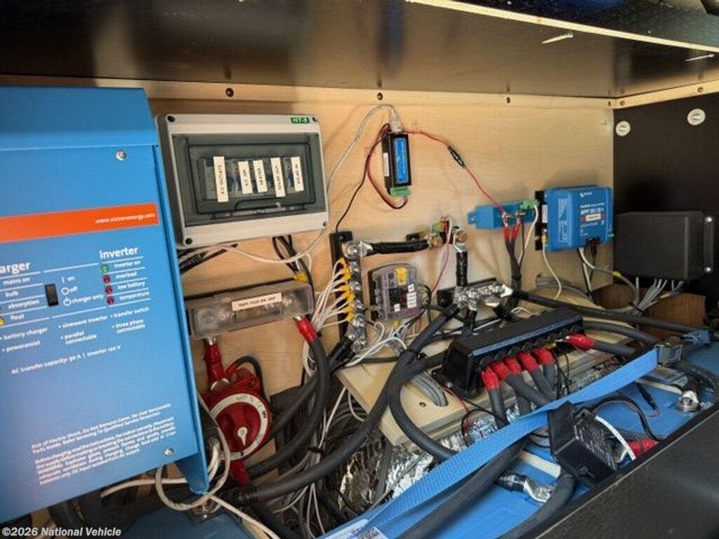 Victron system with 800Ah lithium batteries (heated), 3000W inverter, shore power, 4 AC outlets w/ USB, 200W solar, and dedicated under-hood auxiliary alternator for fast charging.