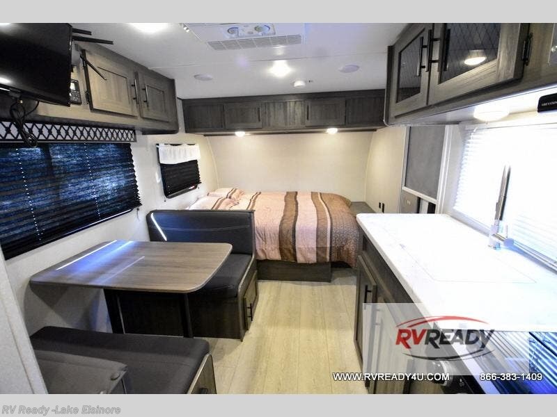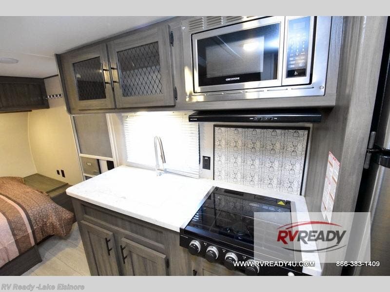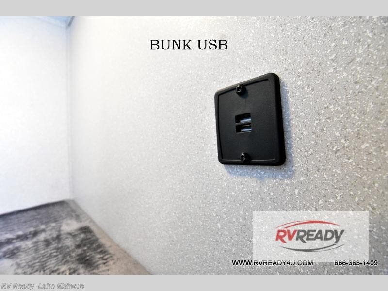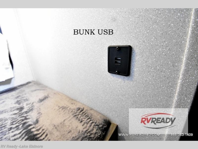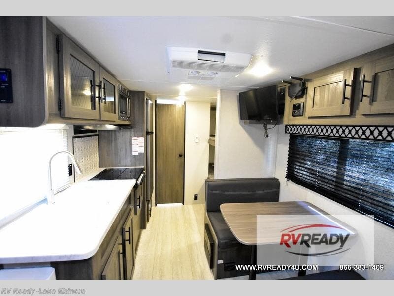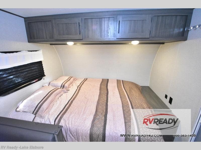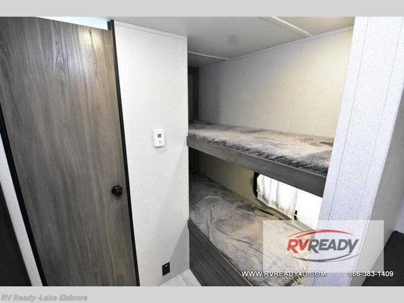 The kids or your friends will love camping in this travel trailer! It features a set of rear corner bunk beds with storage that are next to the full bathroom for easy access at night. There is also a 60" x 74" bed up front with an overhead cabinet, and the booth dinette can also transform into an extra sleeping space, plus it has an overhead entertainment. The kitchen has everything you will need to whip up a home cooked meal, as well as a microwave for those nights when you don't feel like cooking!