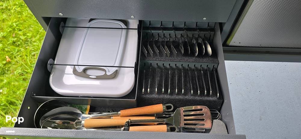 The exterior highlights this camper's readiness for outdoor living. The slide-out kitchen lets you cook under the awning, with a stove, sink, and plenty of storage for food and utensils. The full surround awnings provide extensive shade and shelter space for dining or relaxation. An outdoor shower enclosure lets you freshen up after a day on the trail, adding a nice touch of home-like convenience in the wilderness.